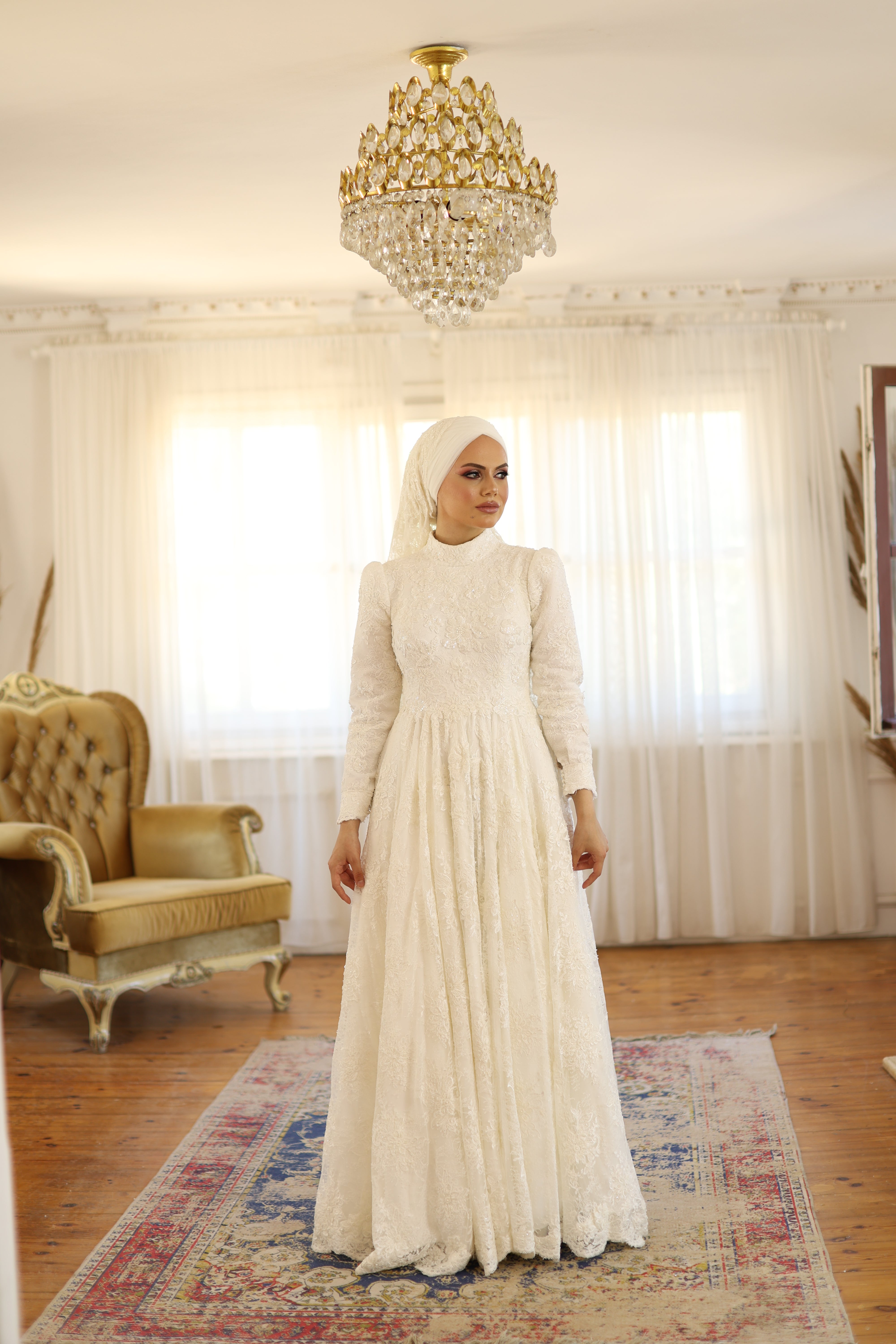 A refined and graceful bridal gown crafted from jacquard textured fabric with soft floral embroidery, perfect for brides who seek elegance in simplicity. The dress features a high neckline, long sleeves, and an A-line silhouette that flows effortlessly to the floor. Its modest design paired with a matching hijab brings a timeless and serene beauty, making it ideal for wedding ceremonies, engagements, henna nights, or nikah celebrations.