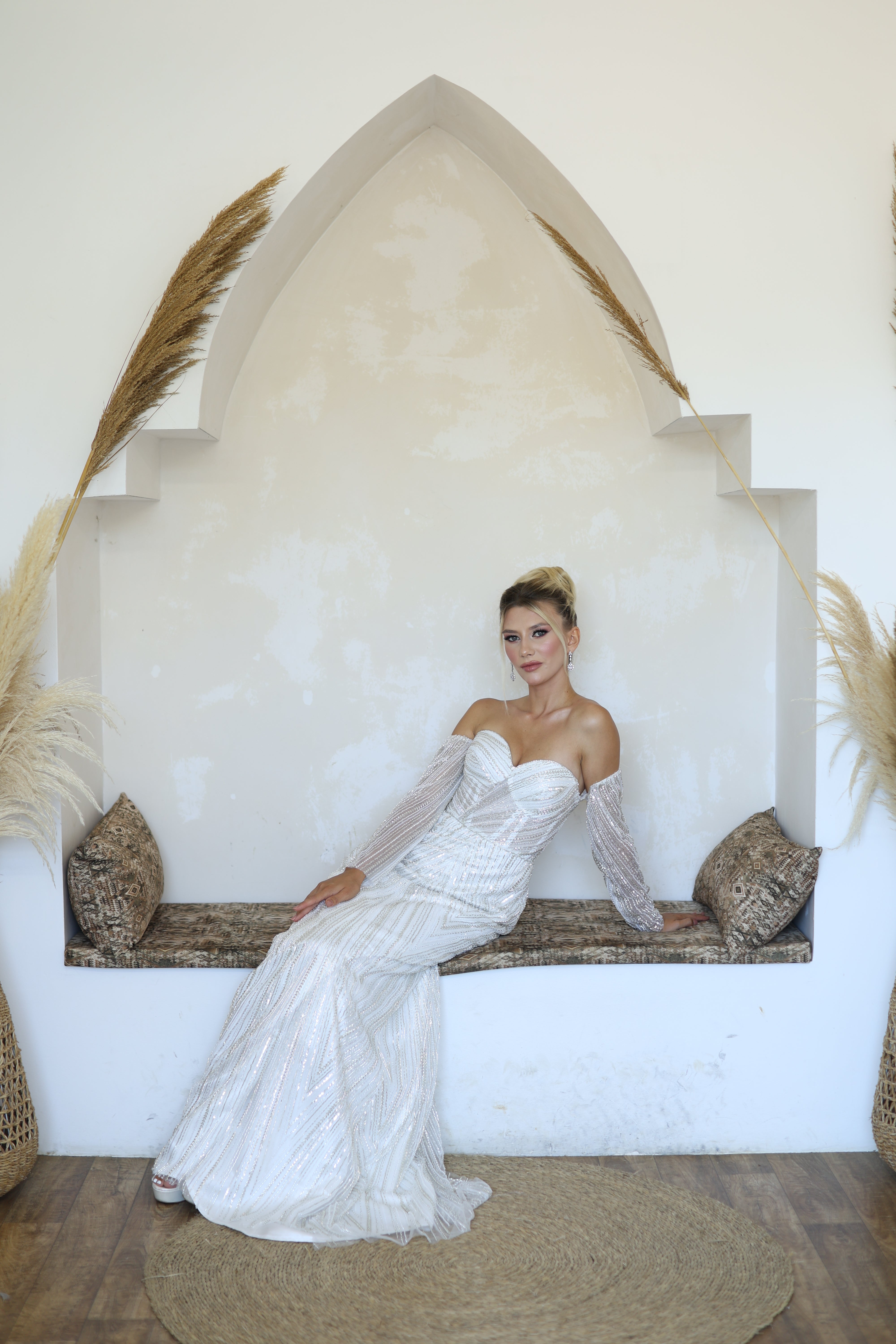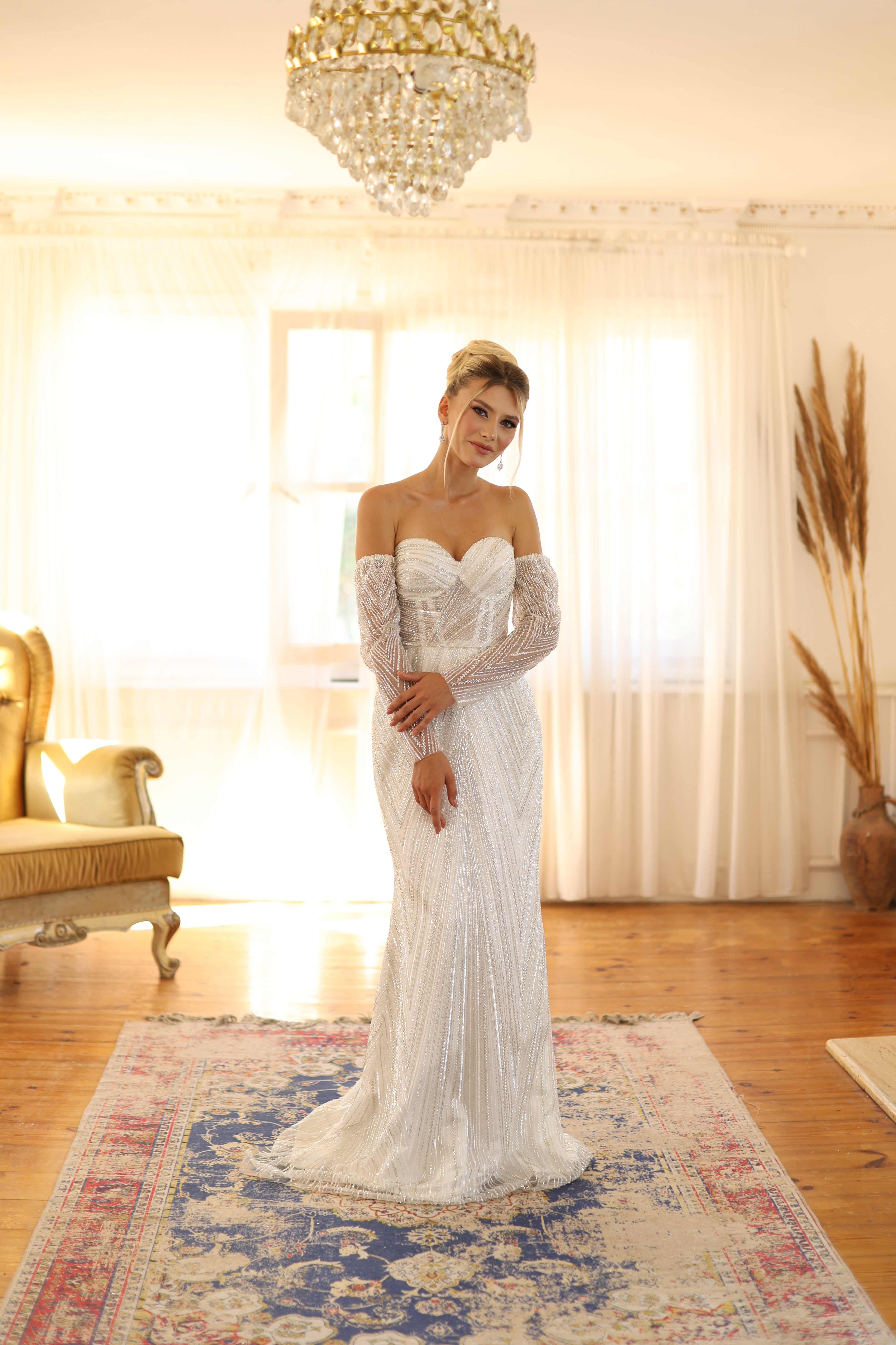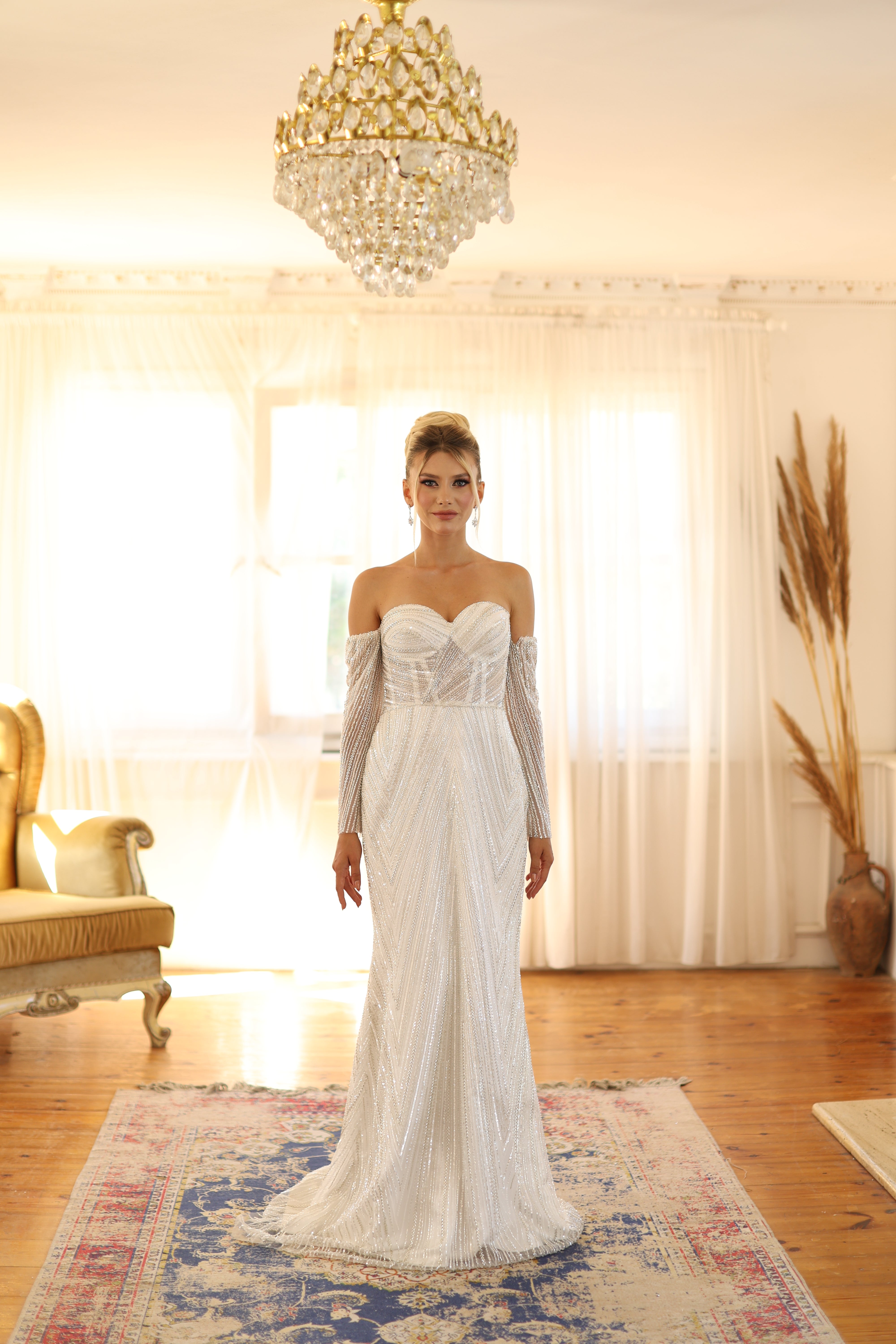 A sophisticated modern bridal gown crafted for the bride who seeks both glamour and grace. Featuring a sweetheart neckline with detachable off-shoulder sequin sleeves, this fit-and-flare sheath design gently hugs the silhouette while the delicate sequin embellishments add radiant sparkle. Ideal for brides looking for contemporary elegance with a touch of timeless charm.