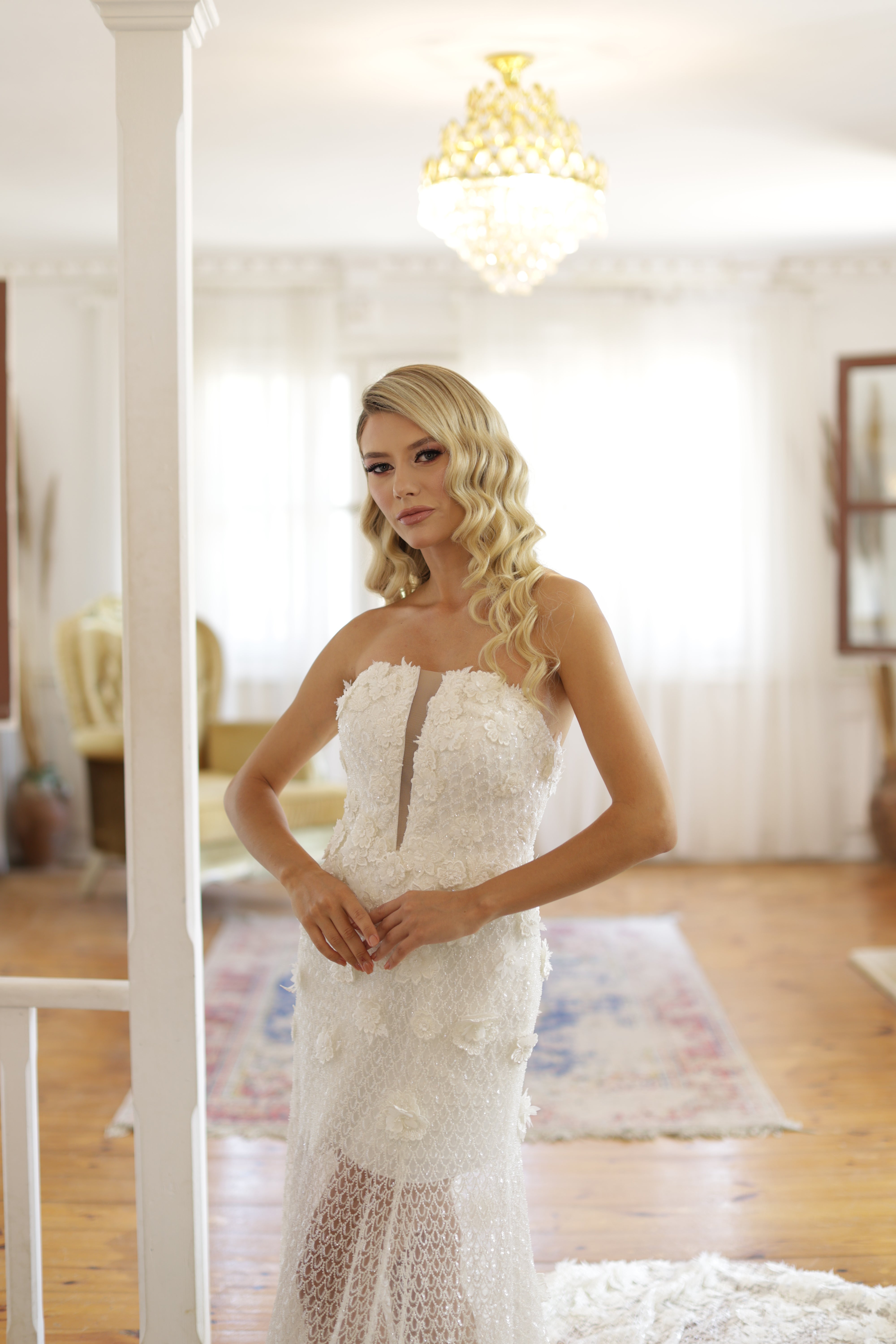 Delicate and romantic, this pure white bridal gown is a true modern fairytale piece. Designed with a strapless sweetheart neckline and deep illusion plunge, the gown showcases intricate lacework, shimmering tulle, and elegant 3D floral appliqués. The fit-and-flare silhouette gracefully extends into a long, dramatic train, offering an ethereal look for brides who seek both elegance and contemporary flair on their wedding day.