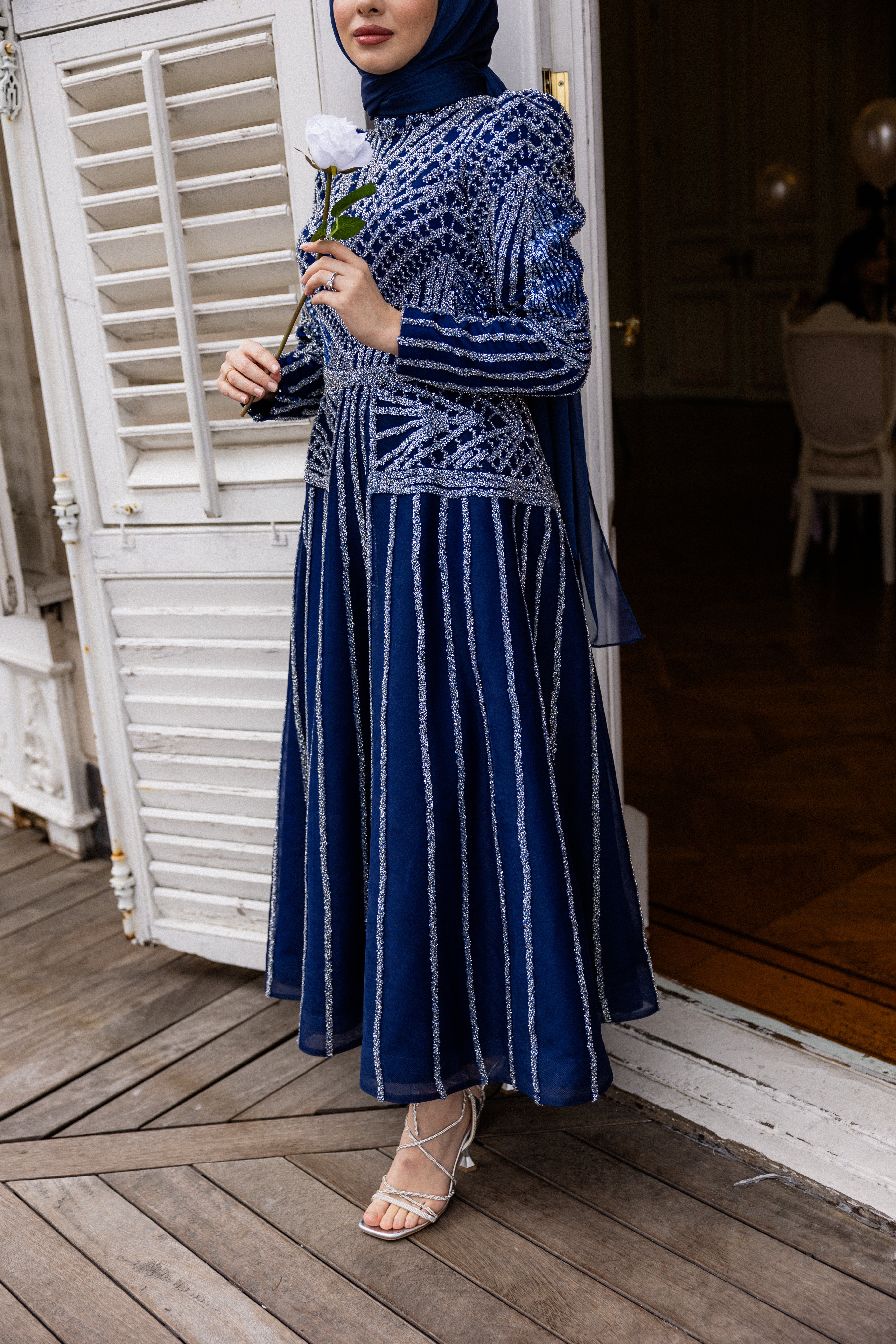 A regal and sophisticated engagement and evening gown in rich royal blue velvet, adorned with striking silver sequin embroidery. The high neckline, puffed shoulders, and A-line silhouette offer a bold yet elegant look, while the linear embellishments enhance the dress’s graceful structure. Ideal for engagement celebrations, galas, or special evening occasions, this design perfectly balances modern glam with classic modesty.
