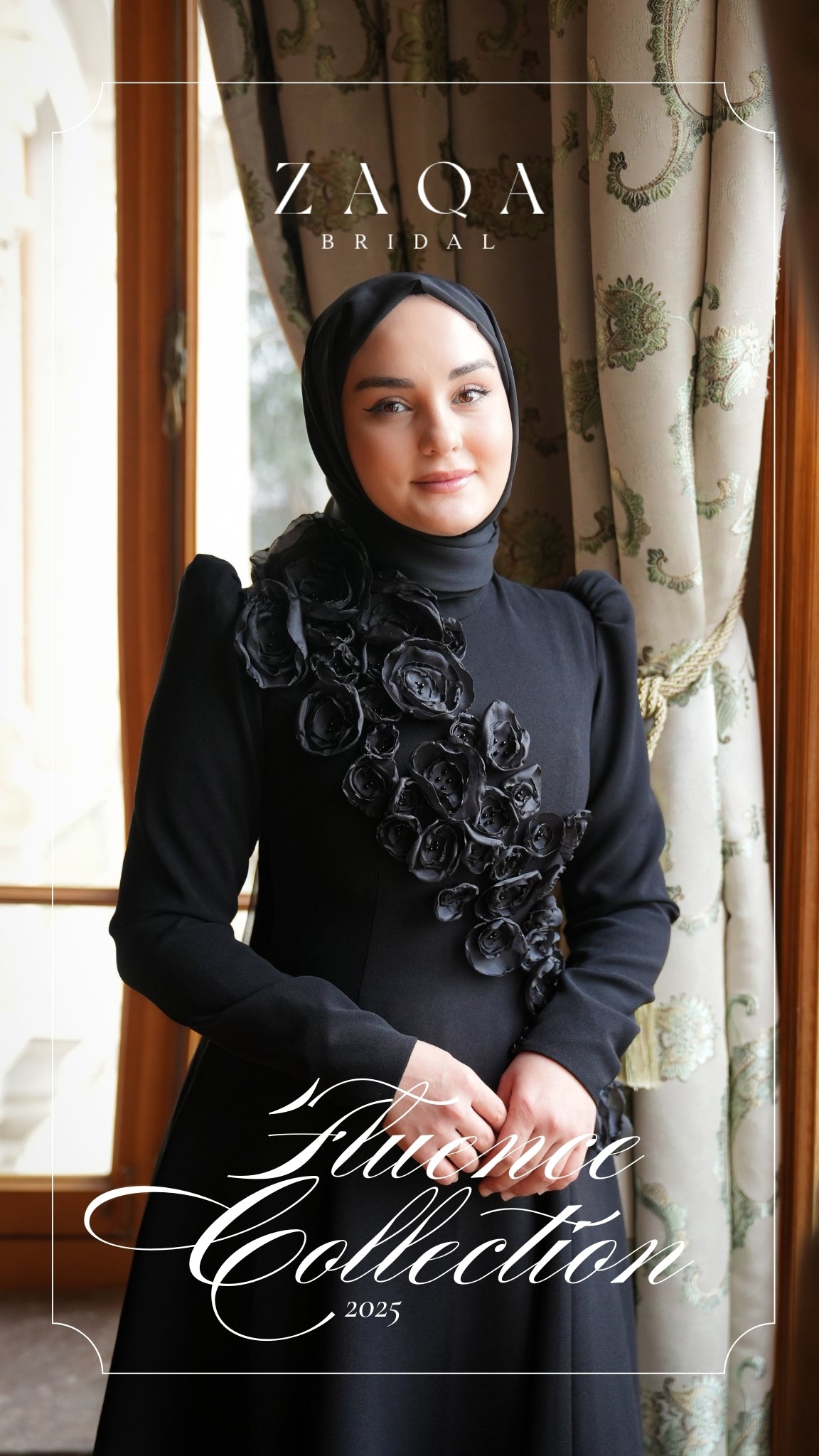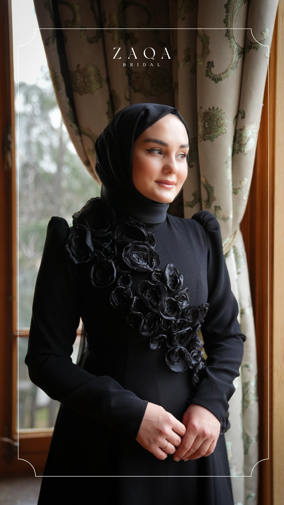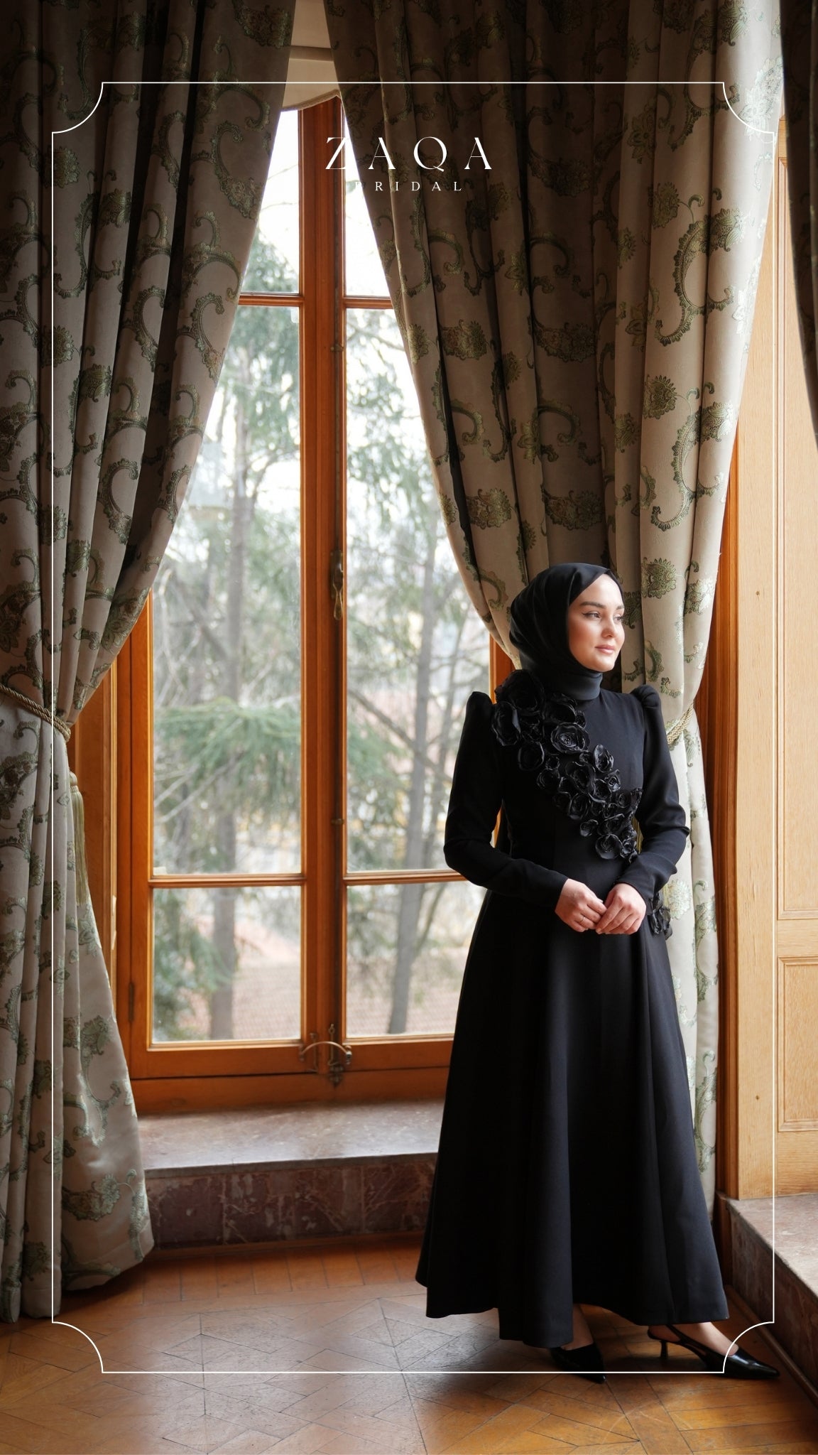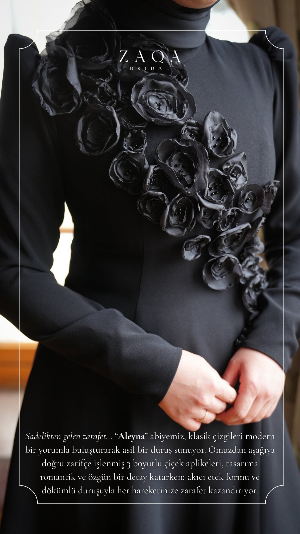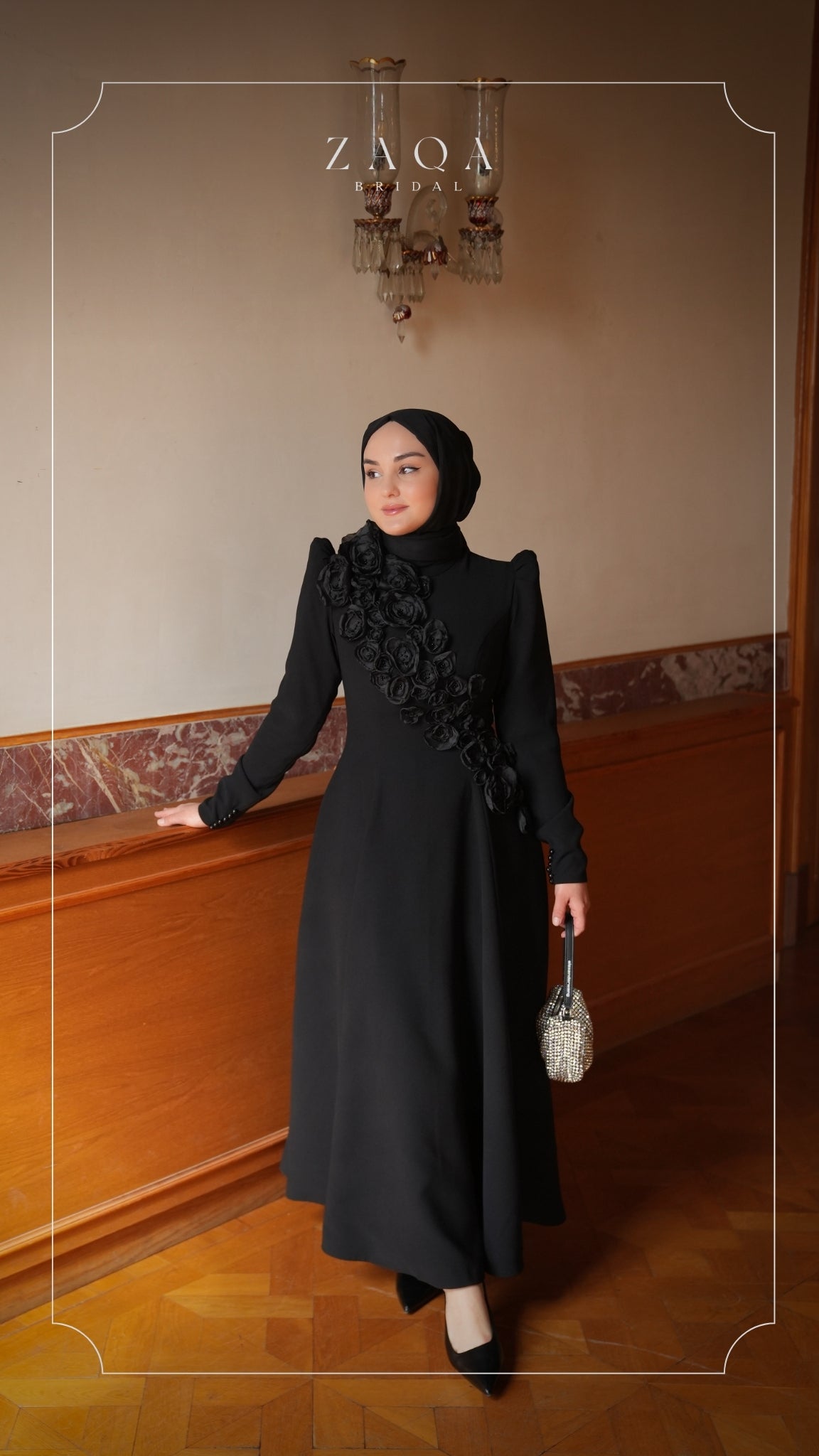 Introducing the “Aleyna” gown — where sculptural florals meet timeless elegance. This refined A-line silhouette in classic black is adorned with a cascade of handcrafted fabric roses, flowing diagonally across the bodice. With its high neckline and long sleeves, “Aleyna” makes a poised and graceful statement for intimate soirées or formal gatherings. A piece that speaks without saying a word.