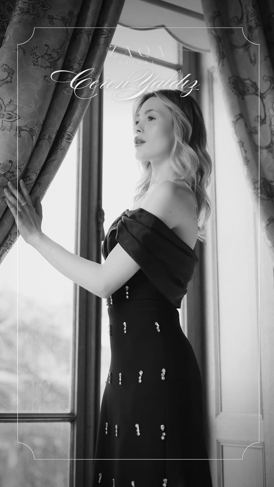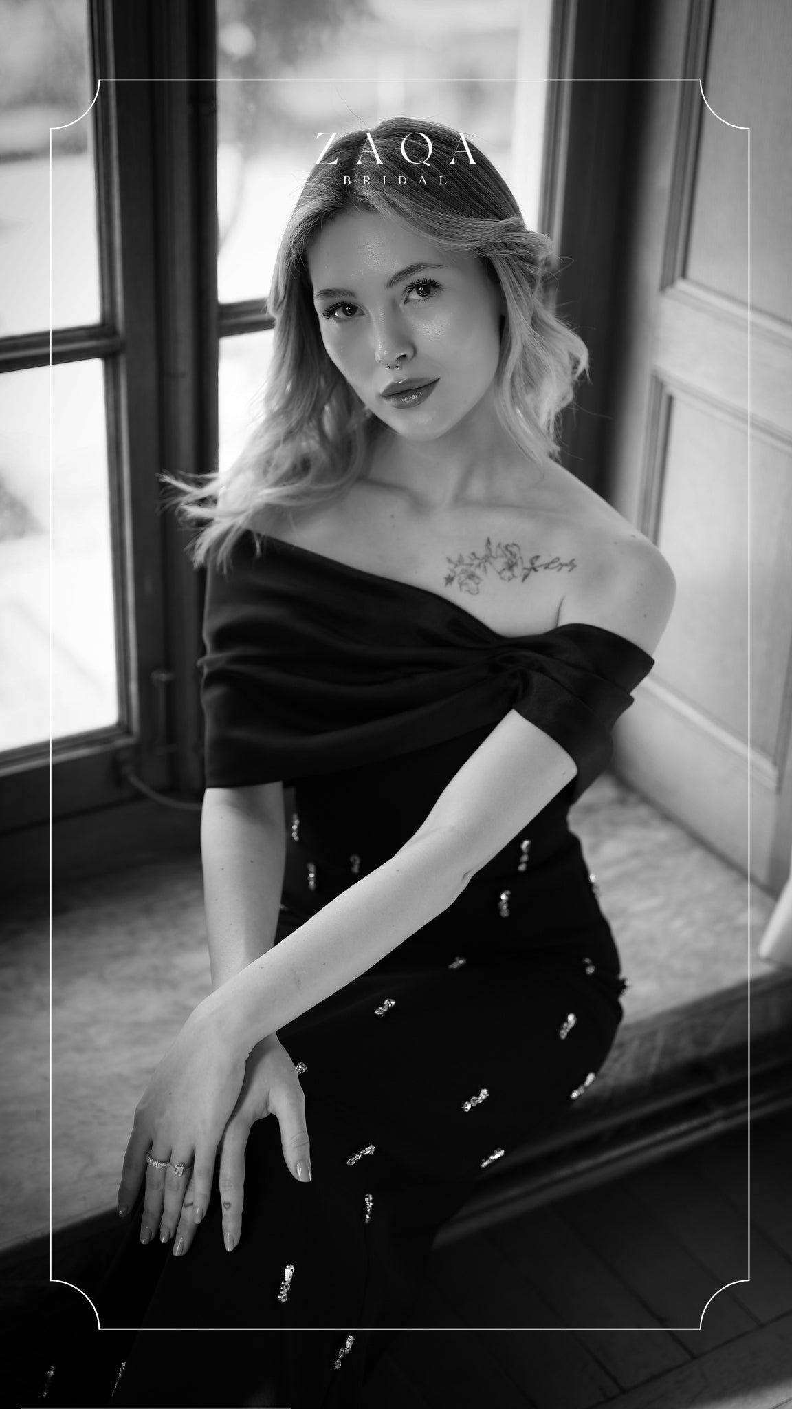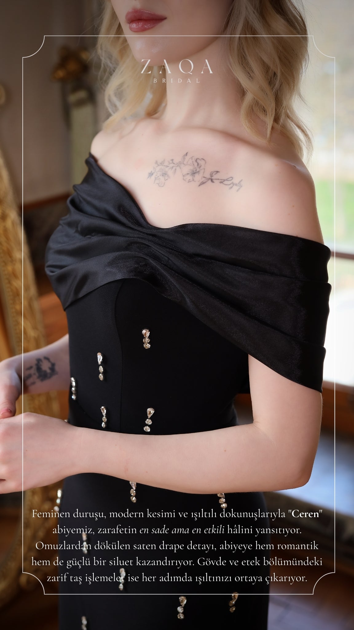 Introducing the “Ceren” gown — a timeless black dress reimagined with modern drama. Featuring a twisted off-shoulder neckline and a column silhouette adorned with vertical pearl accents, this piece balances bold elegance with refined minimalism. The subtle gleam of embellishments mirrors the light, making each movement mesmerizing. An ideal choice for evening affairs that call for sophistication with a twist.
