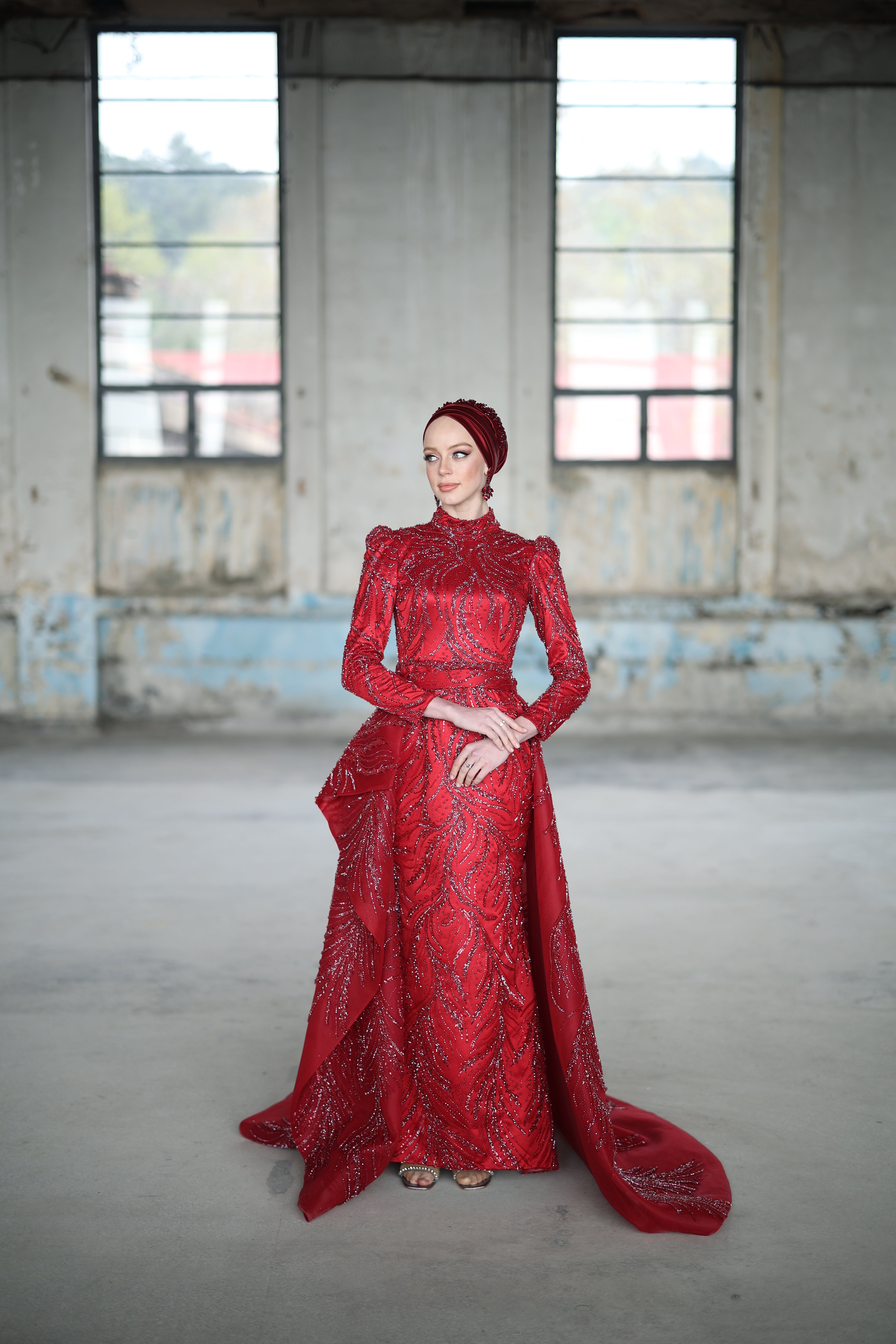 Commanding attention with sculptural elegance, this deep red engagement and evening gown showcases exquisite black sequin embroidery that flows gracefully across the fitted silhouette. Featuring a high neckline, puffed long sleeves, and a dramatic side panel drape with a soft train, this hijab-friendly design is paired with a matching embellished headpiece. Perfect for engagement ceremonies, receptions, or henna nights where bold sophistication meets artistic flair.