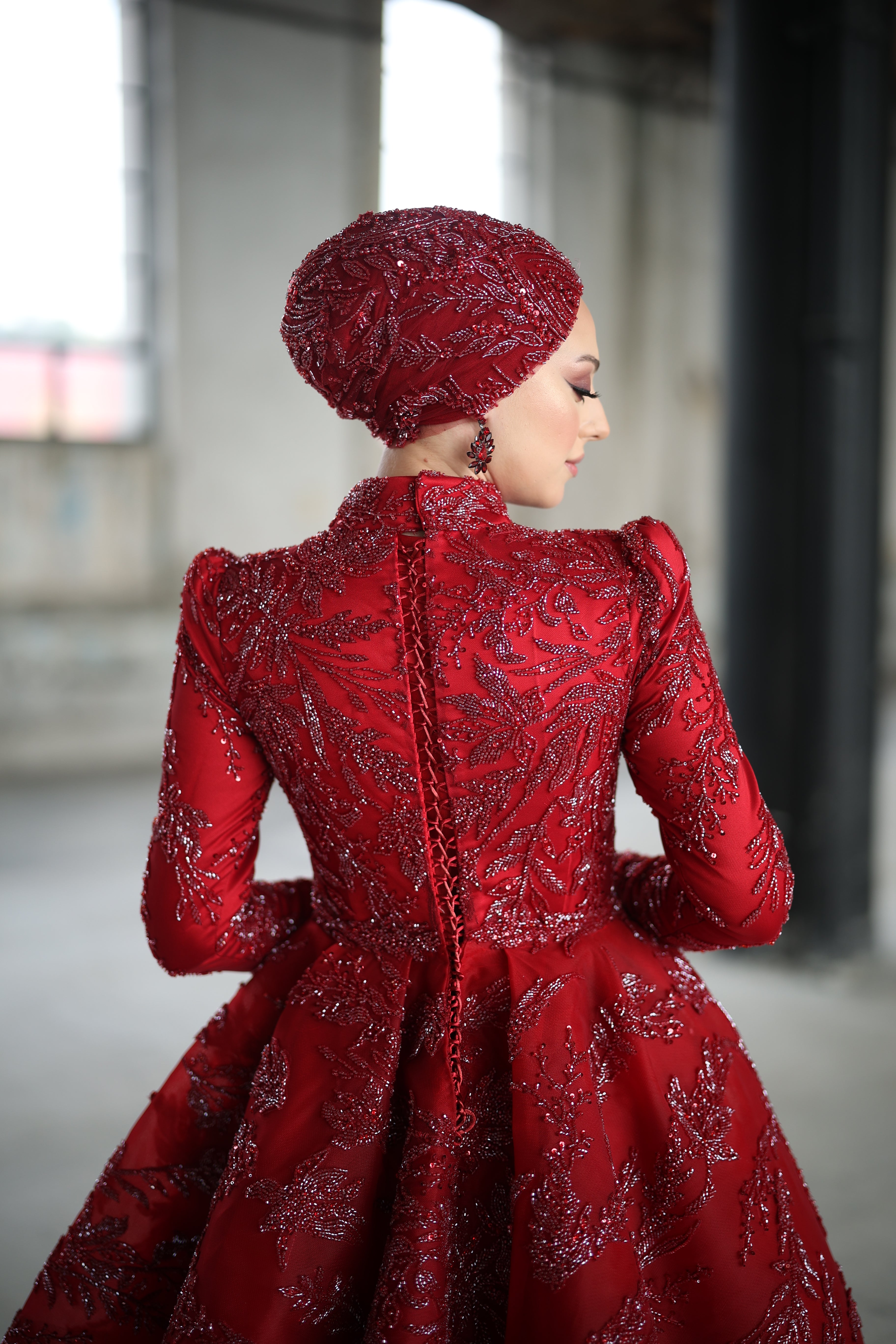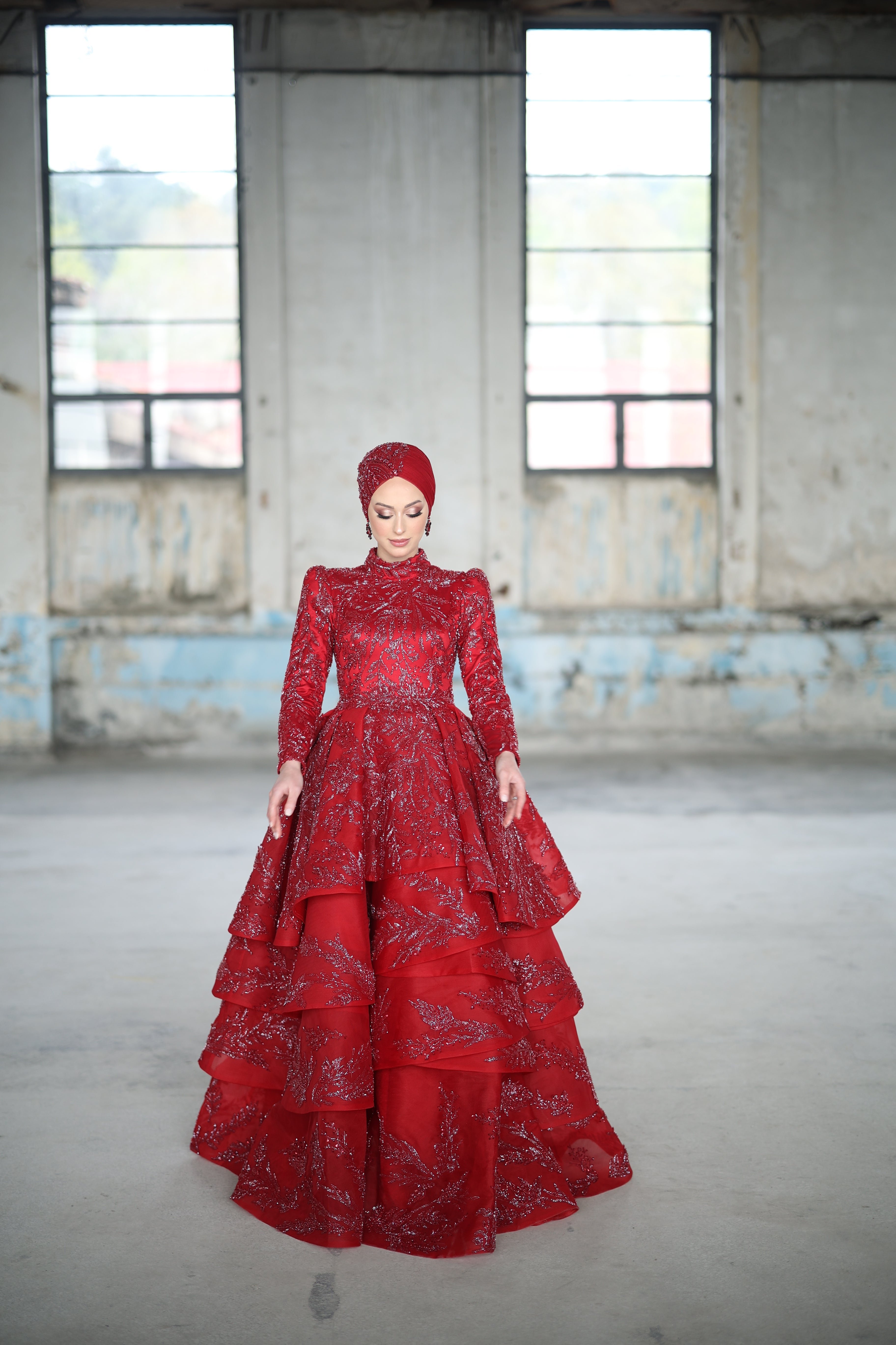 Grand and enchanting, this deep red engagement and evening gown stands out with its luxurious tiered ruffle skirt and intricate silver sequin embroidery. The high neckline and structured long sleeves add elegance to the layered A-line silhouette, while the matching embellished headpiece completes the look. Ideal for engagement nights, henna celebrations, or receptions where majestic presence and modern glamour come together.