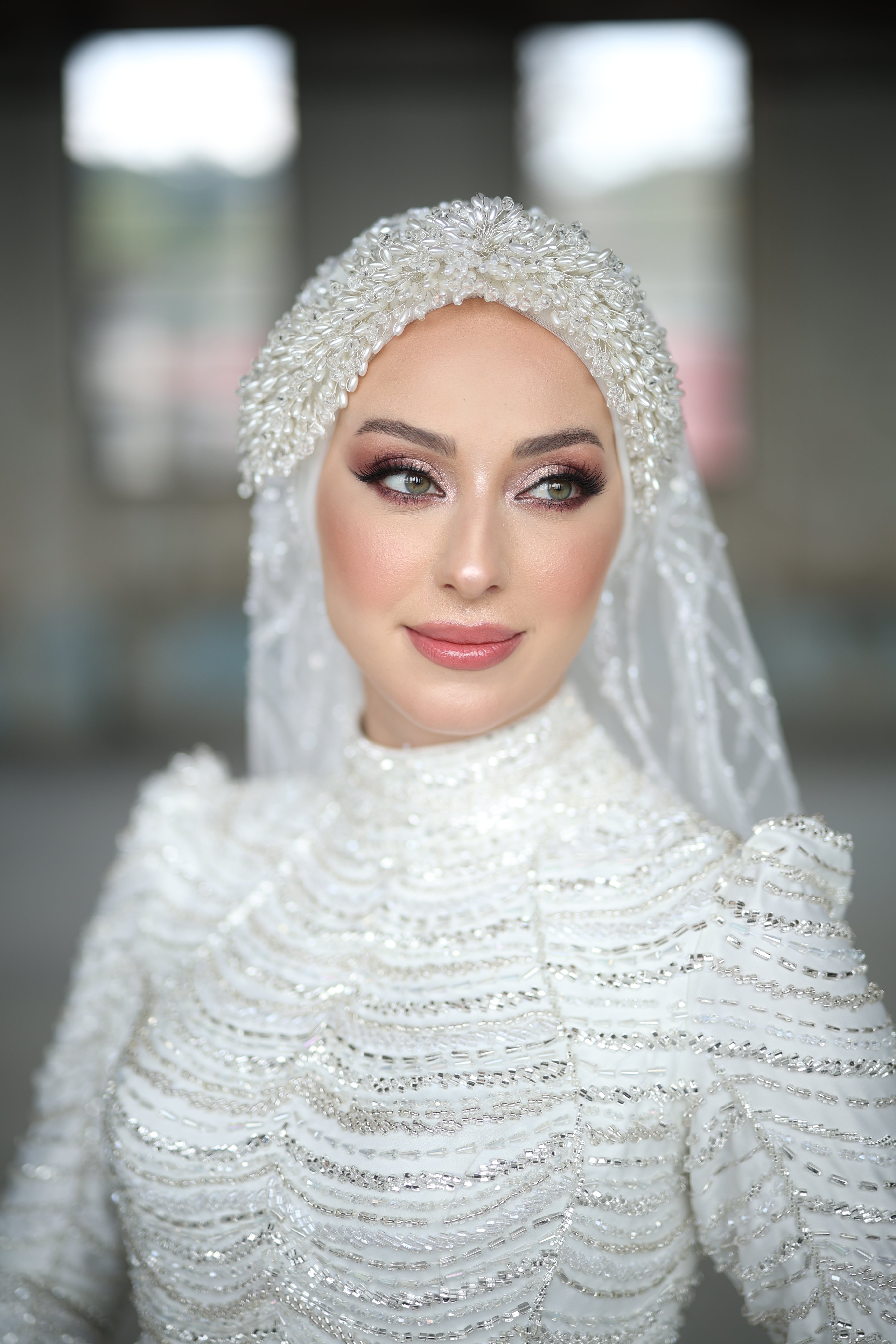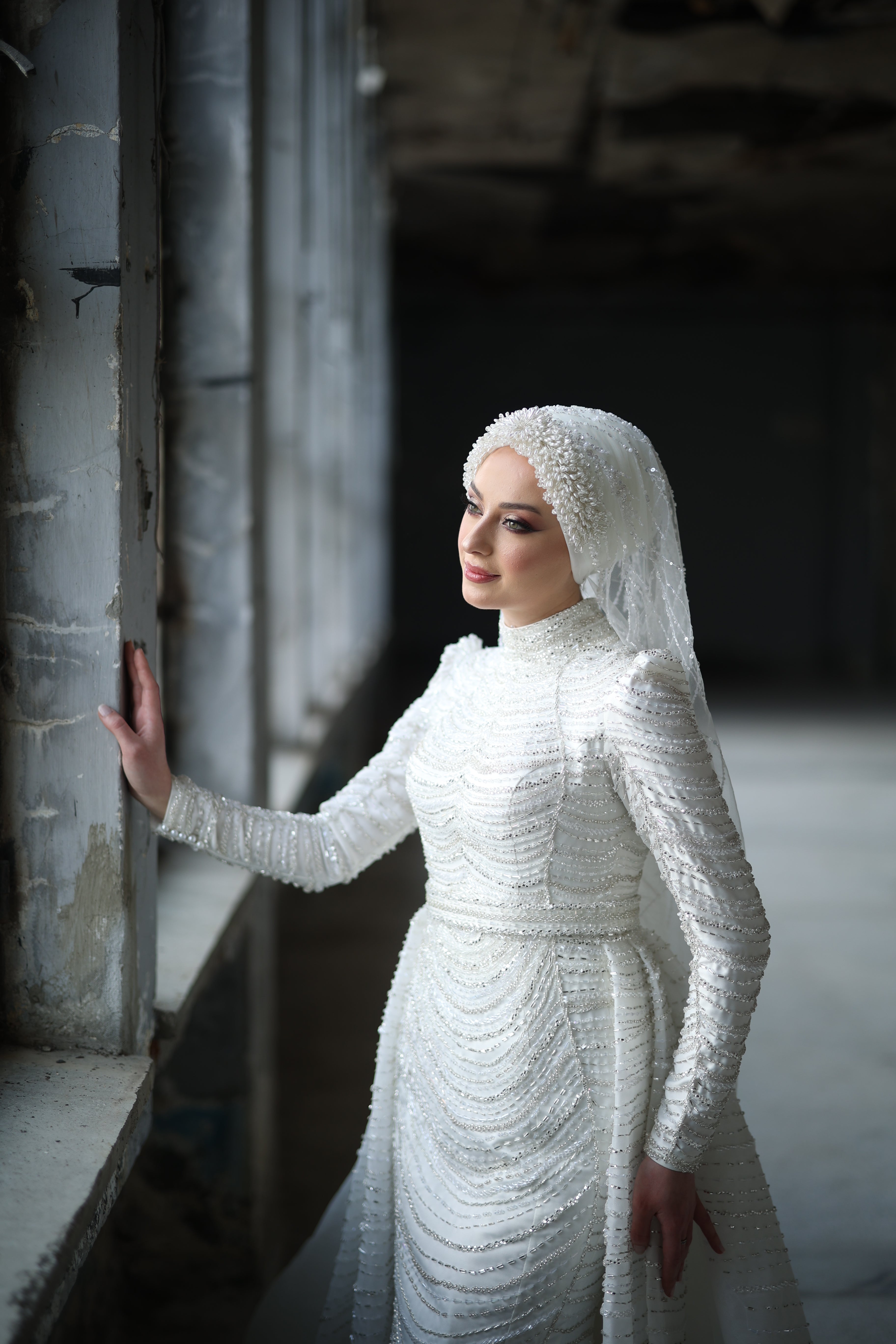 Modern elegance meets timeless grace in this stunning mermaid-cut bridal gown. Crafted in pure white with shimmering silver beadwork arranged in elegant patterns, this design highlights the silhouette beautifully while offering full coverage with its high neckline and long sleeves. The matching beaded hijab and flowing train complete the look, making it the ideal choice for brides seeking sophistication and refinement with a contemporary touch.