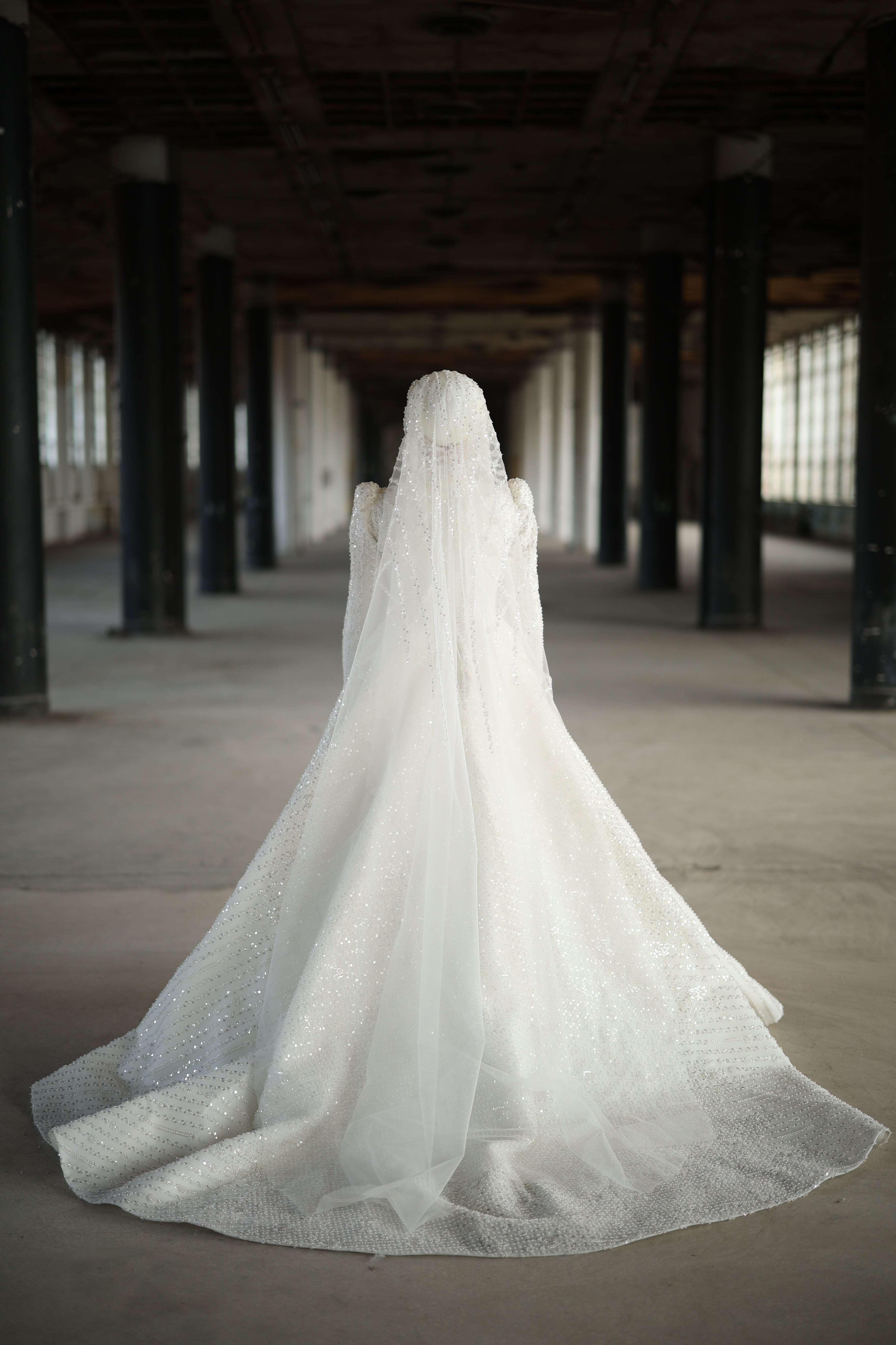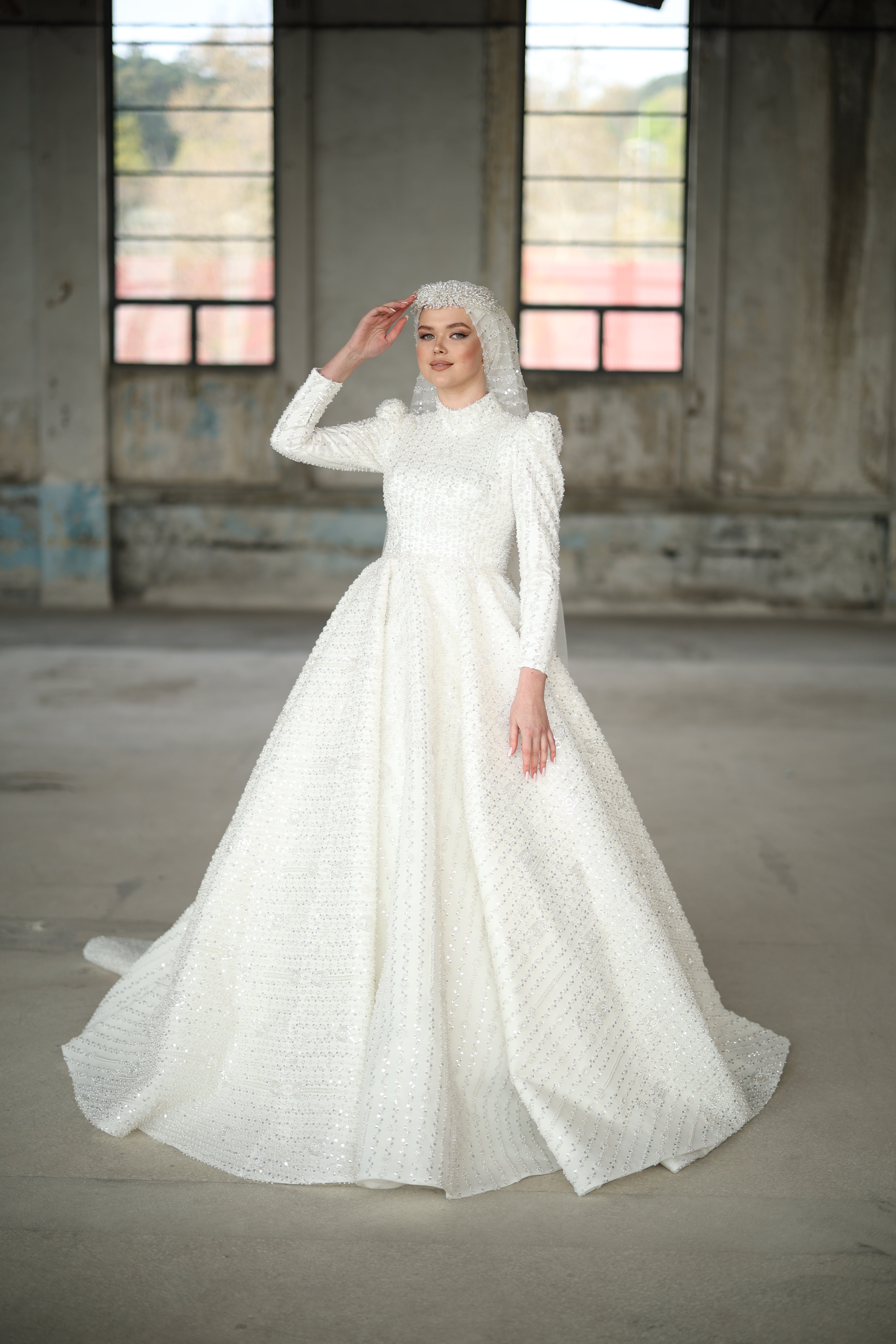 Step into your fairy-tale moment with this pearl white bridal gown, where timeless elegance meets intricate craftsmanship. Designed with a regal high neckline and long sleeves, this dress shines with all-over pearl and bead embellishments, gracefully catching the light with every movement. The voluminous skirt and the pearl-detailed hijab complete the look for the bride who dreams of radiance, grace, and royal sophistication.