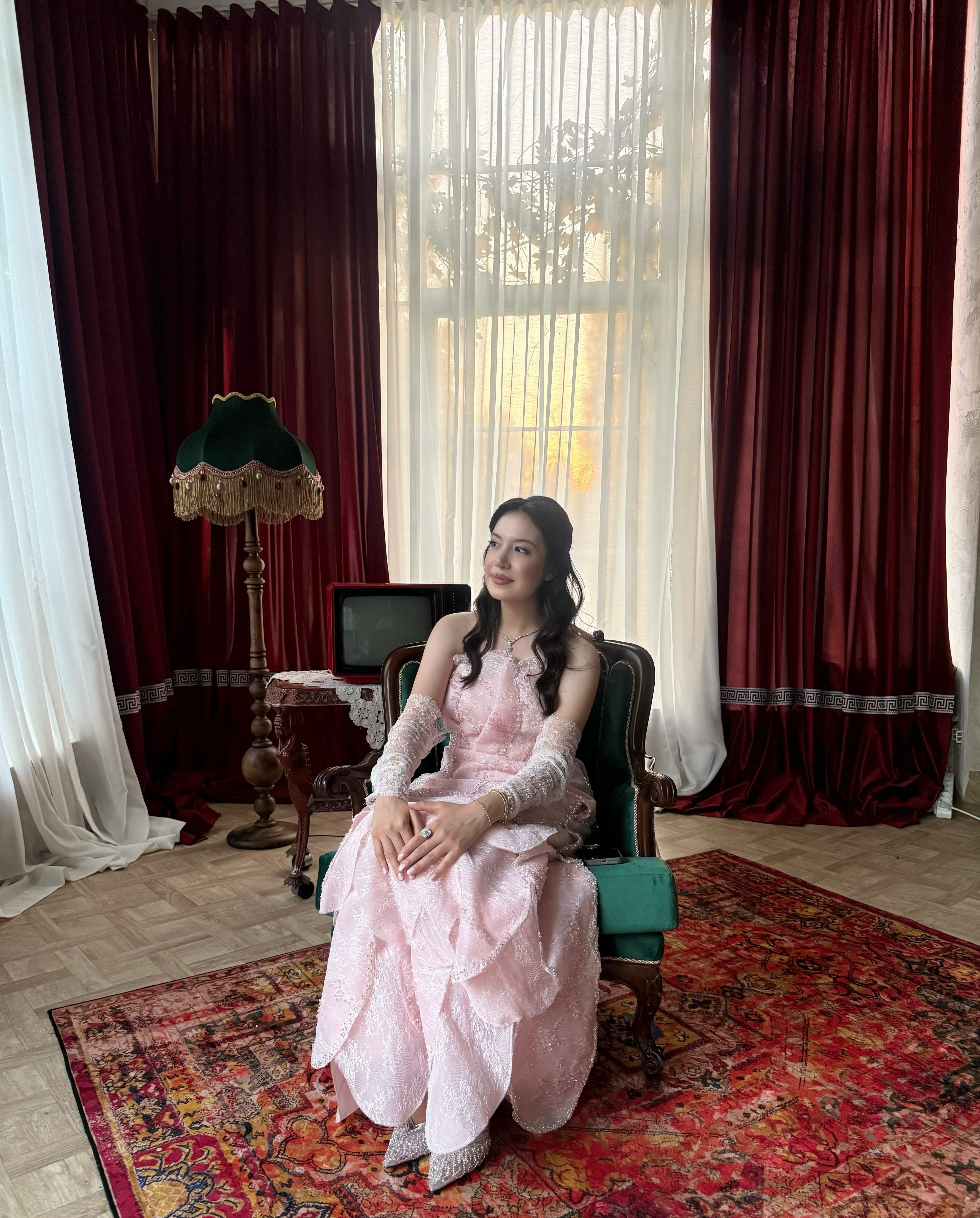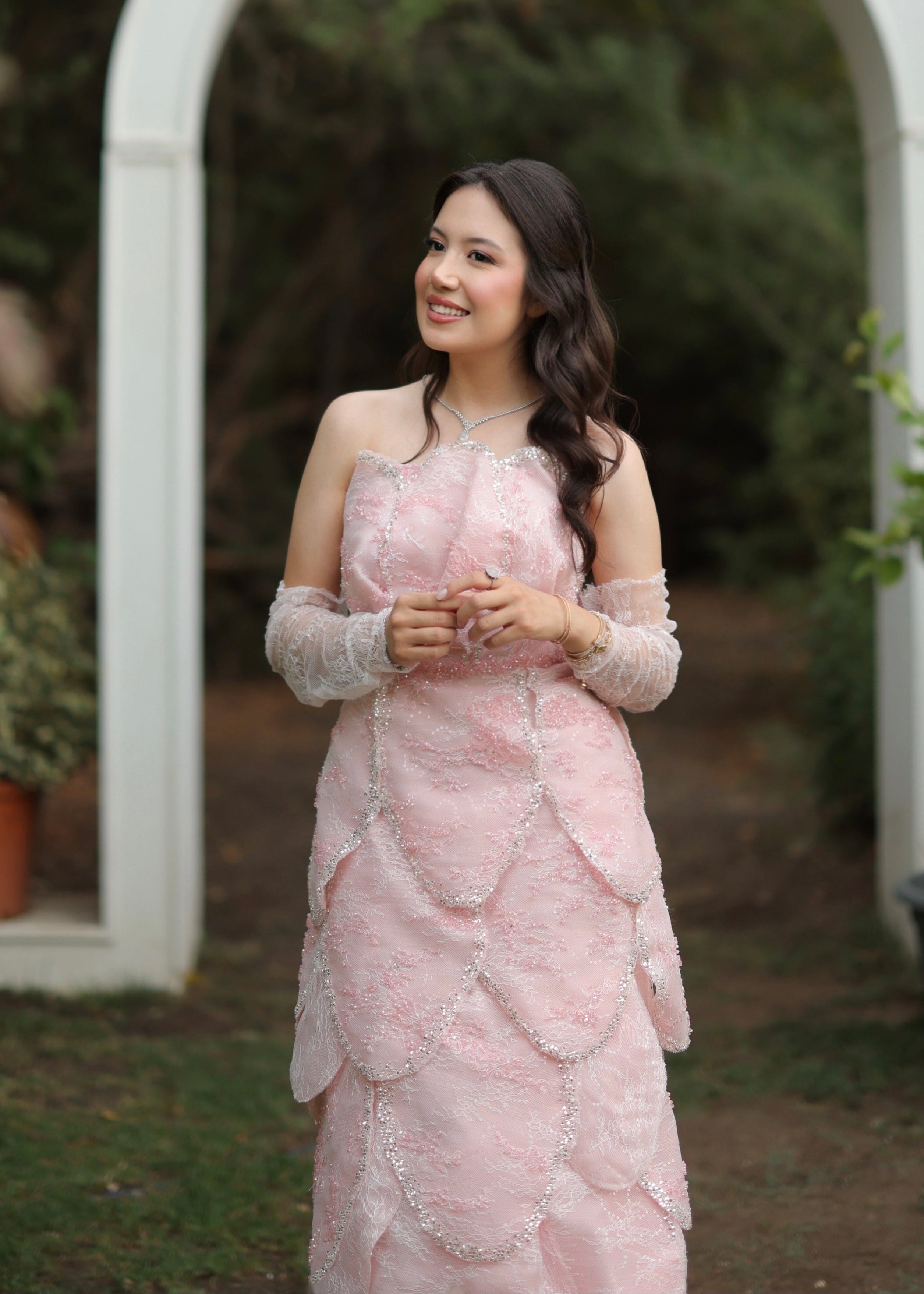 Designed in collaboration with Hüsna Kökçü, this romantic gown combines the delicate tones of pastel pink with exquisite handwork. Layered petal-like appliqués create a three-dimensional texture that moves gracefully with every step, while silver embroidery and crystal embellishments add a fairytale sparkle. Sheer tulle sleeves bring both a nostalgic and feminine touch, balancing the modern silhouette. With its refined elegance and dreamy charm, this gown is a perfect choice for engagements and special occasions.