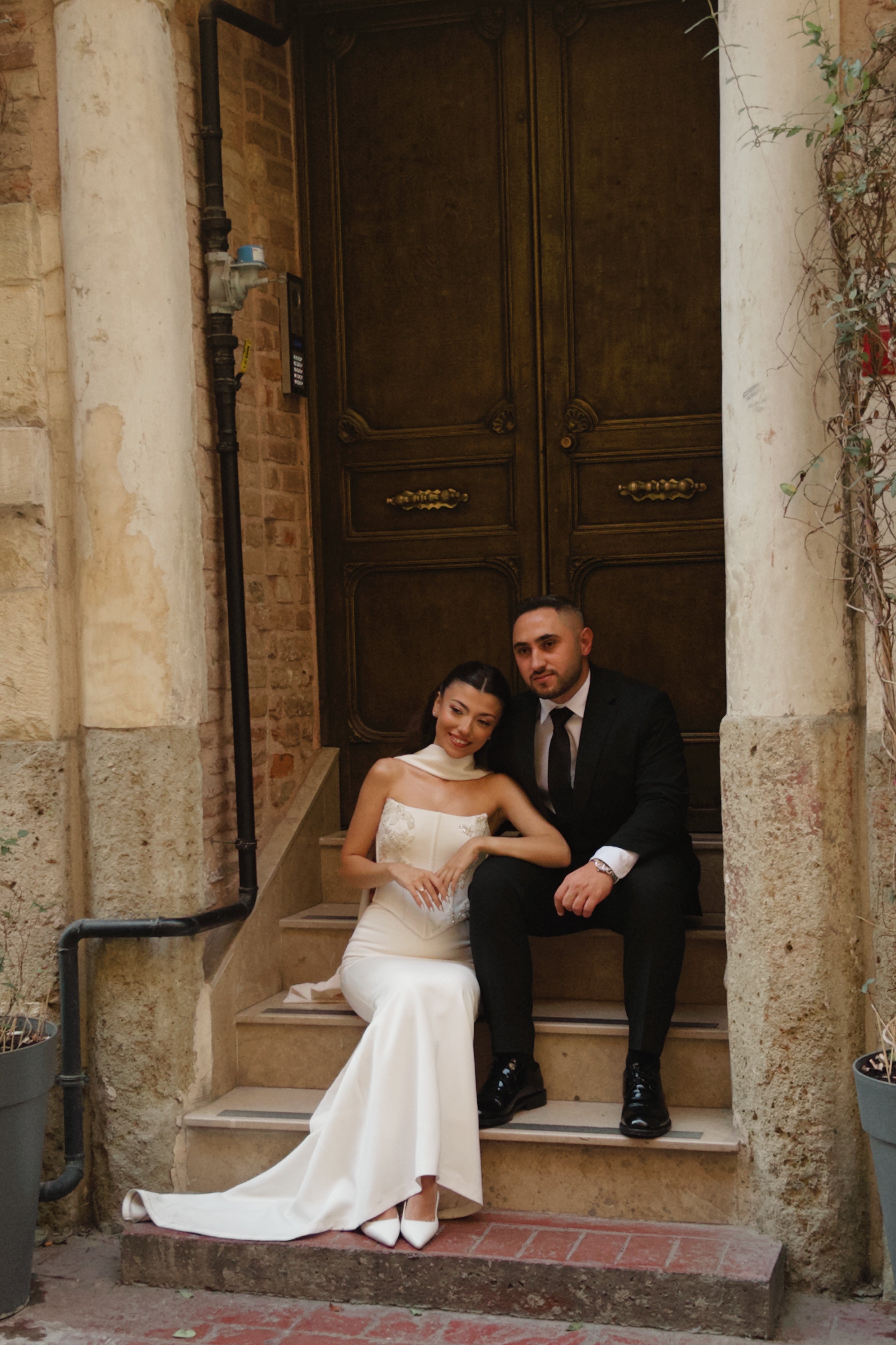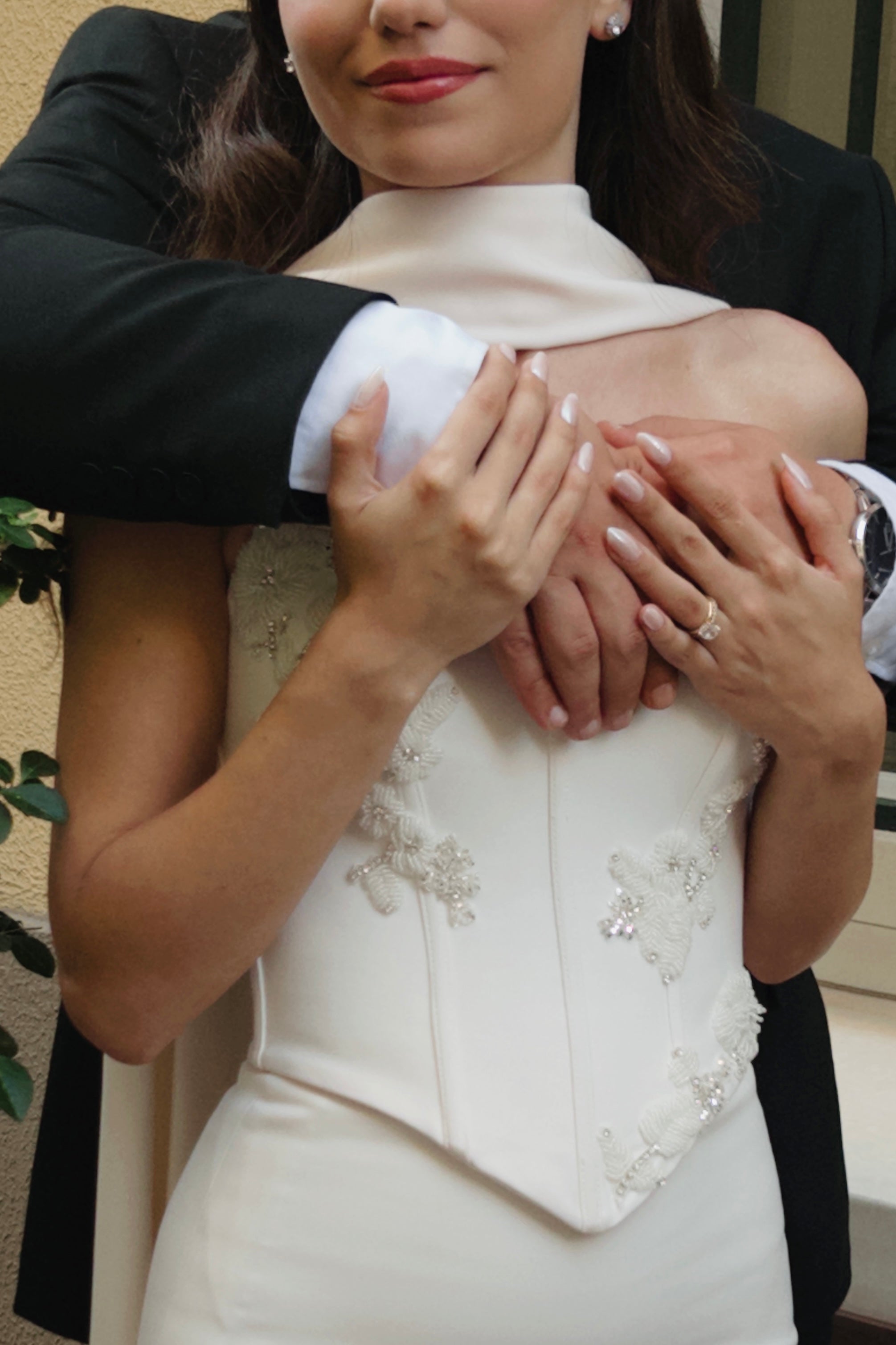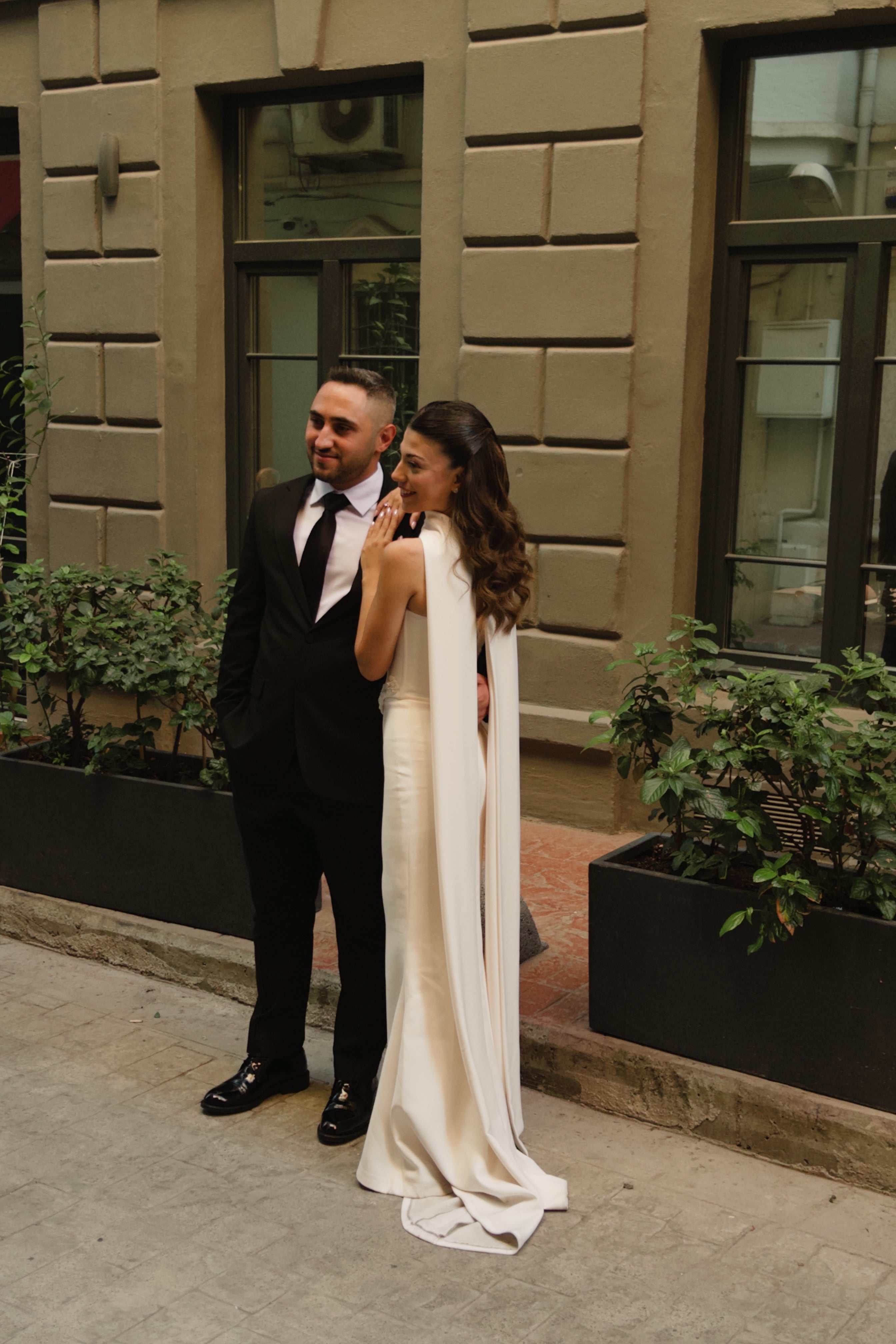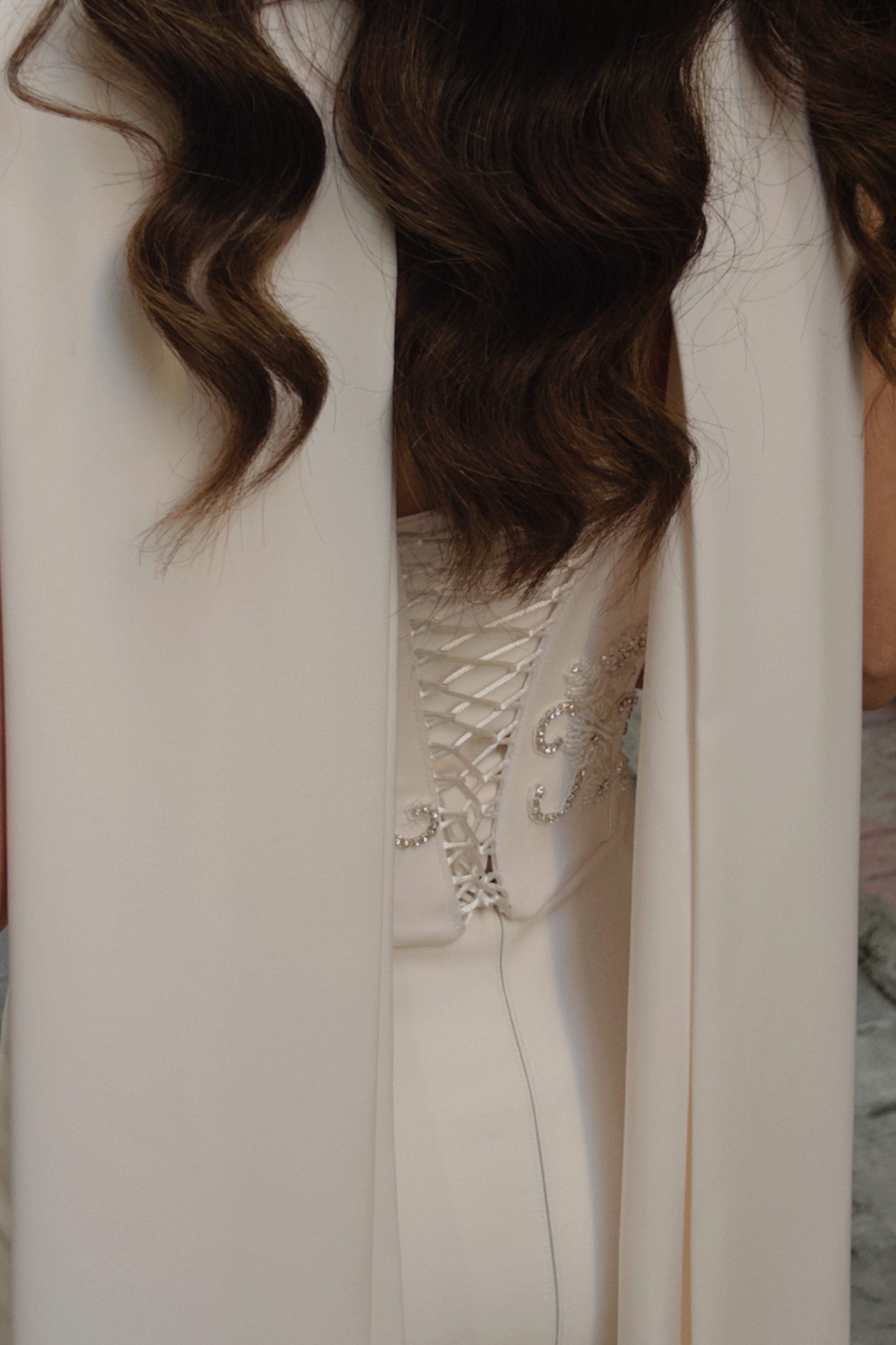 Created in collaboration with Merve Özarslan, this bespoke engagement gown blends timeless elegance with a modern touch. The strapless corset bodice accentuates the silhouette, while hand-embroidered 3D floral motifs and delicate crystal embellishments bring a luminous sophistication to the design. A lace-up detail at the back adds a refined finish, complemented by the flowing cape draped gracefully from the neckline, evoking both strength and romance. Defined by its minimal yet striking elegance, this gown is the perfect choice for brides-to-be or engagement celebrations seeking a modern and graceful style.