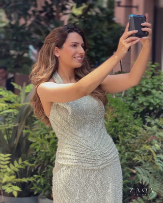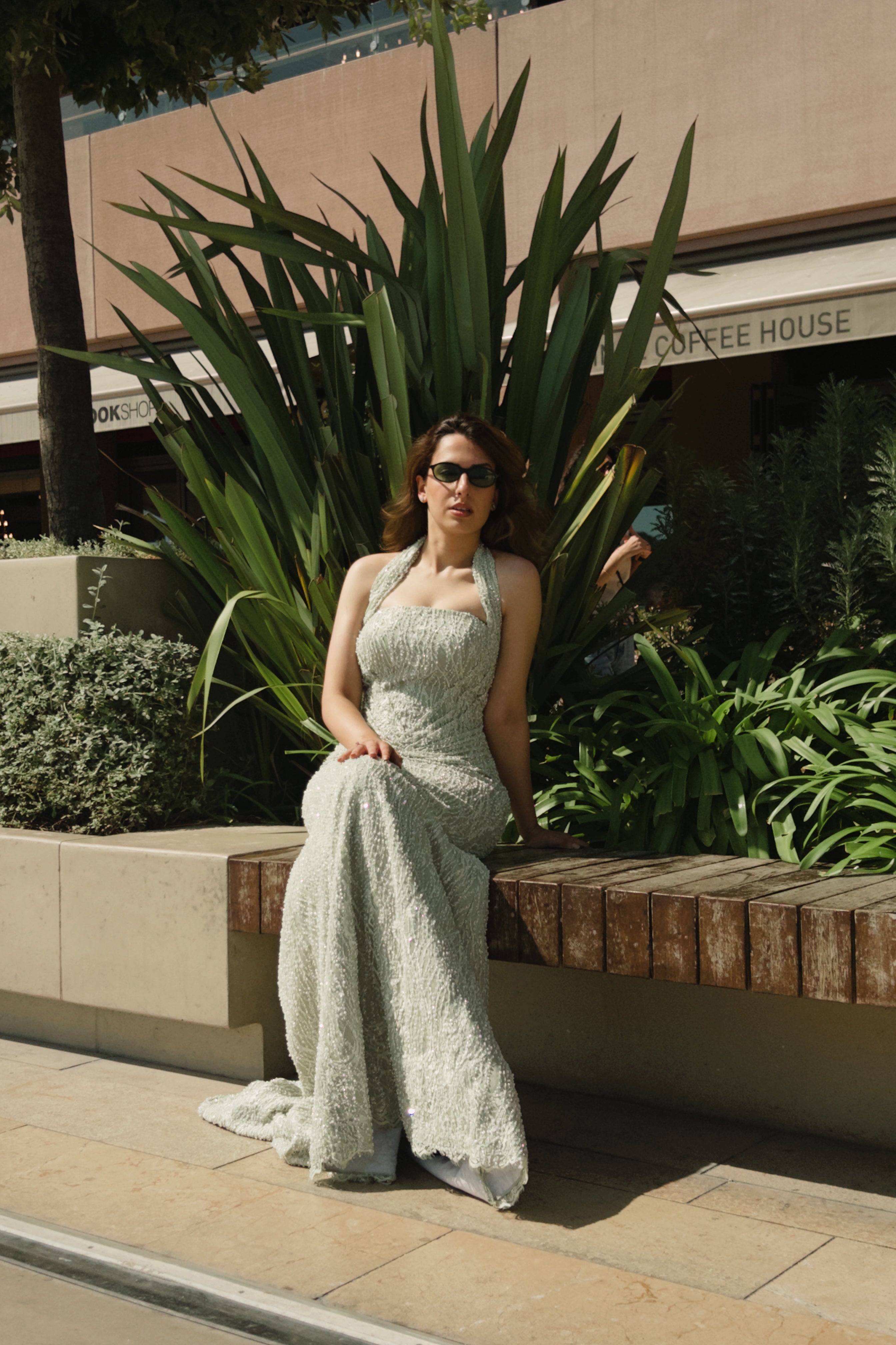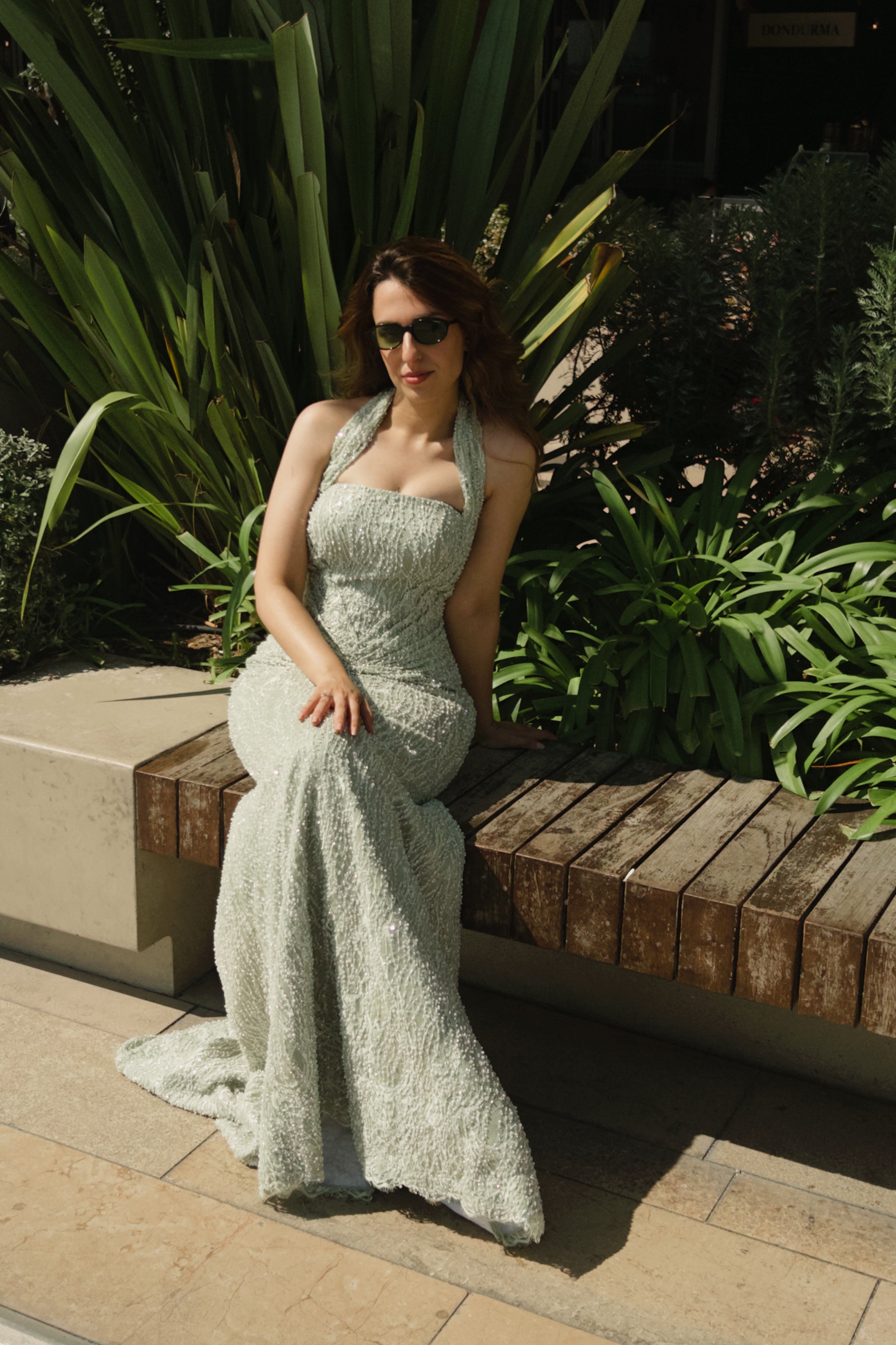 The Jade gown, designed for Yağmur Akşahin, embodies the harmony of a modern urban style with timeless couture elegance. Entirely hand-embroidered with pearls and crystals, it captures the light in a mesmerizing sparkle. The halter neckline adds a graceful touch, while the body-hugging silhouette and mermaid cut emphasize feminine elegance. With its luminous texture and sophisticated presence, Jade is the perfect choice for evening soirées and unforgettable city nights.