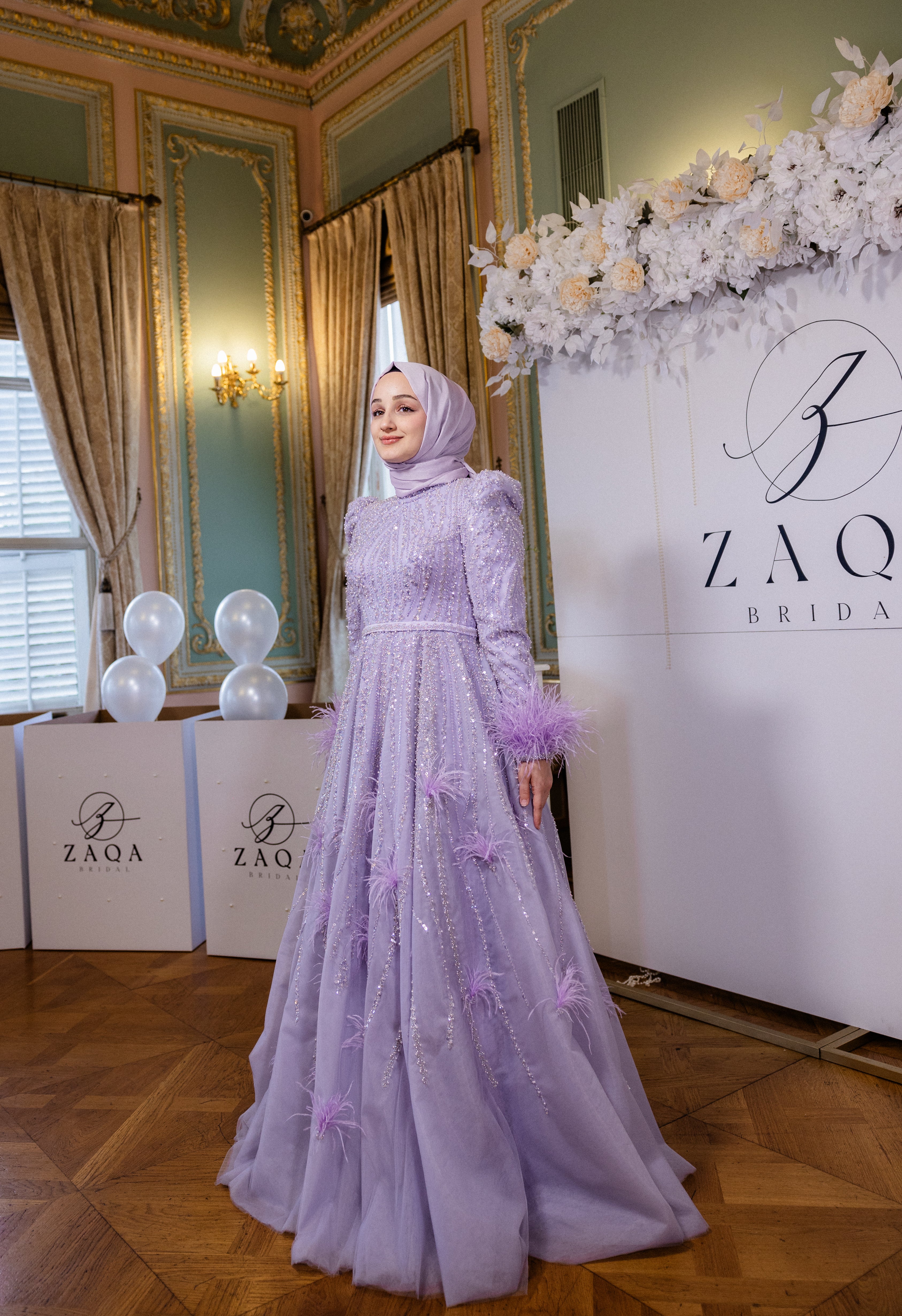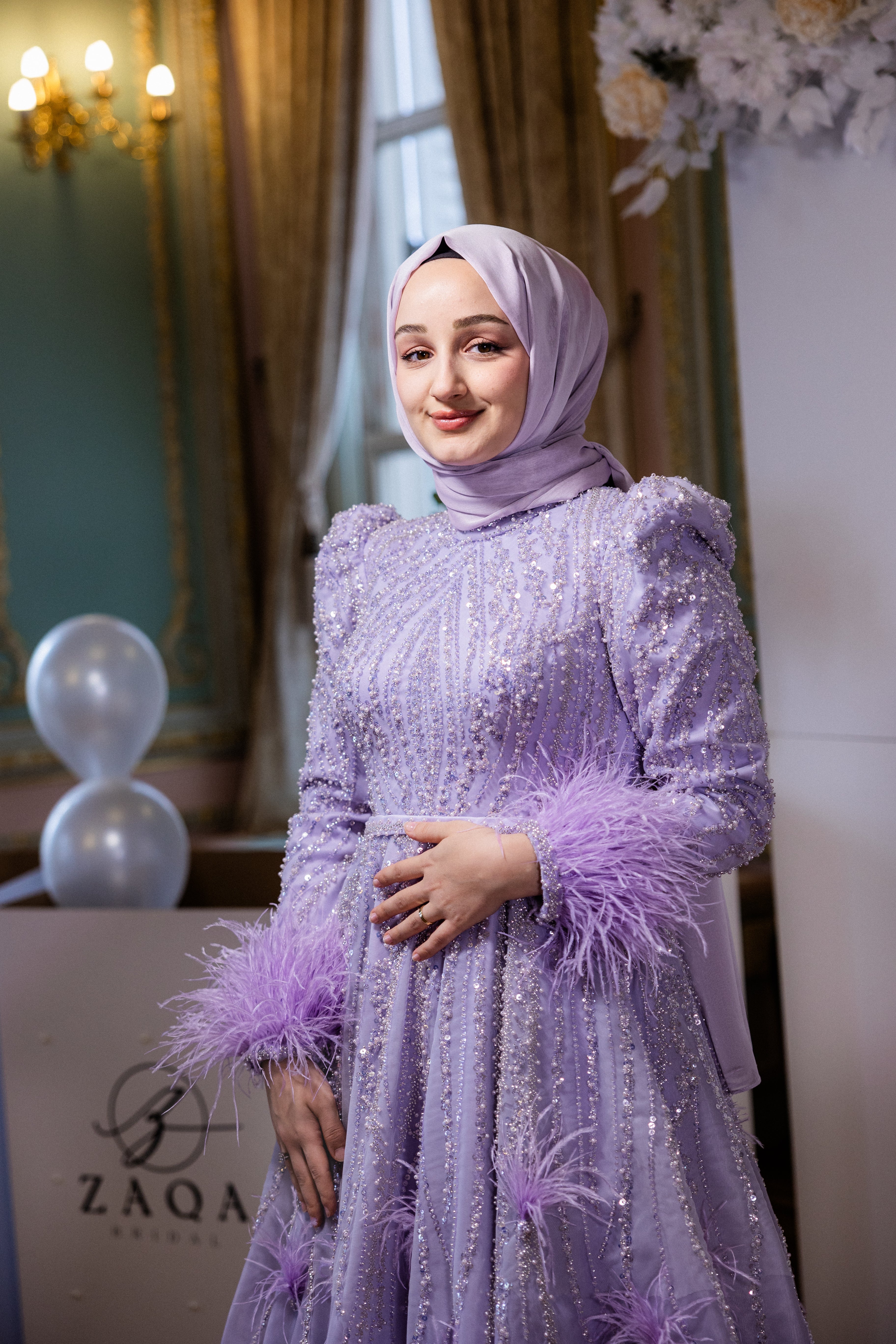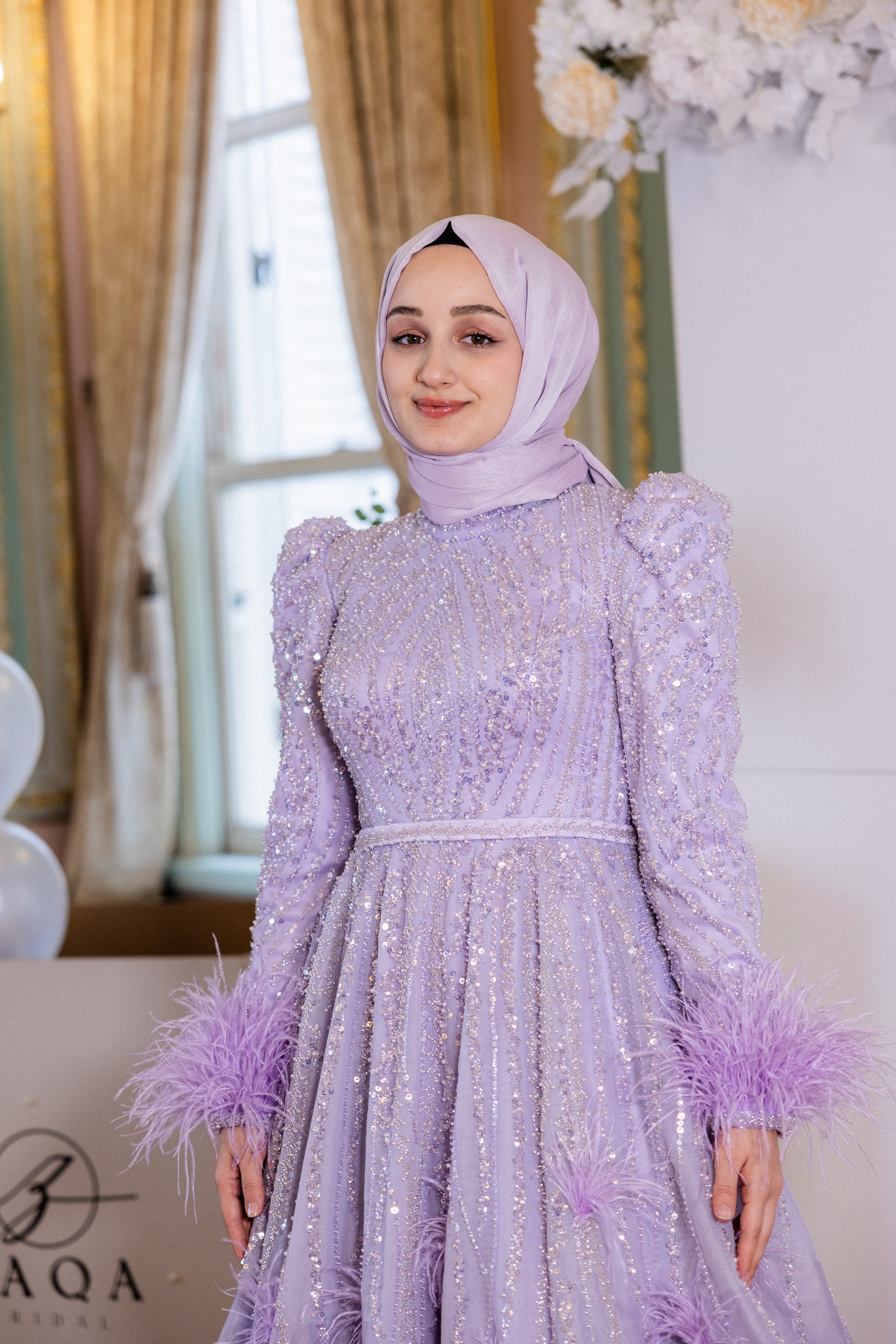 Yumuşakça ışıltılı ve büyüleyici olan bu leylak nişan ve gece elbisesi, narin tüy detayları ve ışıltılı pul süslemeleriyle büyülüyor. Hacimli A kesim siluet, yüksek yaka, kabarık uzun kollar ve manşetlerde ve etekte eğlenceli tüy detaylarıyla eşleştiriliyor. Tesettür dostu ve dikkat çekmek için tasarlanan bu elbise, zarafetin modern bir havayla buluştuğu nişan törenleri, resepsiyonlar veya kına geceleri için idealdir.