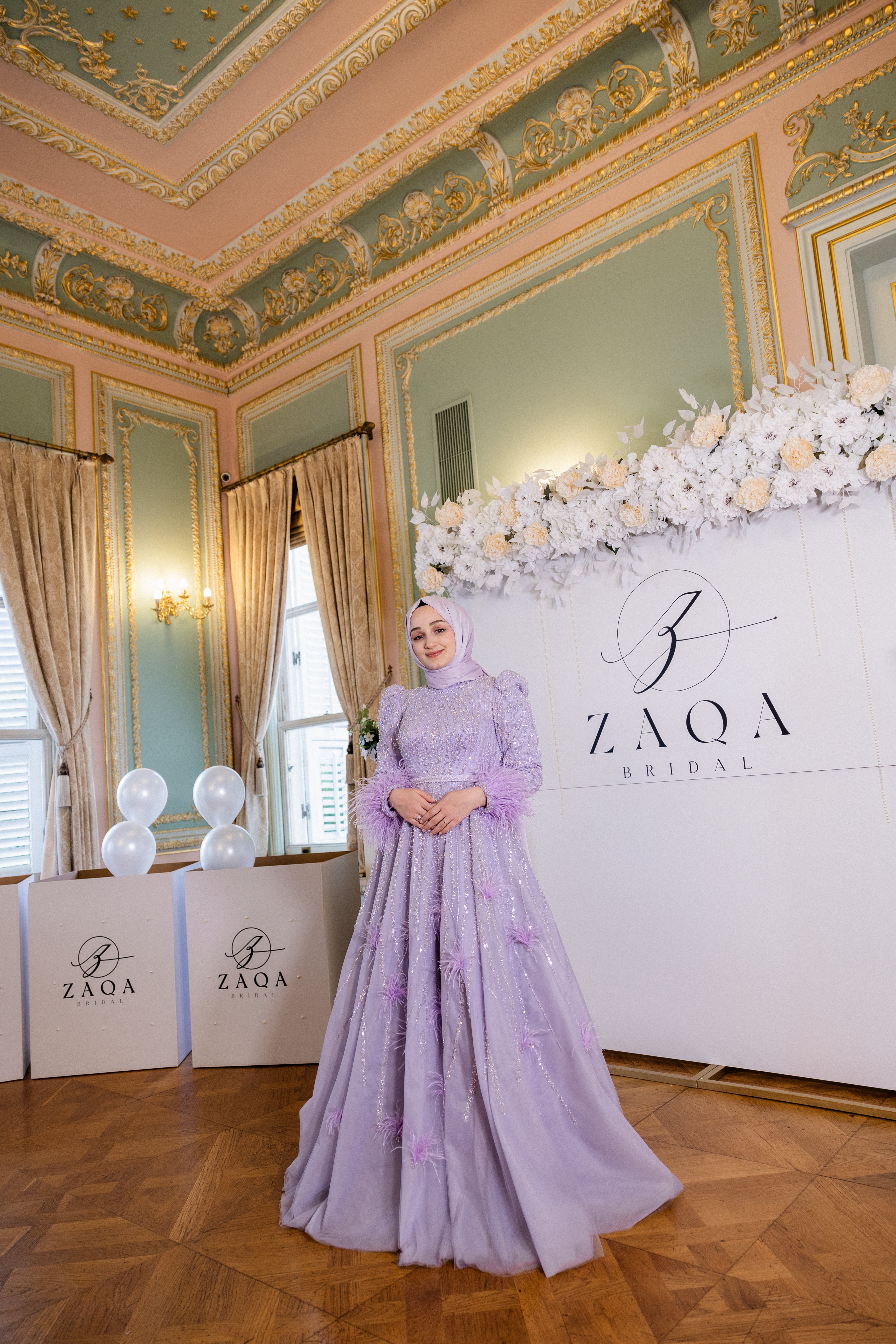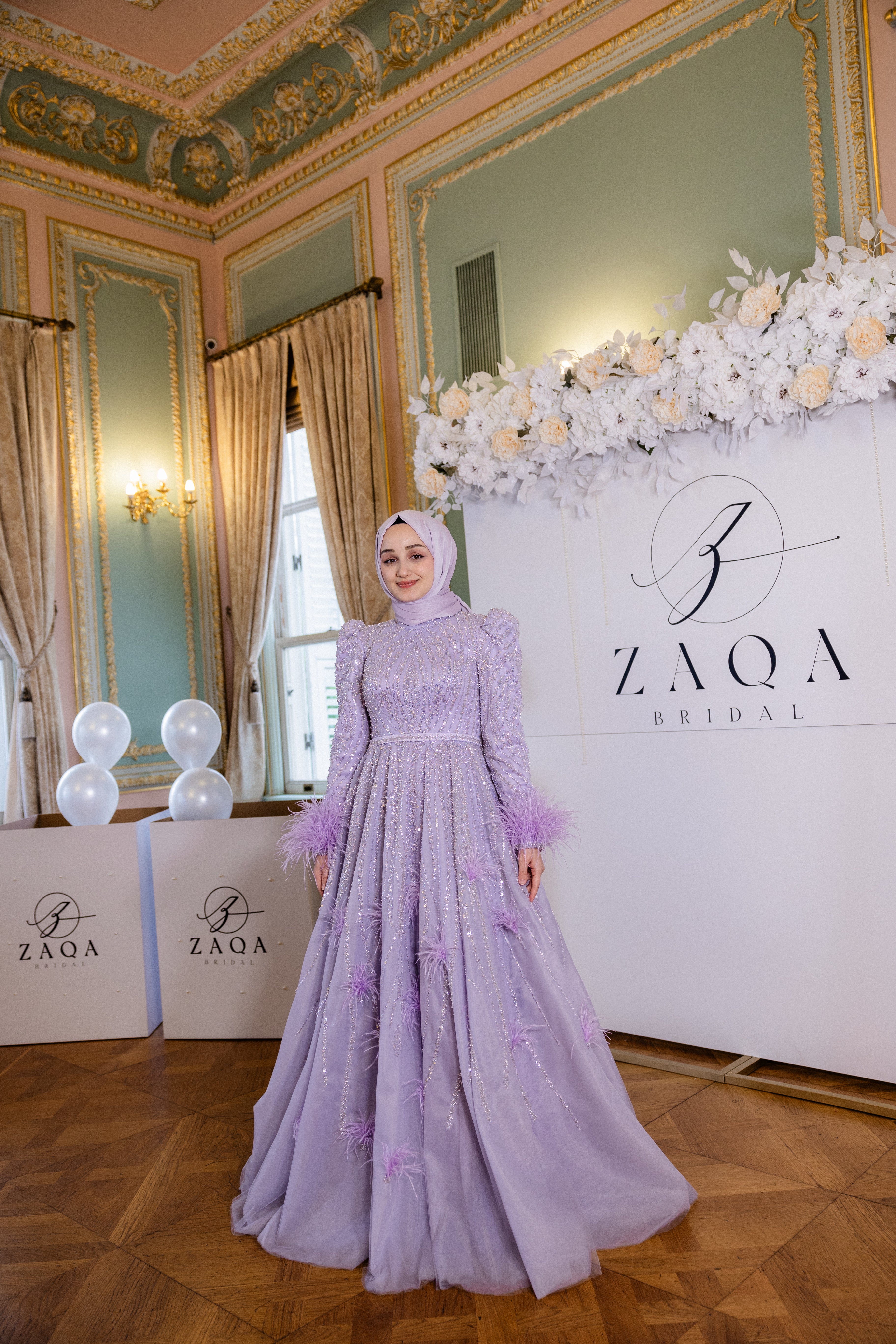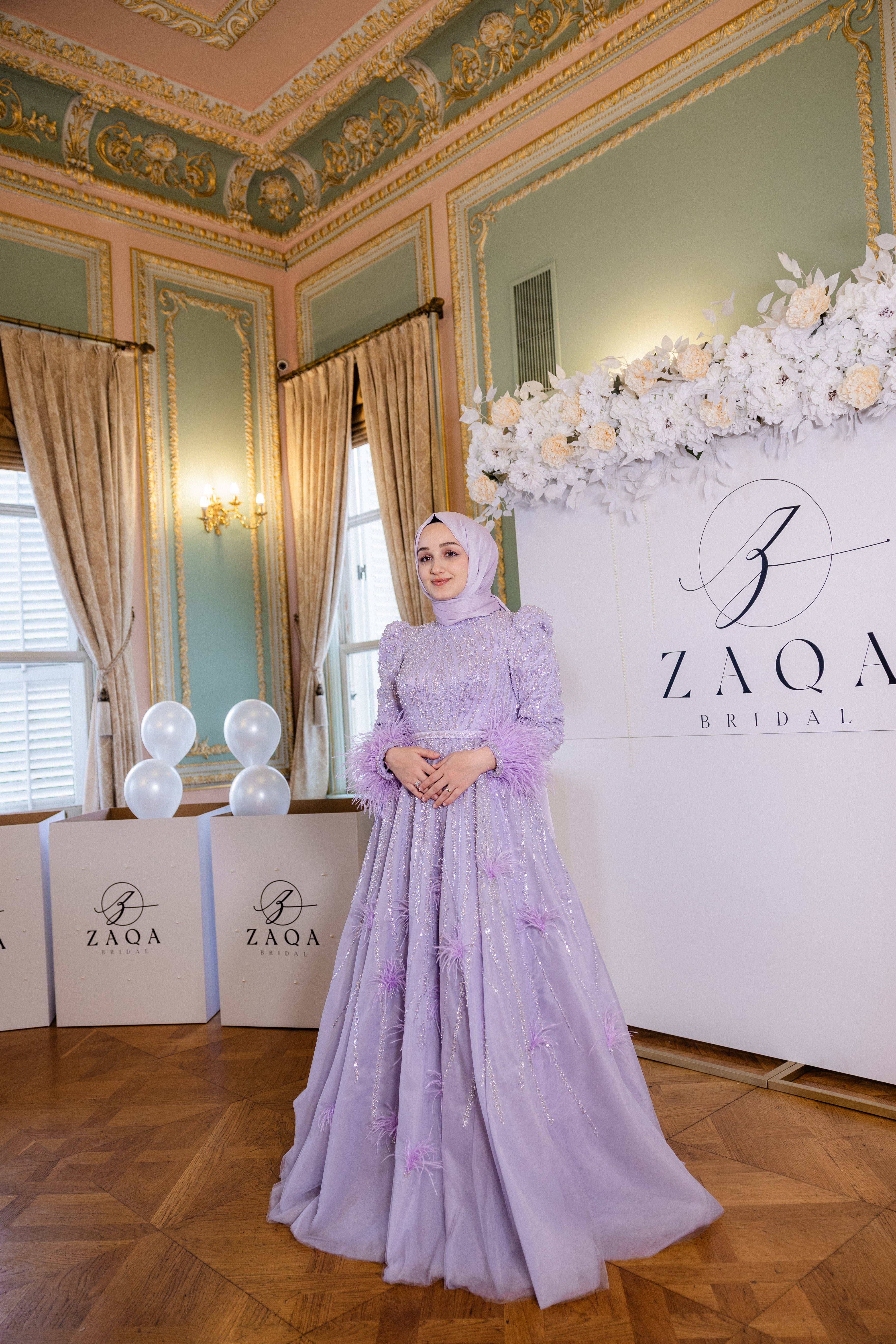 Yumuşakça ışıltılı ve büyüleyici olan bu leylak nişan ve gece elbisesi, narin tüy detayları ve ışıltılı pul süslemeleriyle büyülüyor. Hacimli A kesim siluet, yüksek yaka, kabarık uzun kollar ve manşetlerde ve etekte eğlenceli tüy detaylarıyla eşleştiriliyor. Tesettür dostu ve dikkat çekmek için tasarlanan bu elbise, zarafetin modern bir havayla buluştuğu nişan törenleri, resepsiyonlar veya kına geceleri için idealdir.