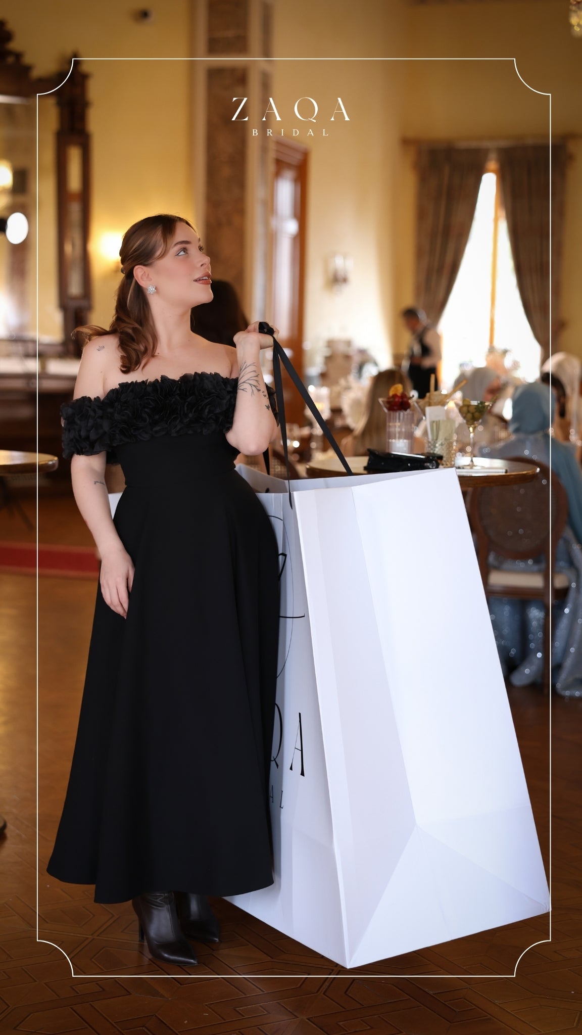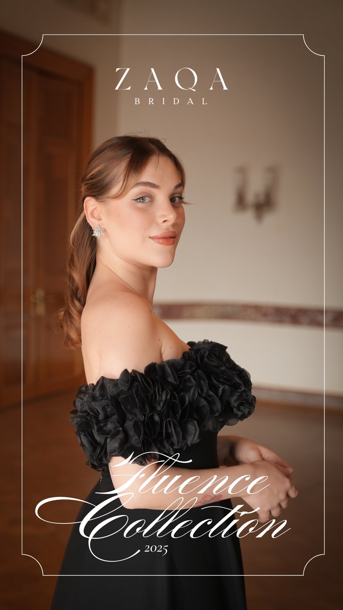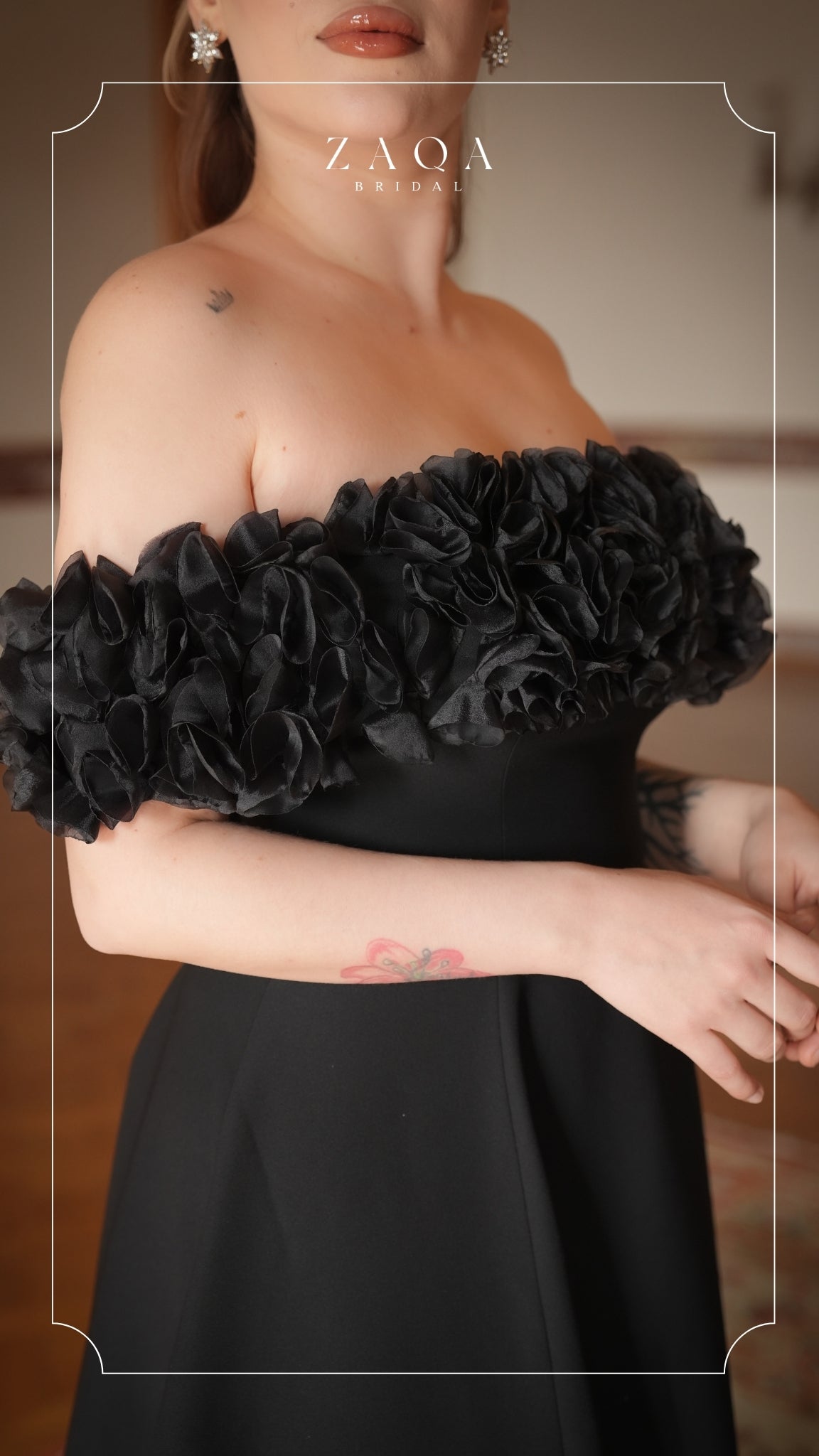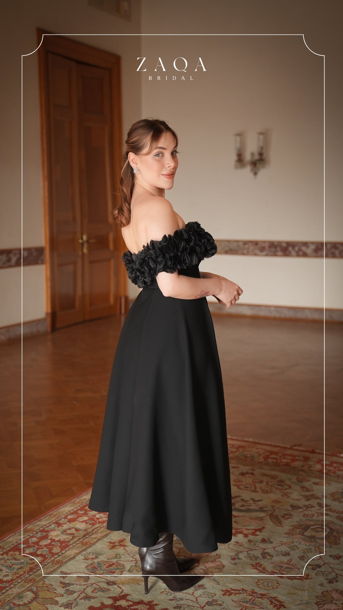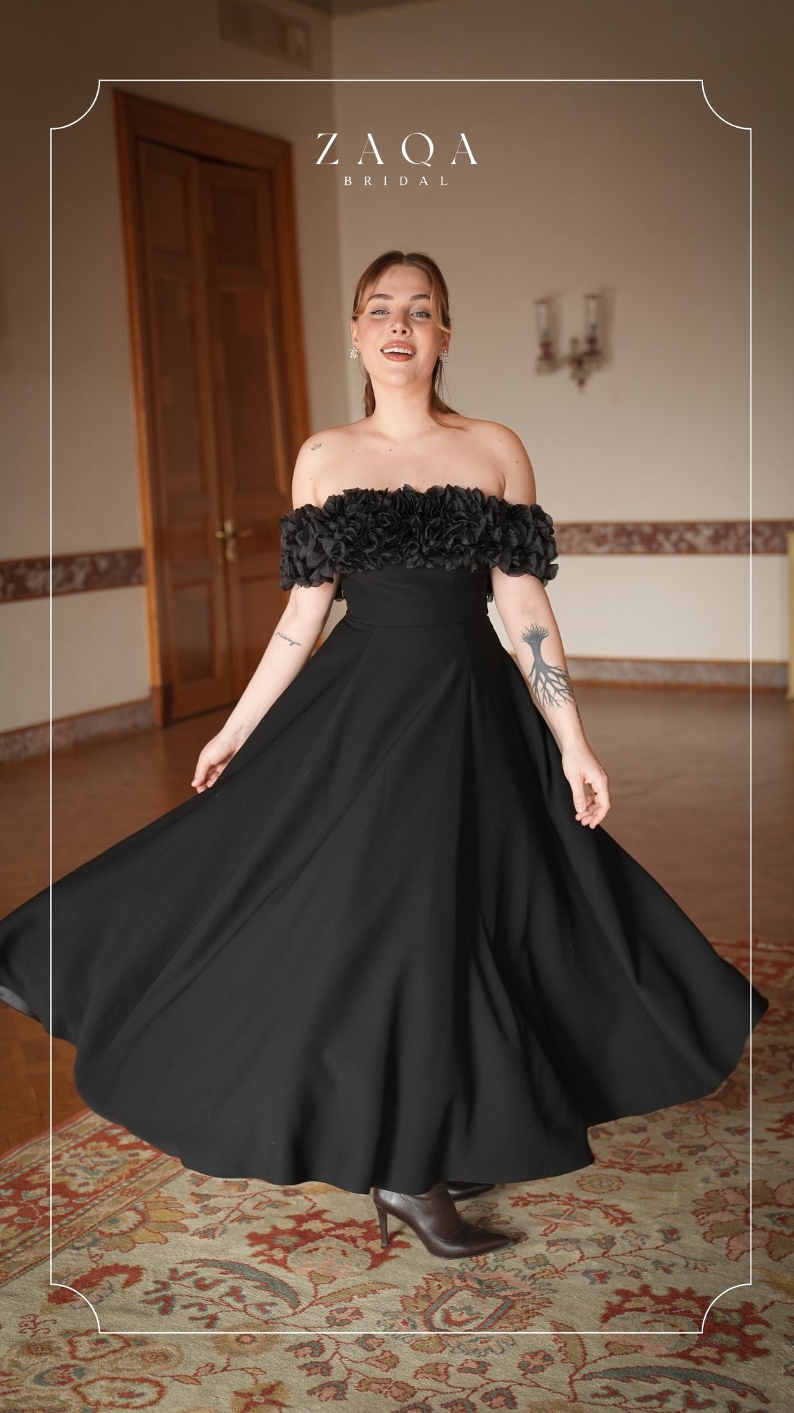 Özgüvenin ve hareketin elbisesi — “Aslı” elbisesi, siyahın asaletiyle dönerken zarafeti kutluyor. Omuzları açık tasarımı, yakadaki hacimli 3D çiçek detaylarıyla romantik ve dokulu bir görünüm sunuyor. Yapılandırılmış bedeni ve geniş, dökümlü eteğiyle duygularını kıyafetine yansıtmak isteyen kadınlar için tasarlandı.