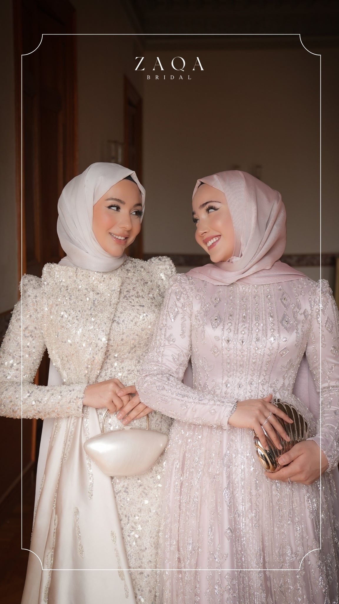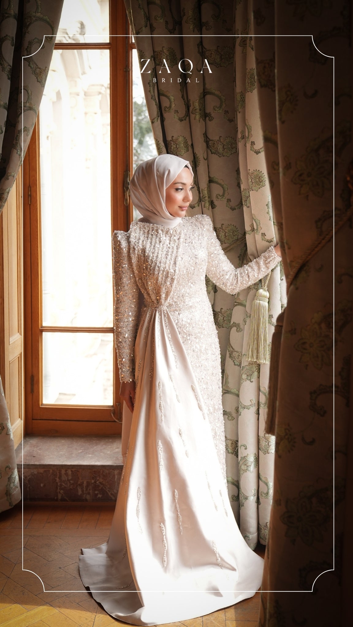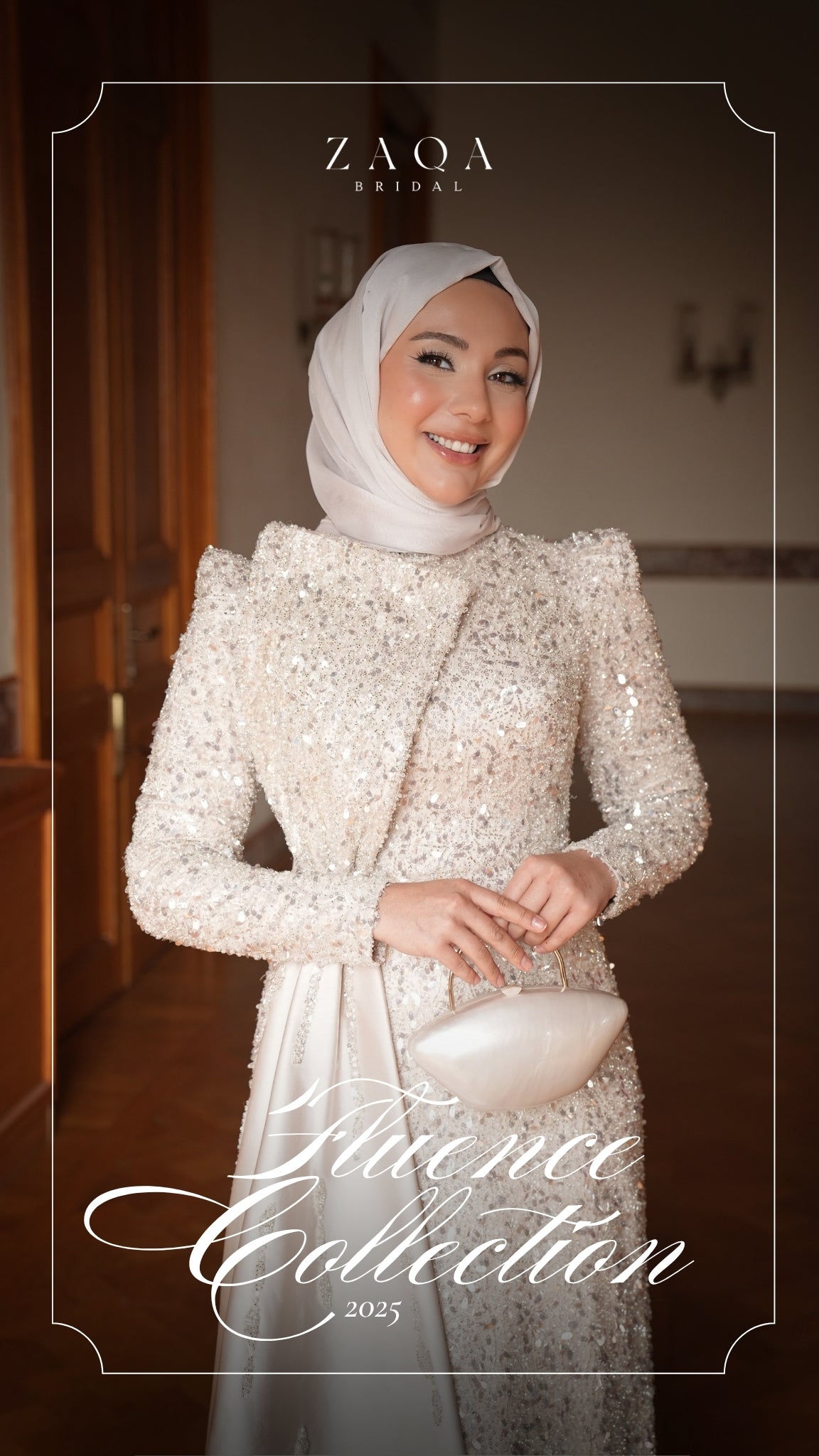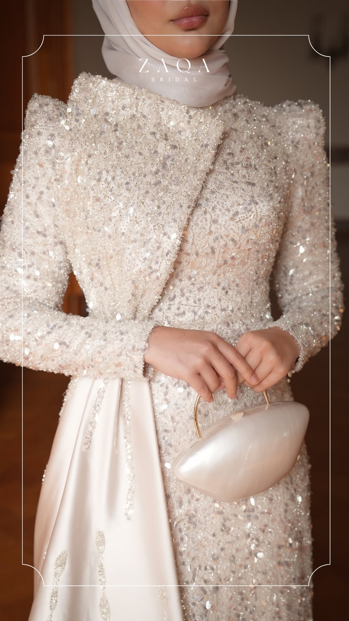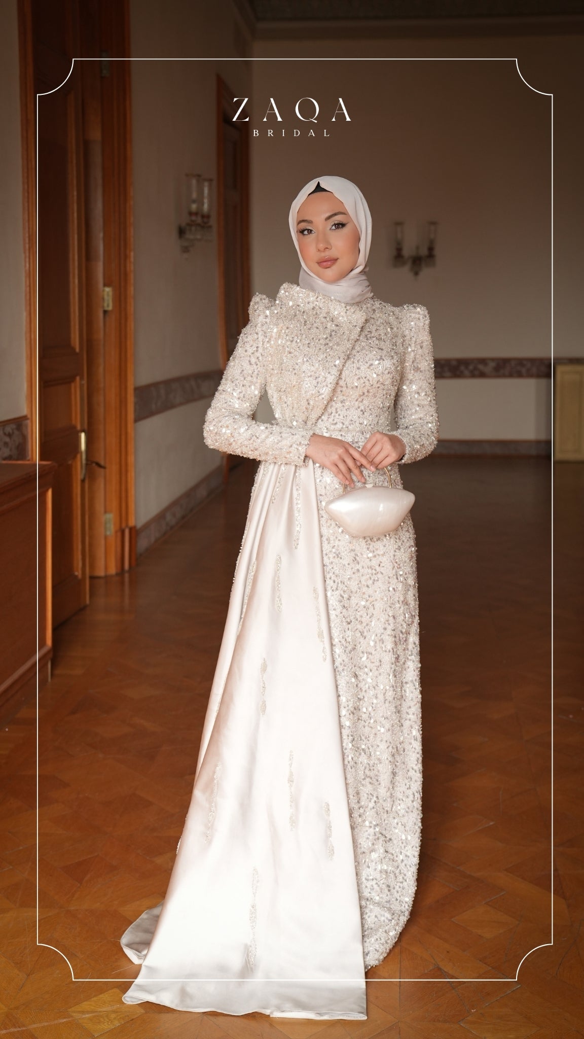 Asil bir zarafetin yansıması — “Amine” elbisesi, yumuşak fildişi tonlarındaki ışıltılı payet kumaşı ve dramatik saten kuyruk detayıyla göz alıyor. Yüksek yakası, uzun kolları ve yapılandırılmış omuzlarıyla heykelsi bir duruş sunarken; katmanlı dokusu tasarıma derinlik ve ihtişam katıyor. Geleneği lüks ve özgüvenle kucaklayan modern gelinler için tasarlandı.