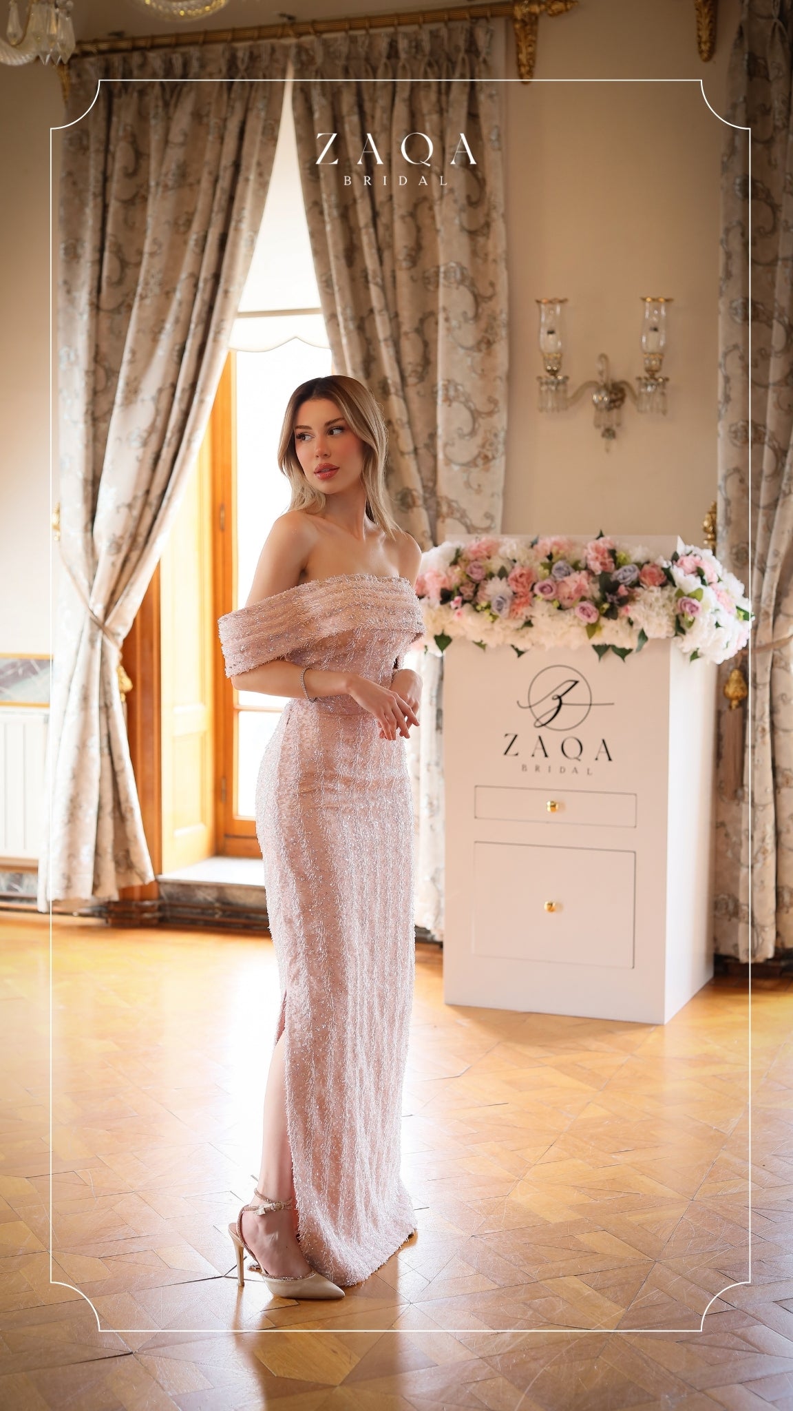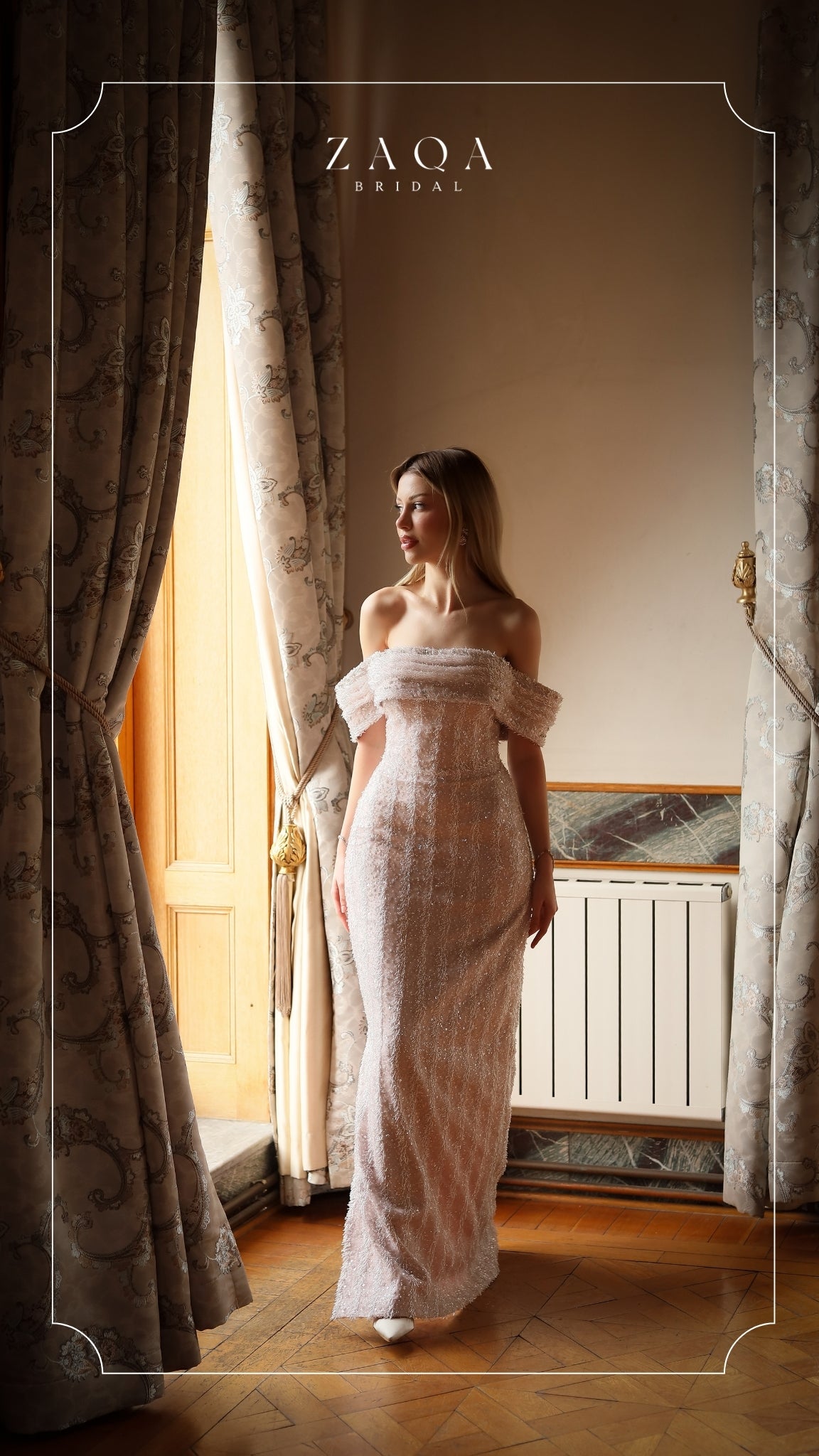 Işıltı ve zarafetin büyüleyici uyumu — “Aselbelis” elbisesi, tamamen payetle işlenmiş kumaşı ve romantik düşük omuz yaka detayıyla göz kamaştırıyor. Parlak dokusu, her hareketle ışığı yakalayarak ışıltılı bir duruş yaratıyor. Pudra tonları ve zamansız kesimi, ihtişamla zarafeti özel davetler için buluşturuyor.