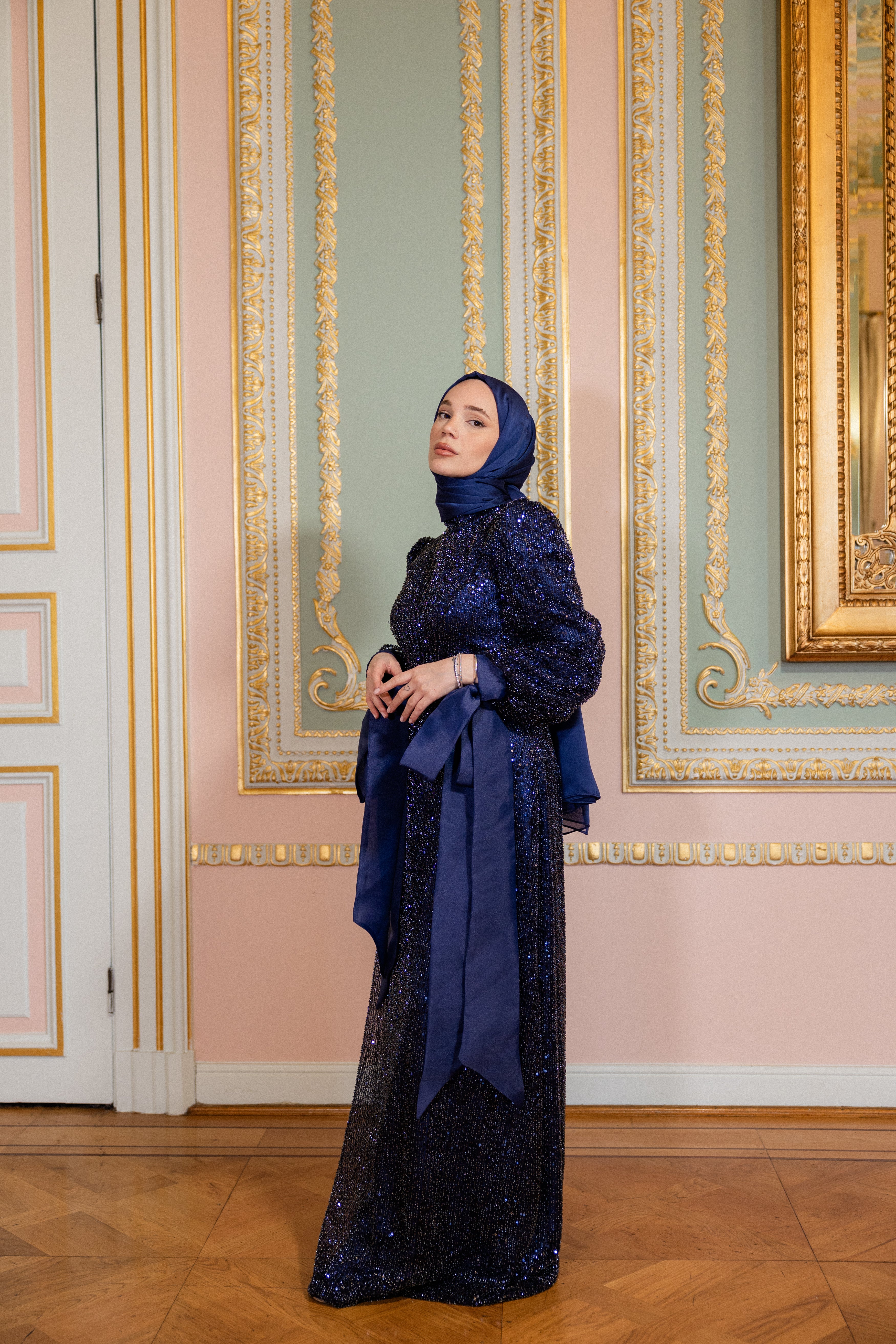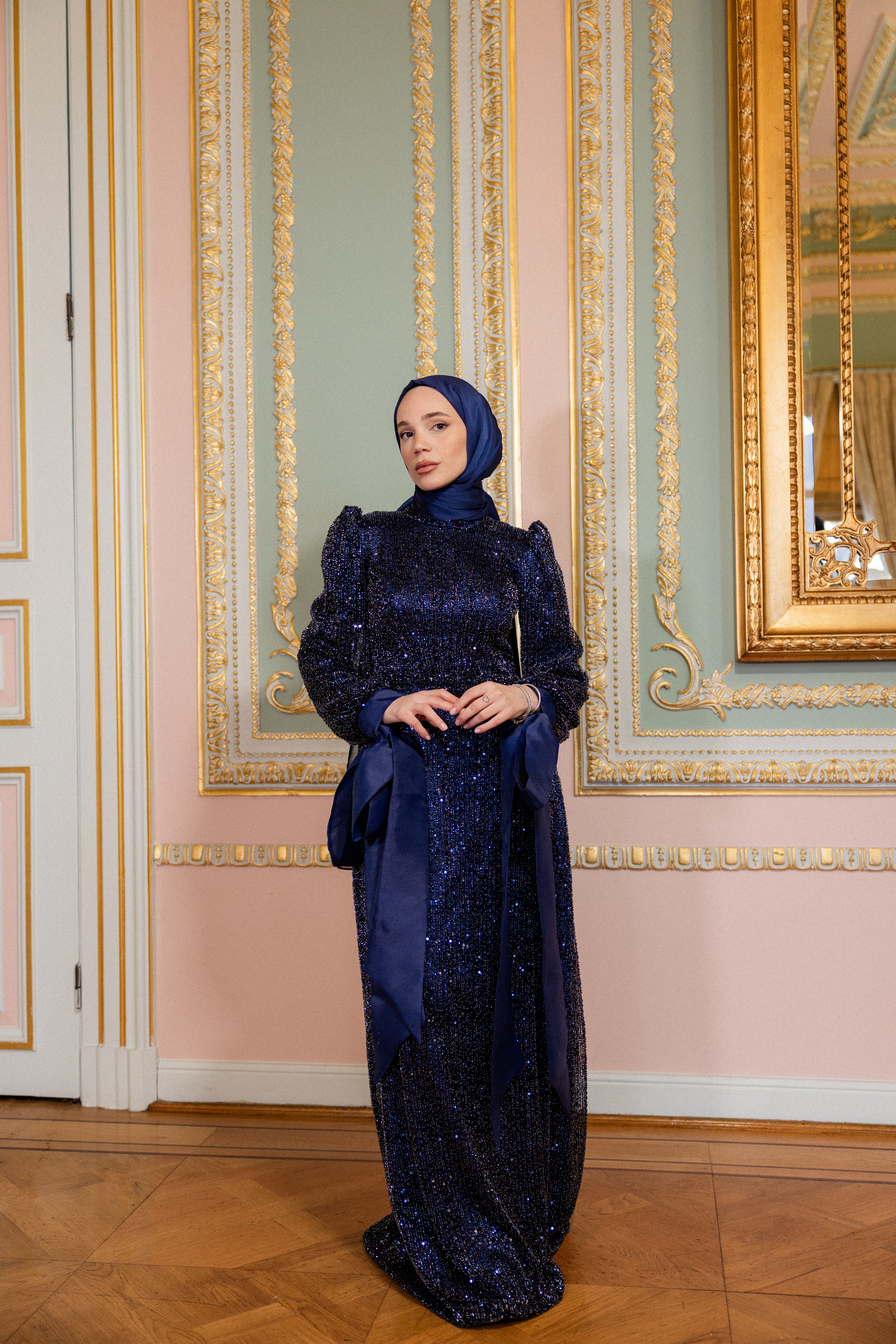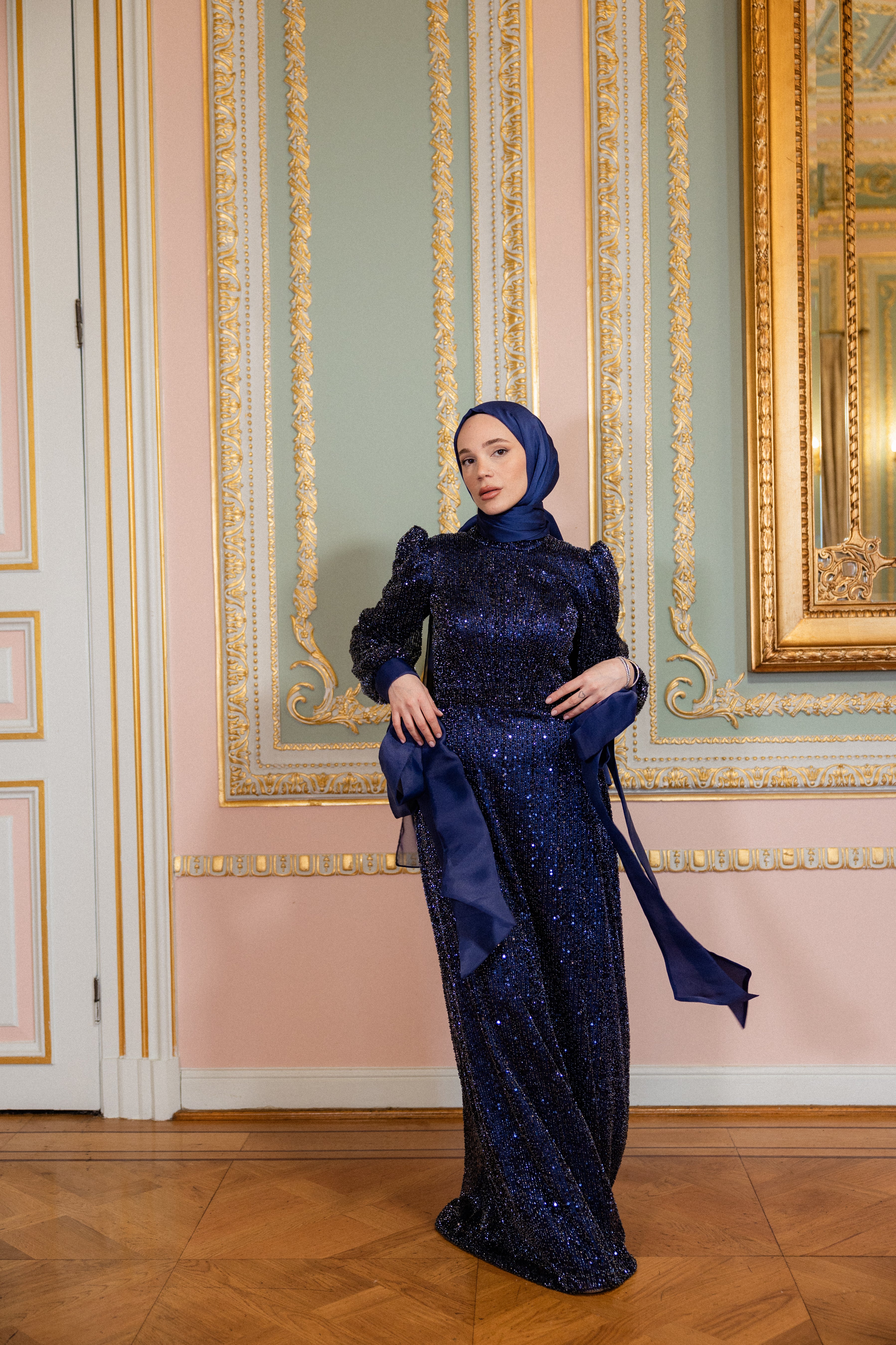 Şık ve zarif olan bu gece mavisi gece elbisesi, simli tül dokusu ve sofistike silüetiyle göz kamaştırıyor. Elbise, hoş yuvarlak yaka, uzun kabarık kollar ve beli vurgulayan geniş saten fiyonk kemerle vurgulanan yumuşak A kesimine sahiptir. Nişan partileri, galalar veya resmi akşamlar gibi özel günlerde ışıltı ve zarafet arayan zarif, başörtülü kadınlar için tasarlanmıştır.
