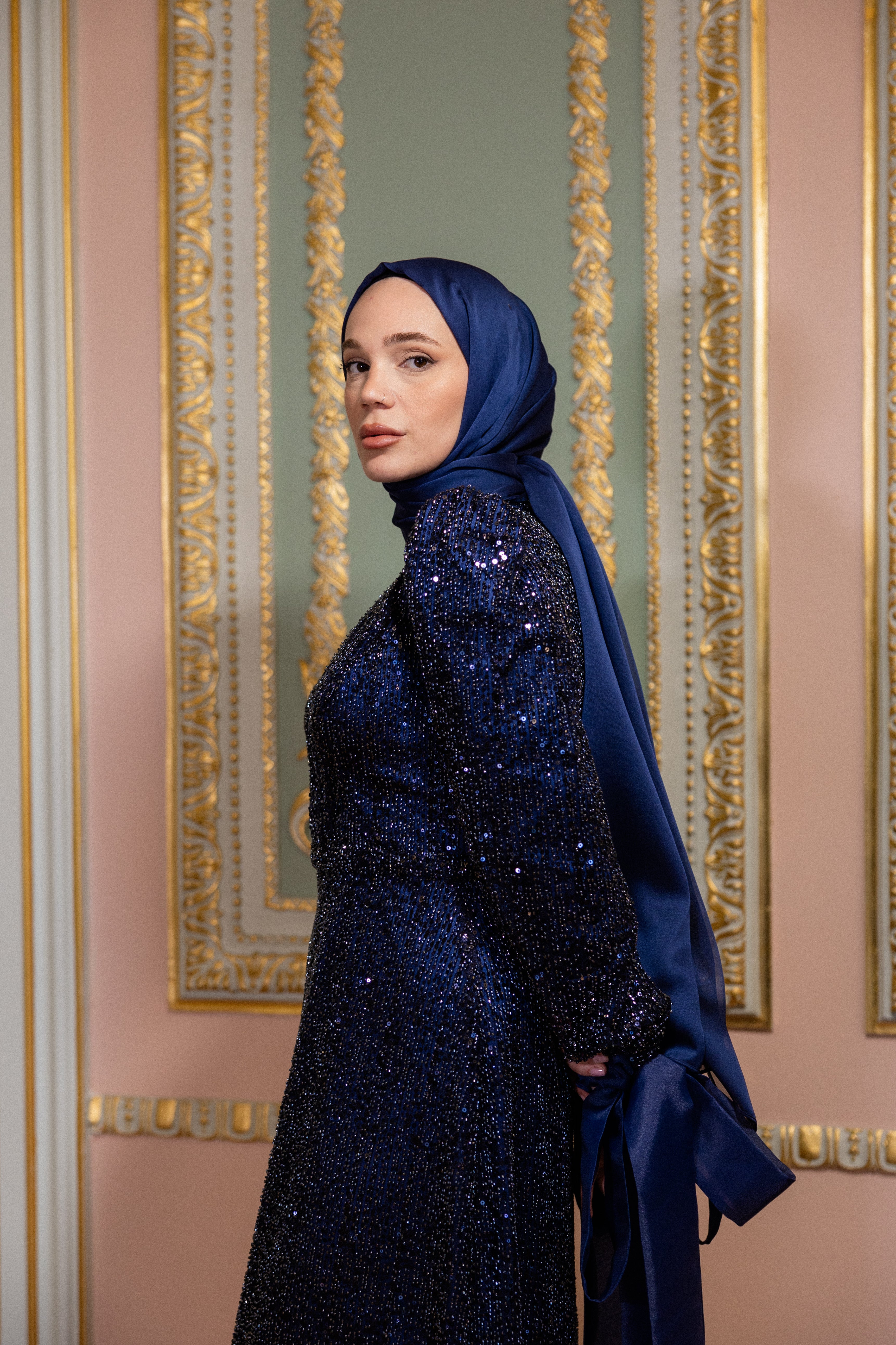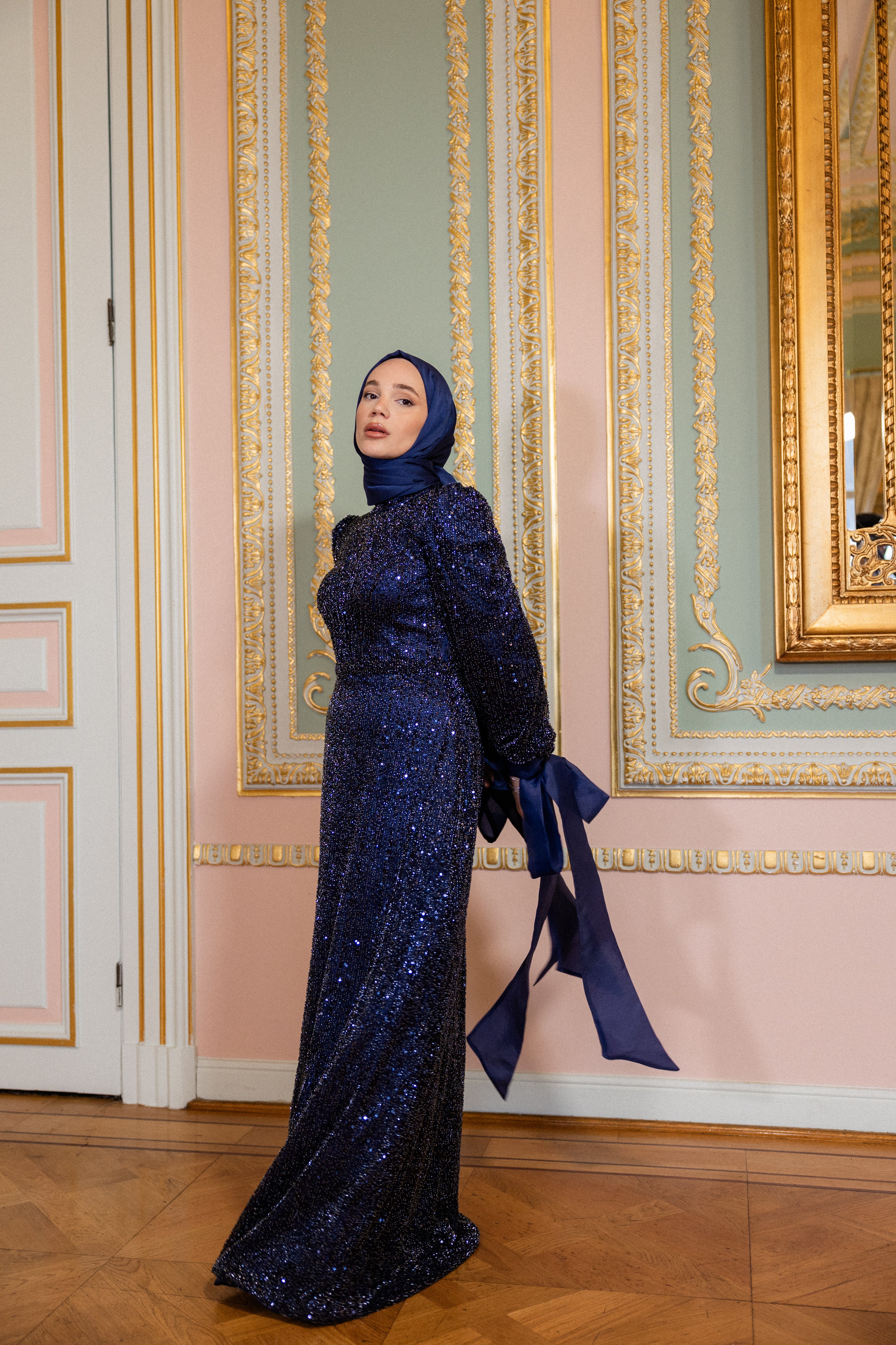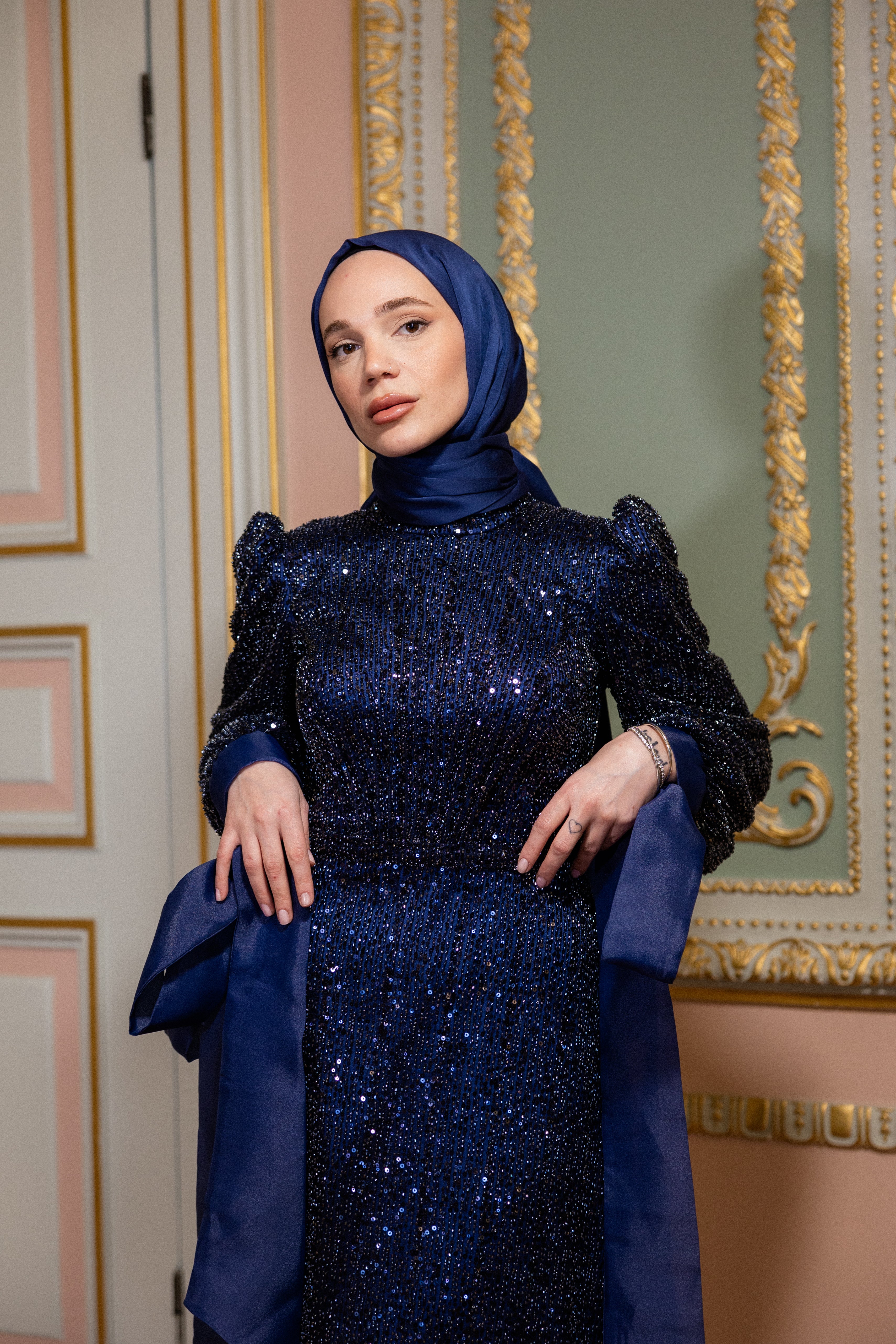 Şık ve zarif olan bu gece mavisi gece elbisesi, simli tül dokusu ve sofistike silüetiyle göz kamaştırıyor. Elbise, hoş yuvarlak yaka, uzun kabarık kollar ve beli vurgulayan geniş saten fiyonk kemerle vurgulanan yumuşak A kesimine sahiptir. Nişan partileri, galalar veya resmi akşamlar gibi özel günlerde ışıltı ve zarafet arayan zarif, başörtülü kadınlar için tasarlanmıştır.