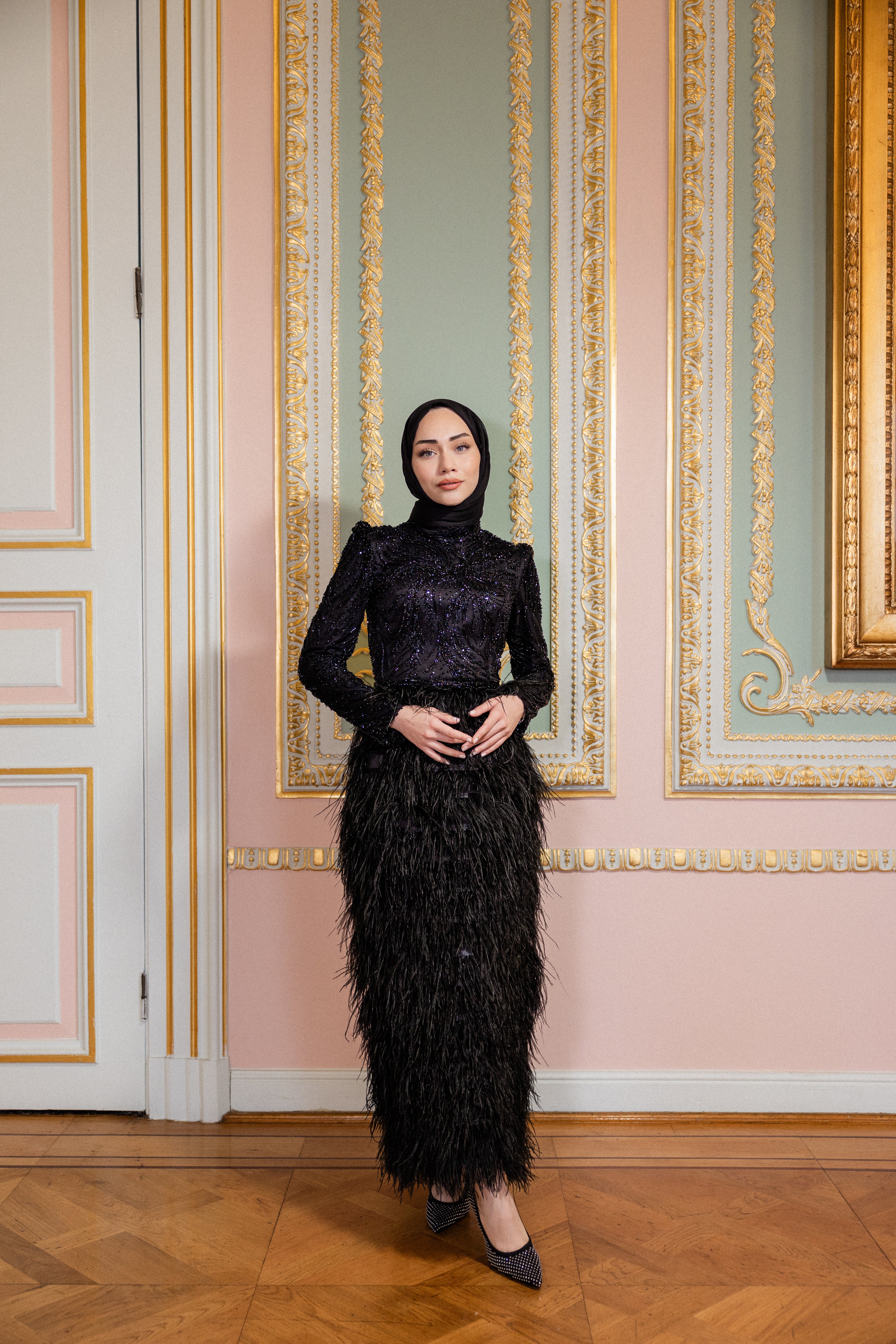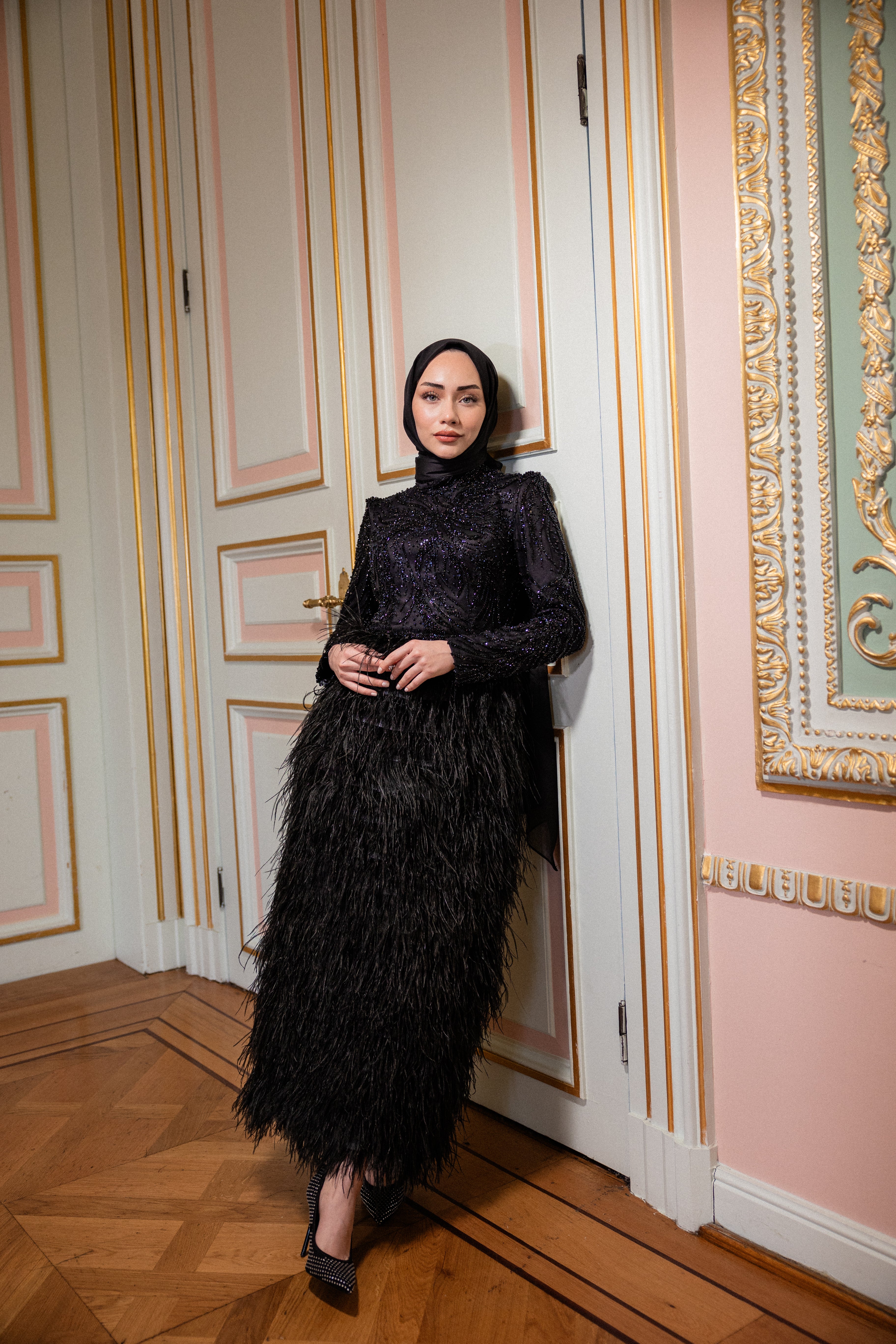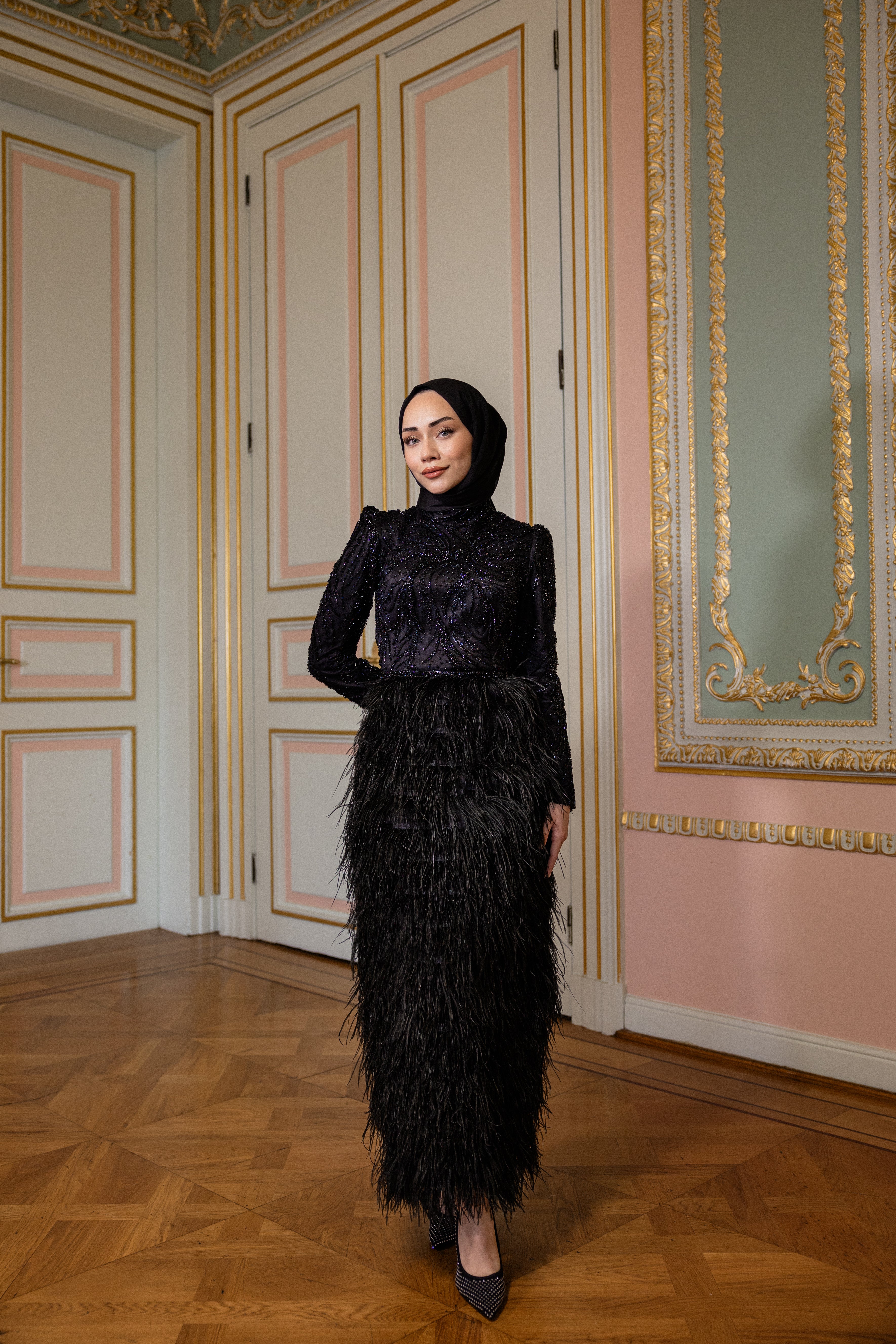 Klasik zarafeti çağdaş bir dokunuşla birleştiren cesur ve modaya uygun bir gece elbisesi. Tamamen payetli dar üst ve iddialı devekuşu tüyüyle süslenmiş kalem etek içeren bu siyah tasarım, çarpıcı bir doku ve hareket yaratır. Yüksek yaka ve uzun kollar mütevazı bir zarafet sunar ve gala geceleri, özel etkinlikler veya özel after partiler için ideal bir seçimdir.