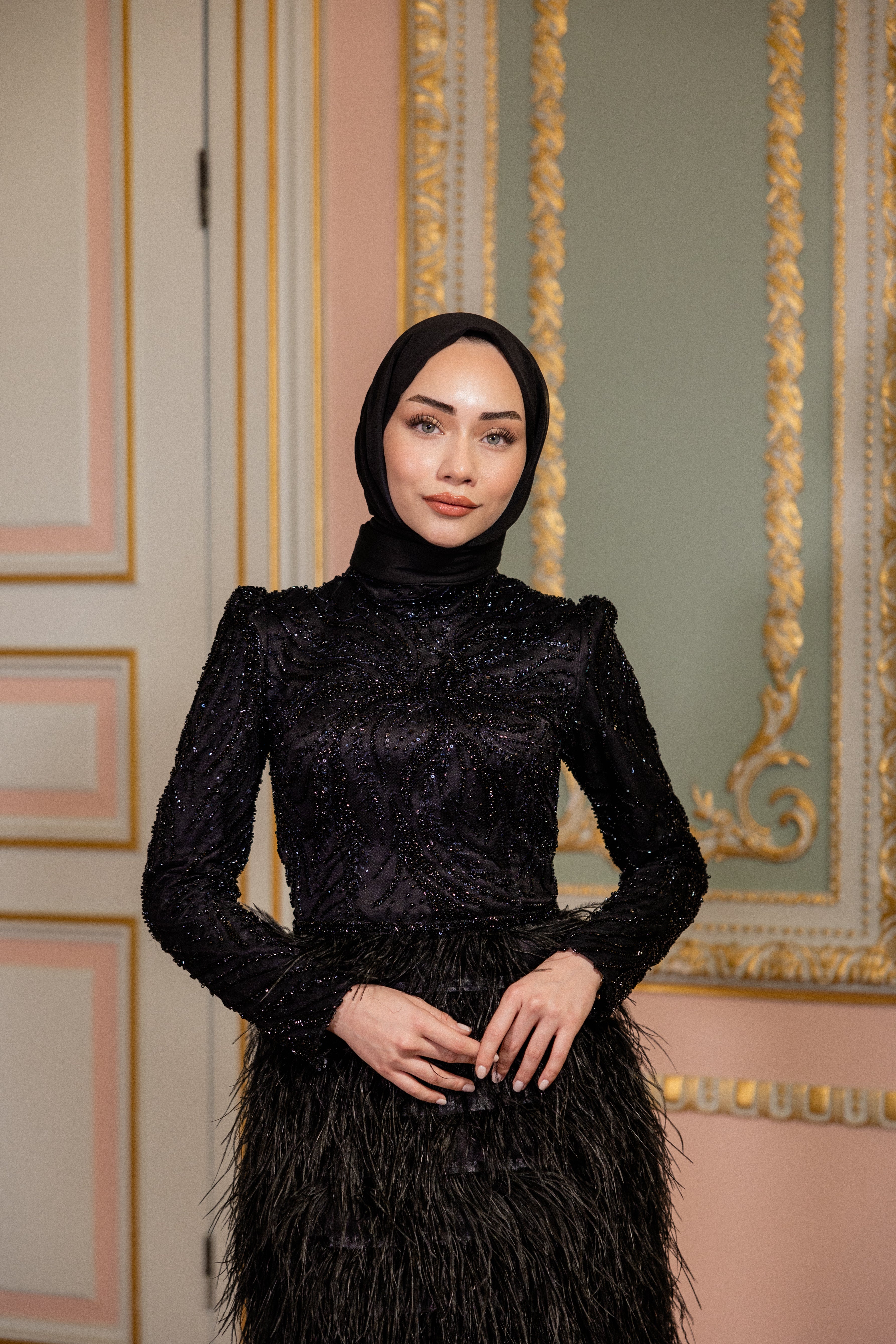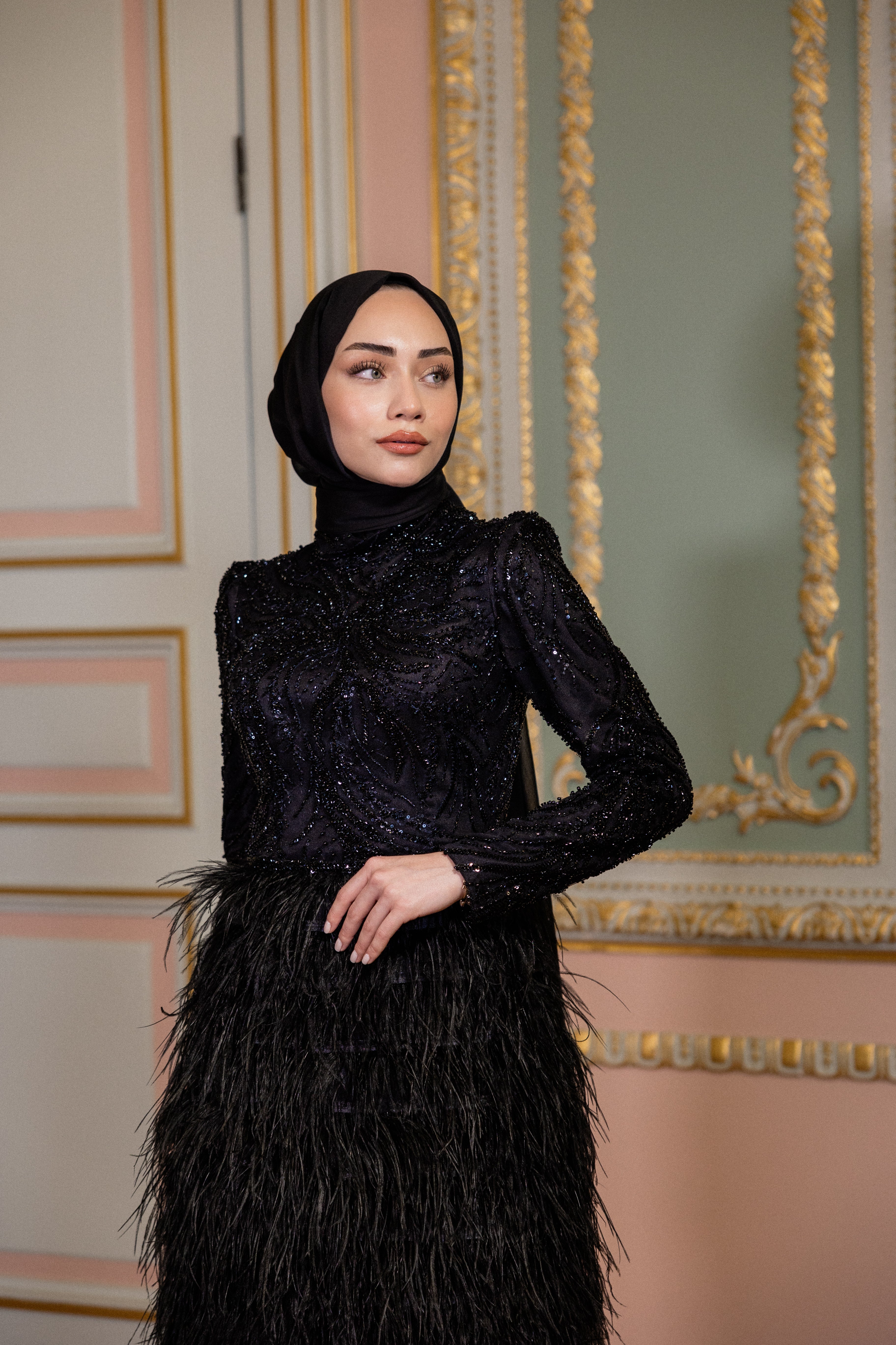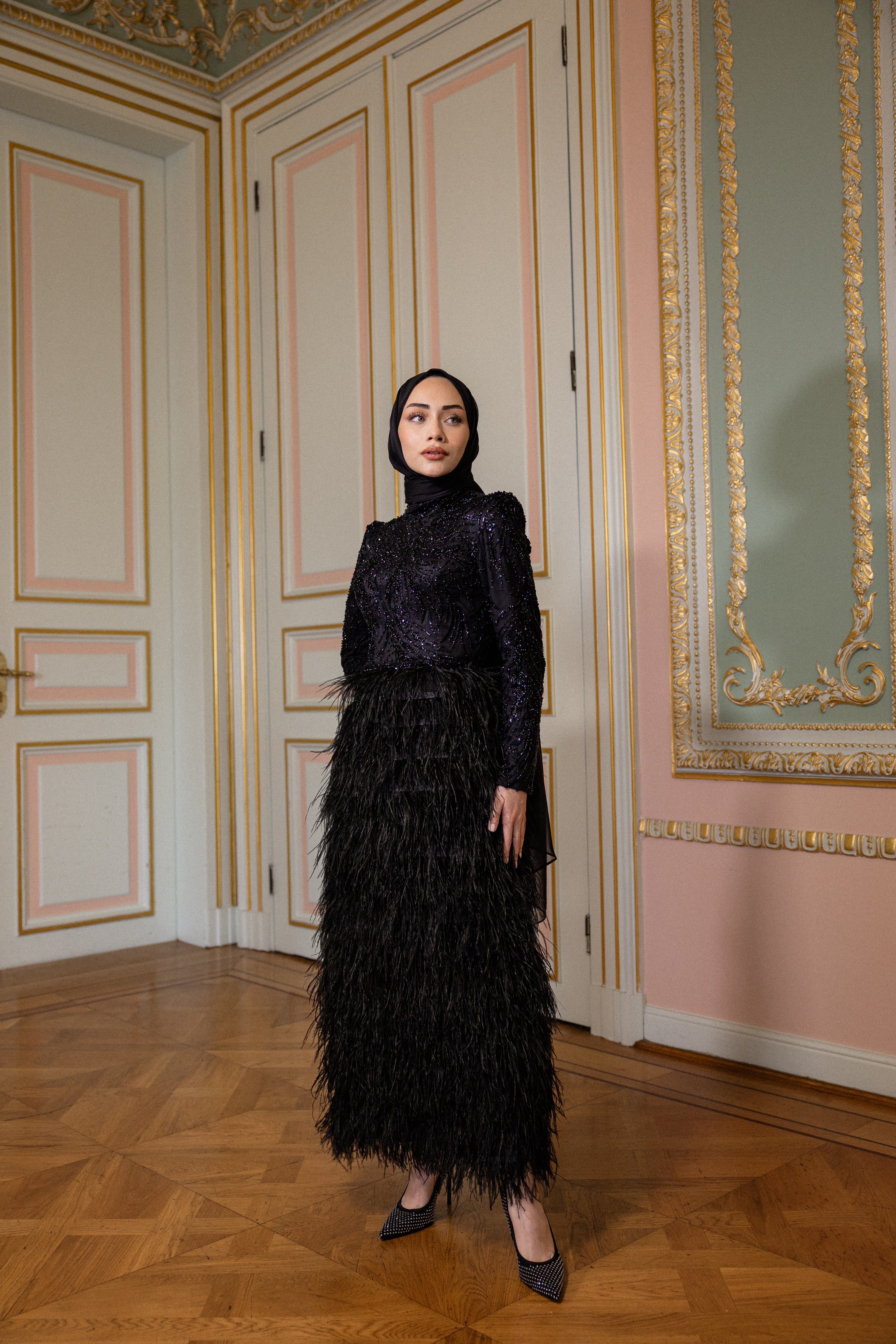 Klasik zarafeti çağdaş bir dokunuşla birleştiren cesur ve modaya uygun bir gece elbisesi. Tamamen payetli dar üst ve iddialı devekuşu tüyüyle süslenmiş kalem etek içeren bu siyah tasarım, çarpıcı bir doku ve hareket yaratır. Yüksek yaka ve uzun kollar mütevazı bir zarafet sunar ve gala geceleri, özel etkinlikler veya özel after partiler için ideal bir seçimdir.