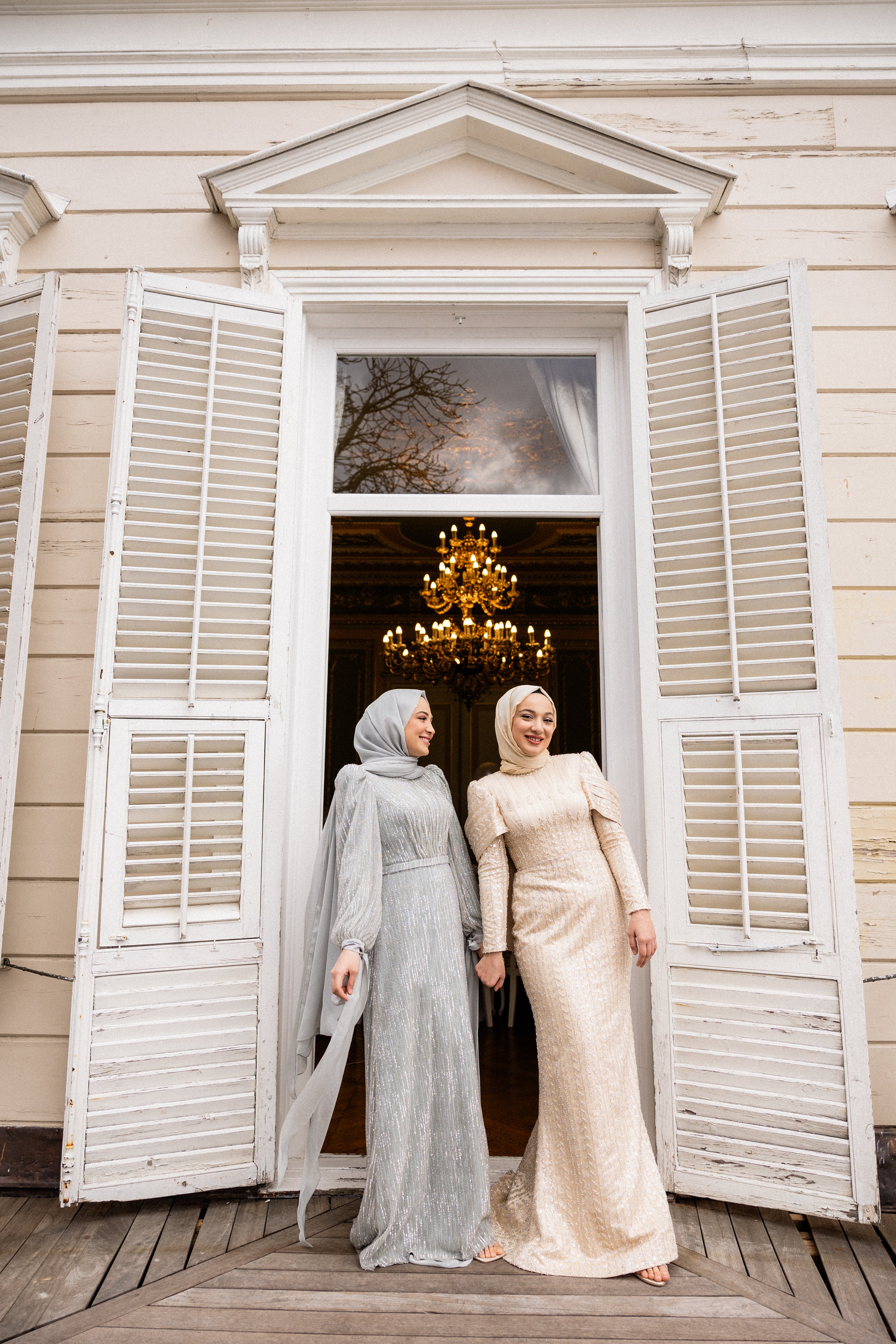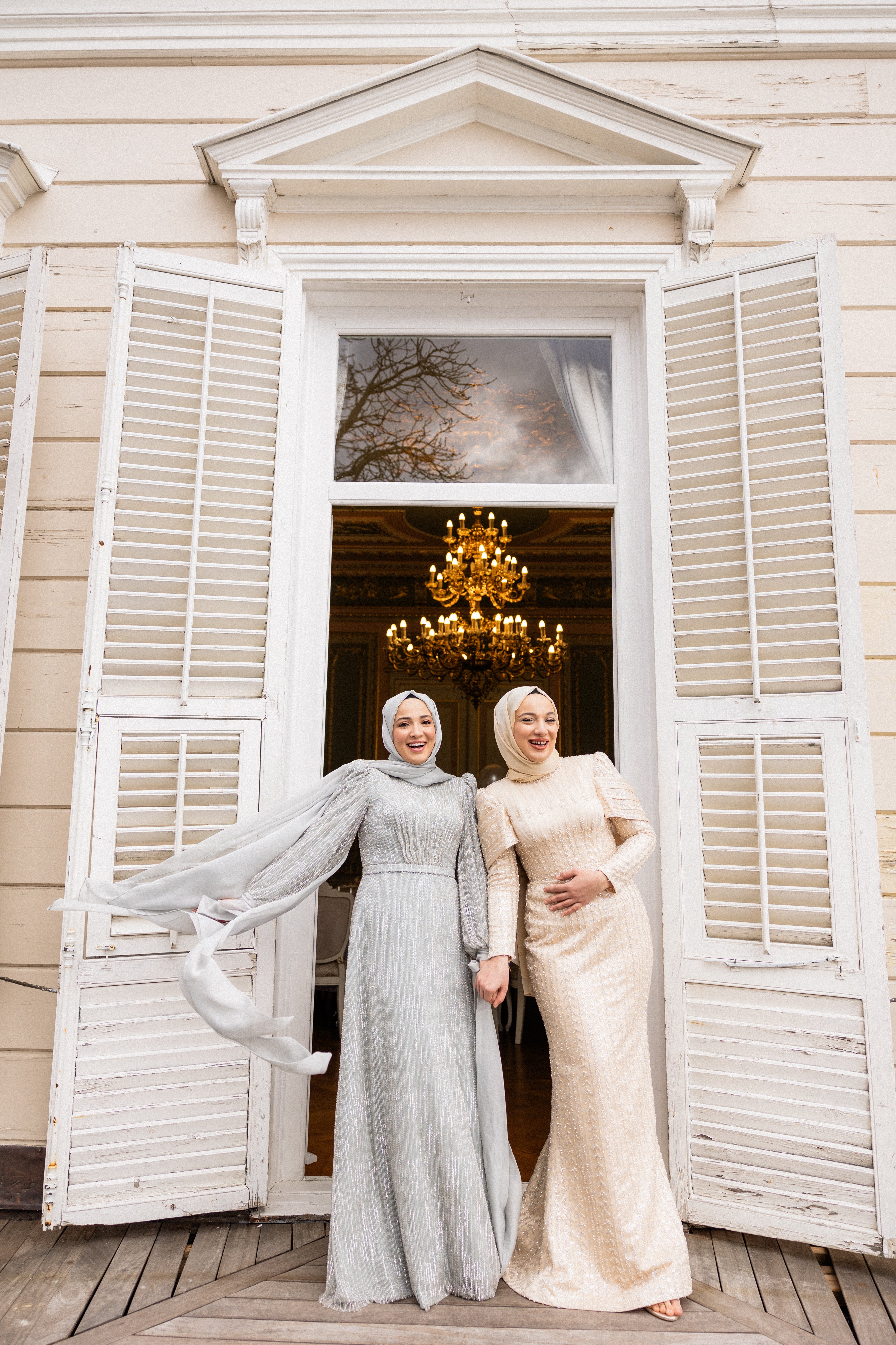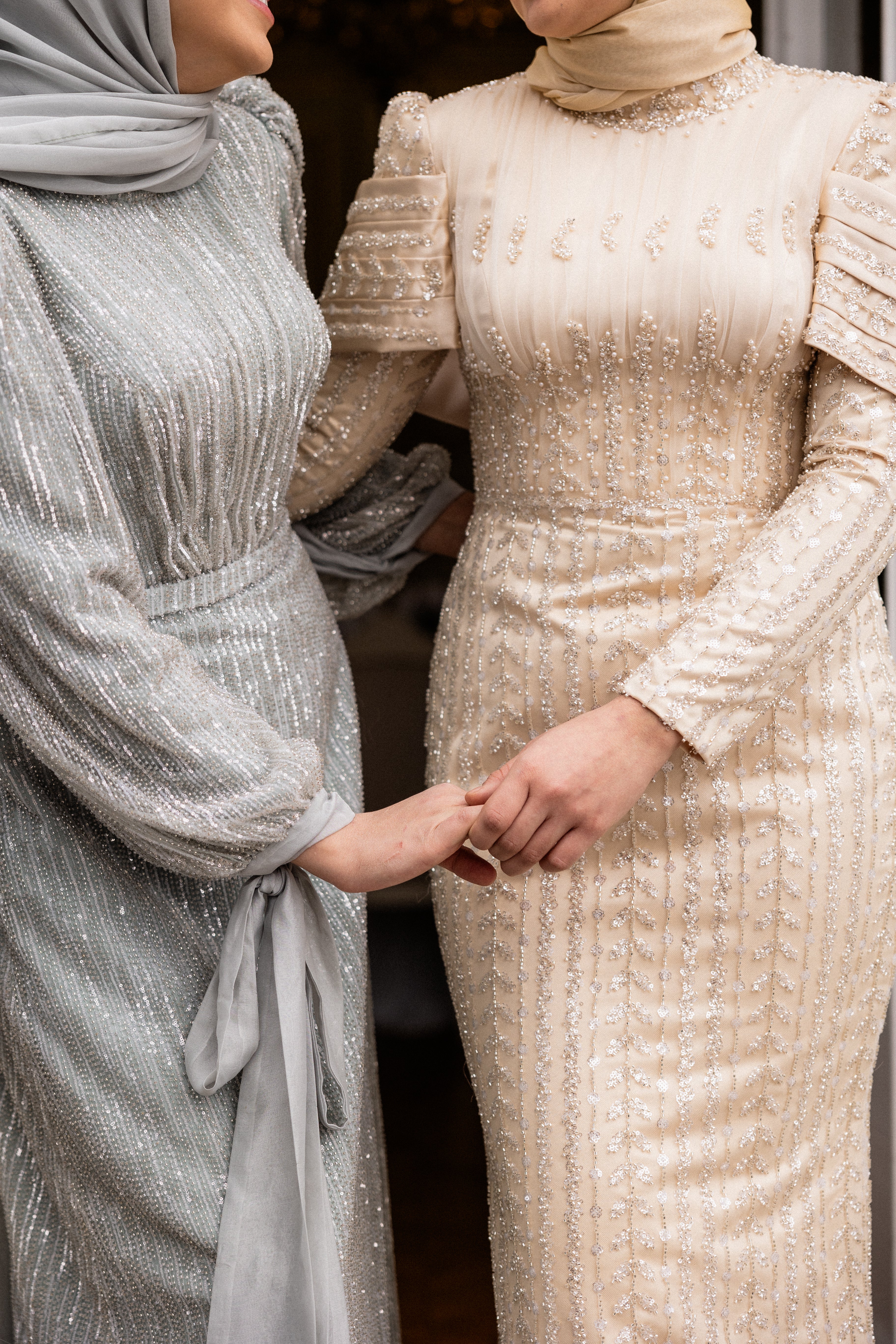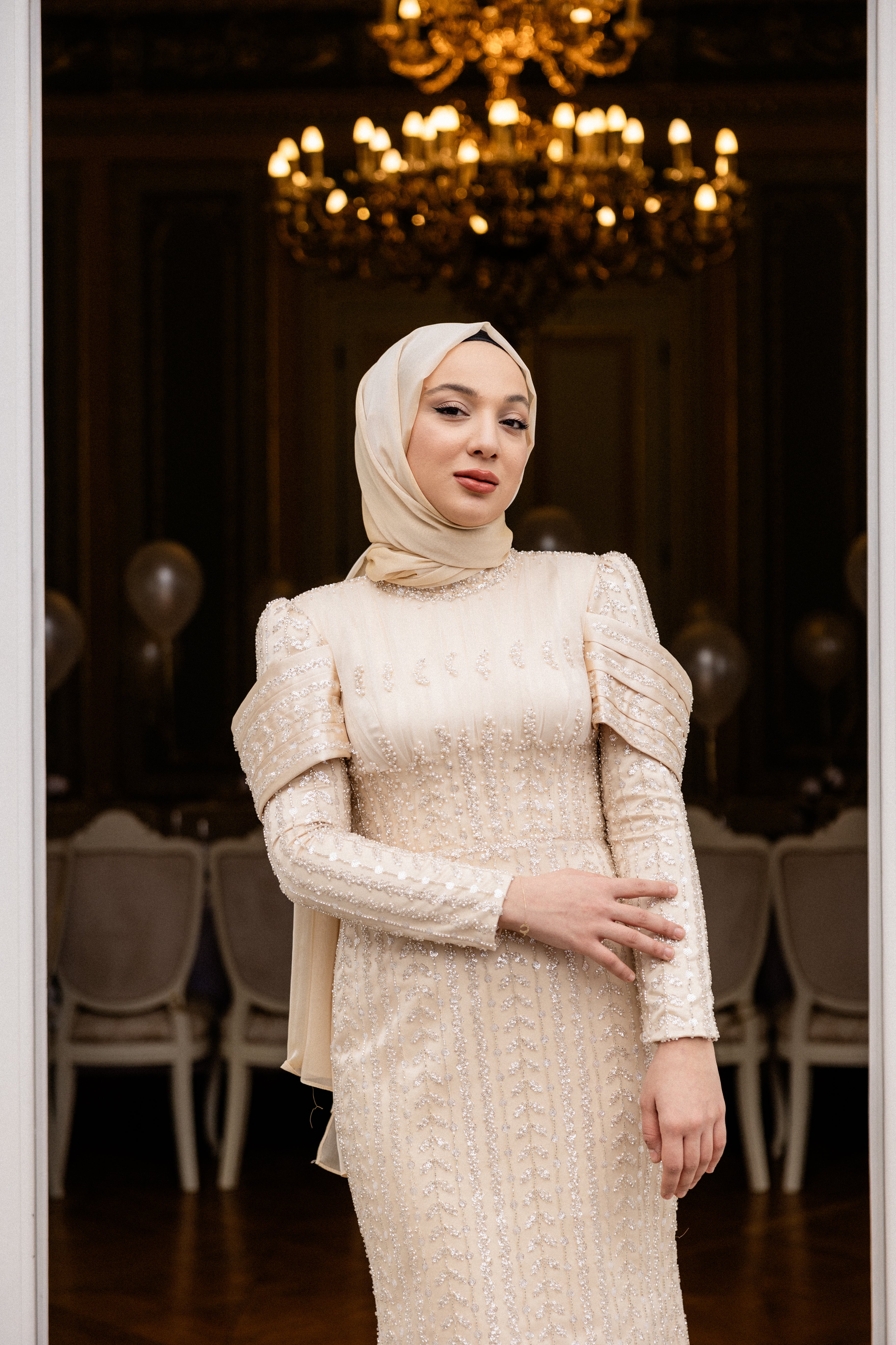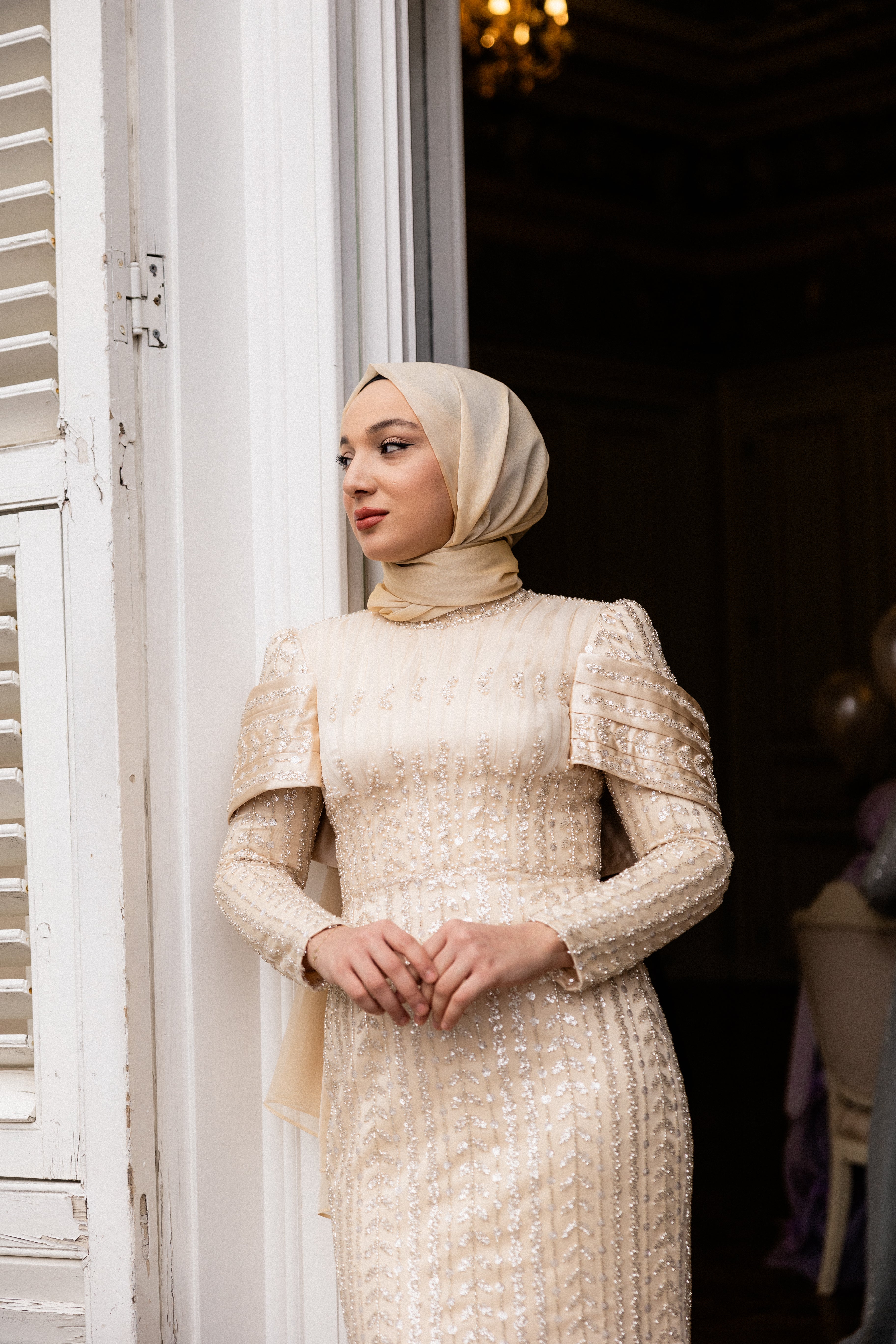 Zarif bir zarafet için tasarlanmış, zamansız şampanya rengi bir gece ve nişan elbisesi. Karmaşık gümüş boncuk işlemeleri ve dikey süslemelere sahip olan bu elbise, zarif yüksek yakası ve uzun kollarıyla öne çıkıyor. Benzersiz katmanlı dökümlü omuz detayı, klasik düz silüete modern bir hava katıyor — nişan partileri, resepsiyonlar veya unutulmaz akşam etkinlikleri için mükemmel bir seçim.