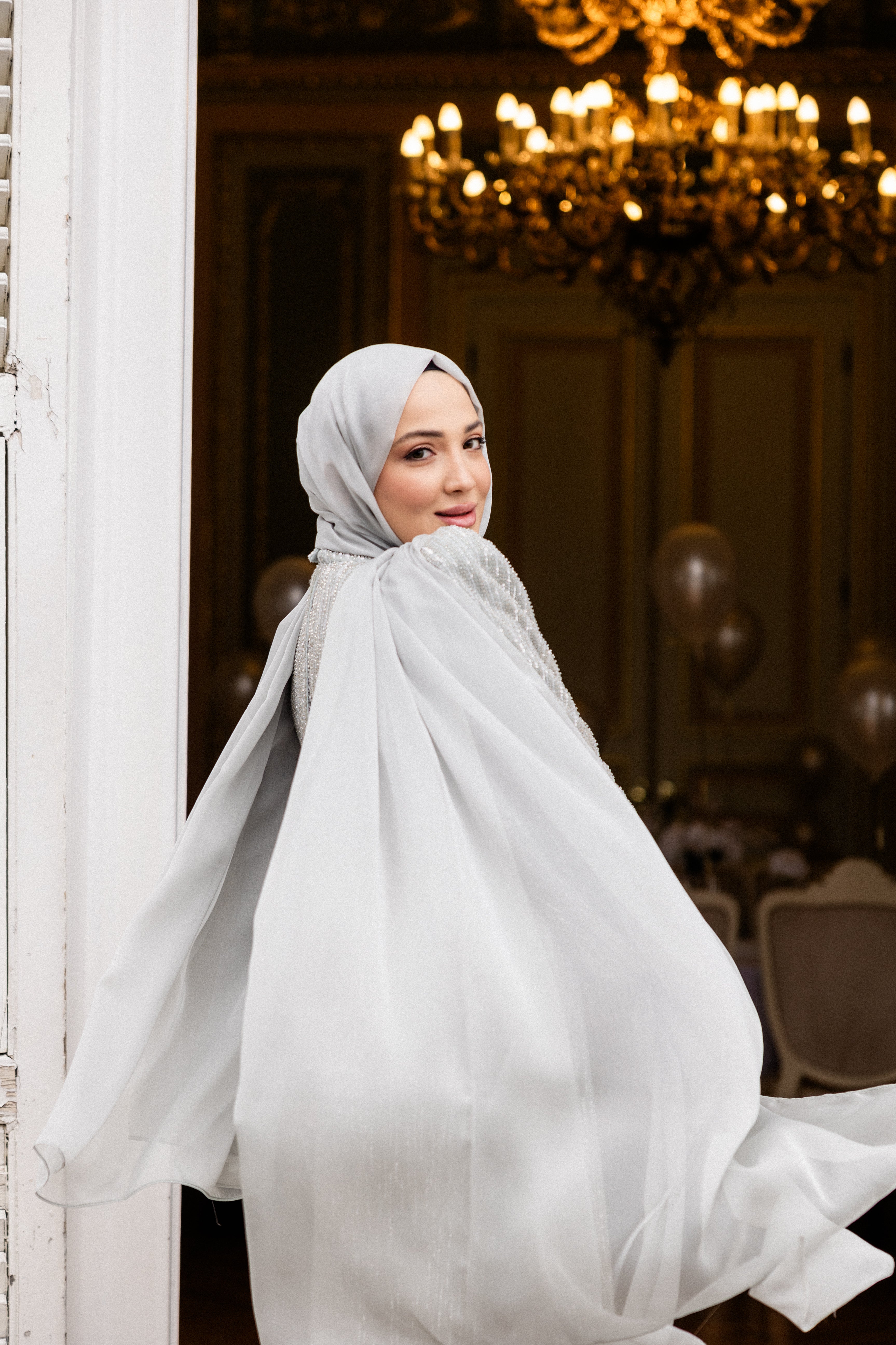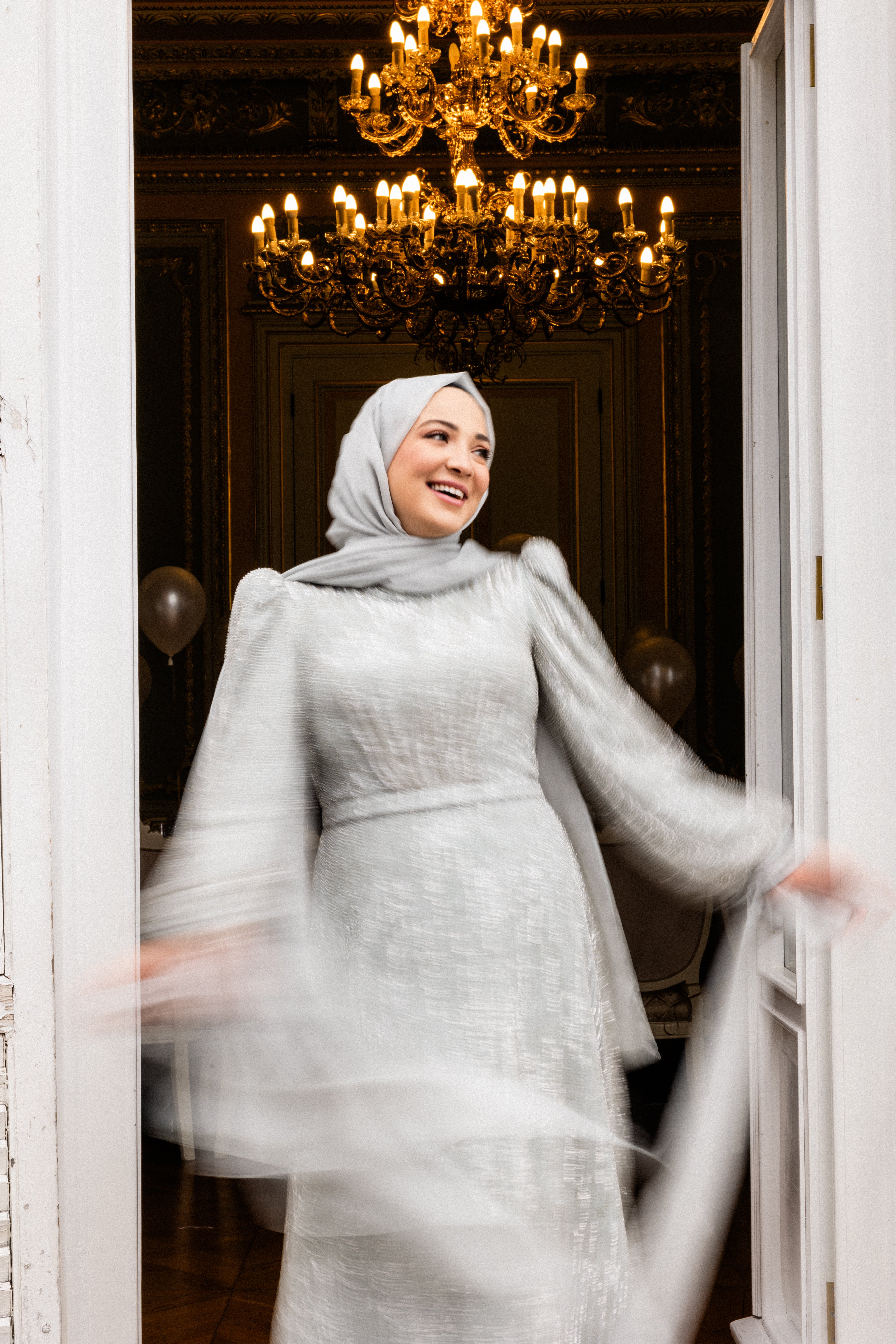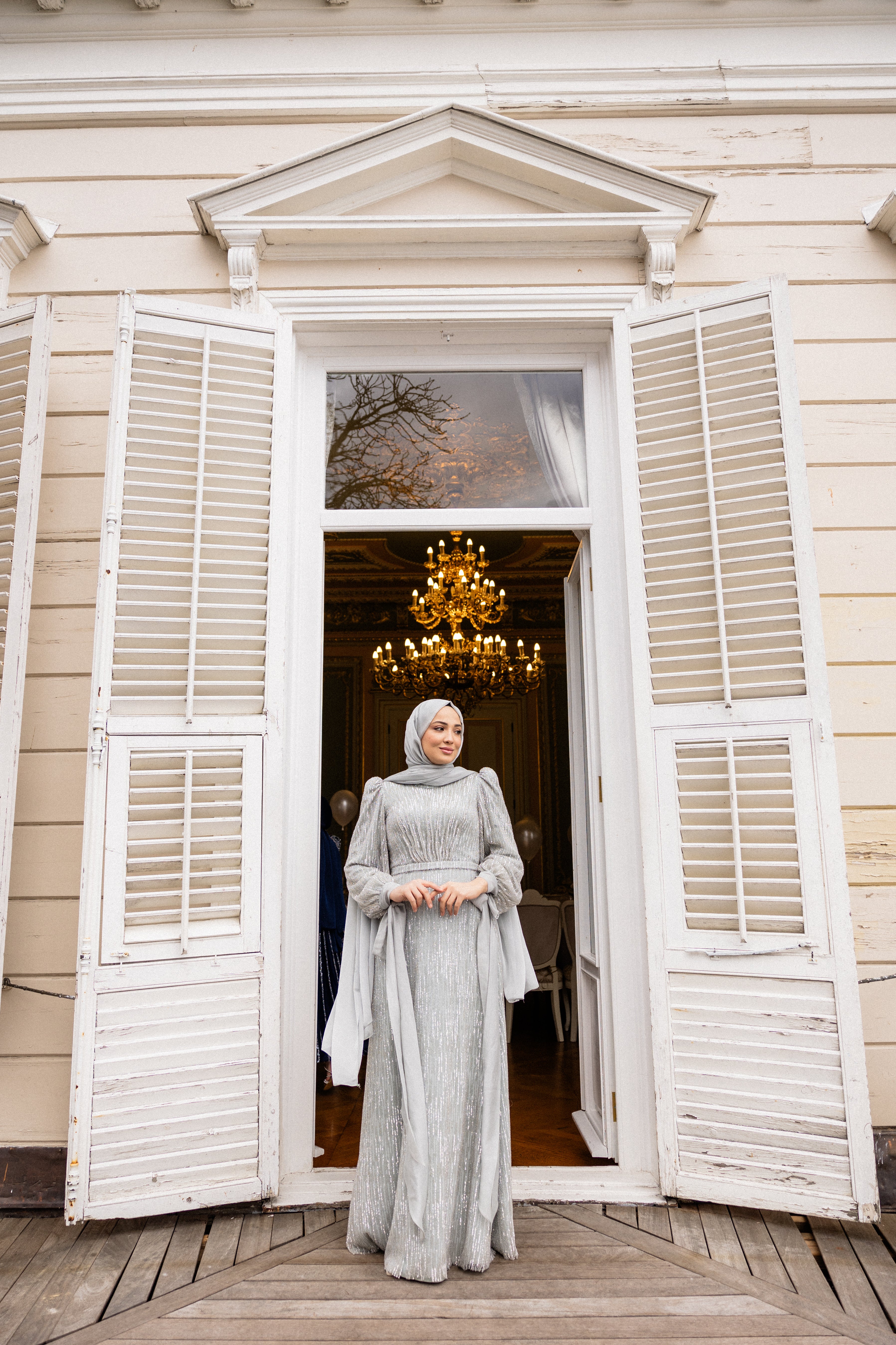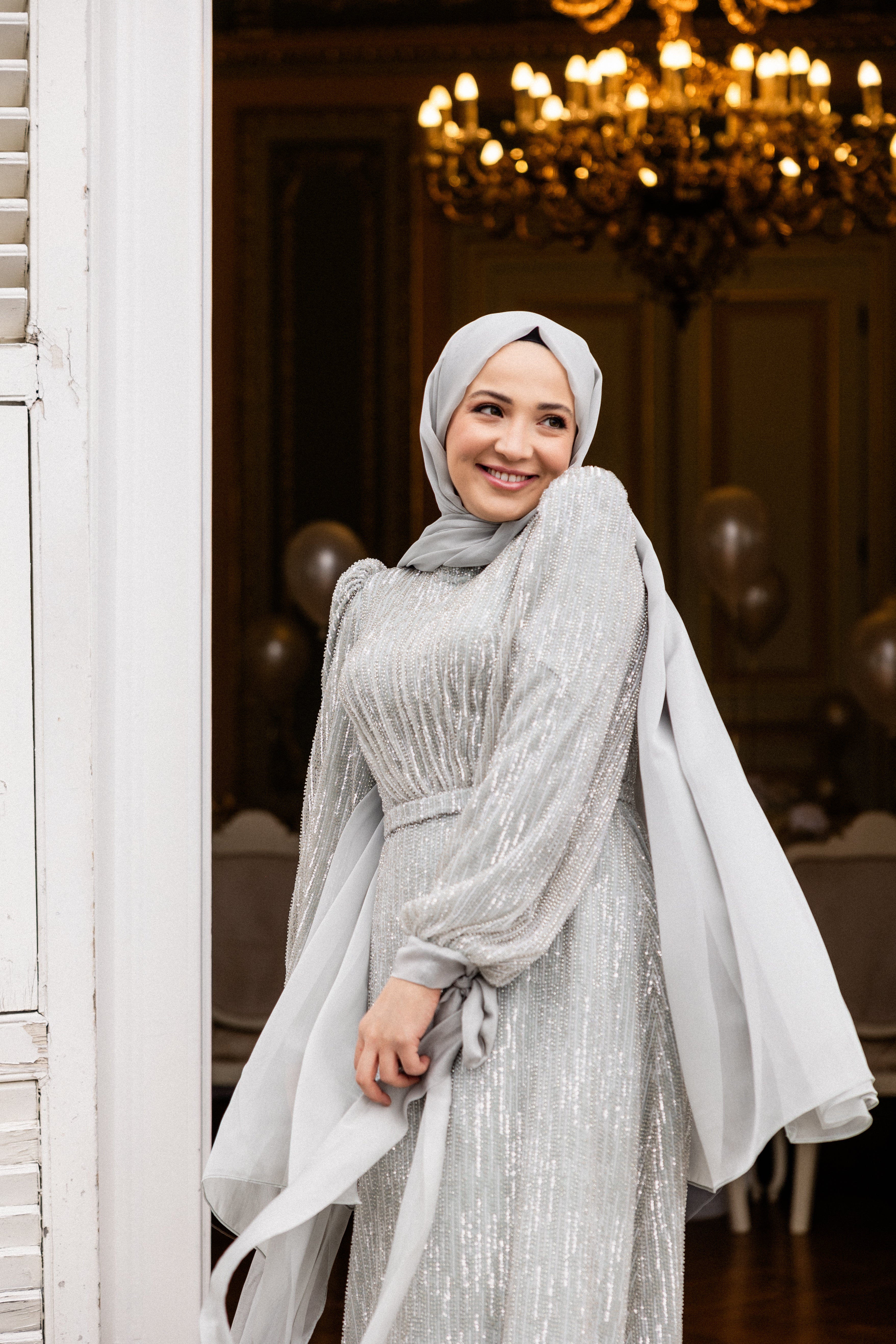 Yumuşak bir zarafet saçan bu gümüş-gri nişan ve gece elbisesi, her hareketle parıldayan narin pul işlemeleriyle öne çıkar. Mütevazı A kesim siluet, belde uyumlu saten kemerle vurgulanırken, kabarık uzun kollar ve yuvarlak yaka zarif bir dokunuş katar. Uyumlu bir başörtüsüyle tamamlanan bu elbise, zamansız çekiciliğin modern ışıltıyla buluştuğu nişan törenleri, resepsiyonlar veya zarif akşam etkinlikleri için idealdir.