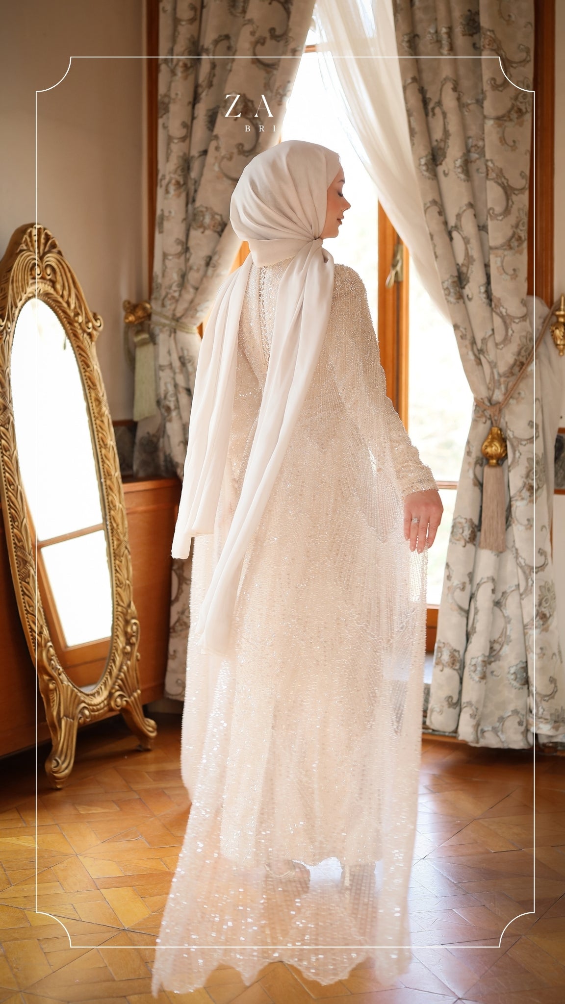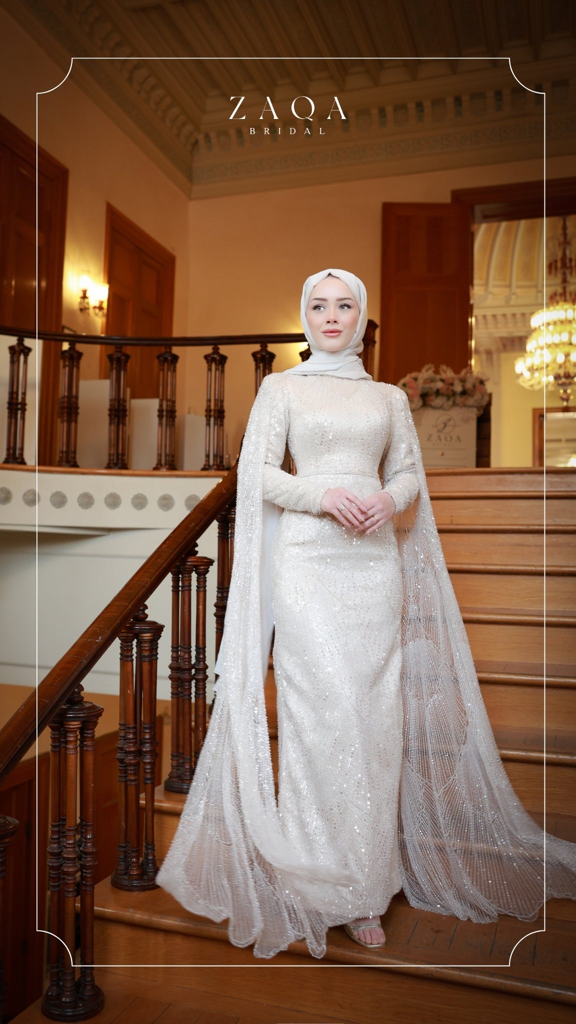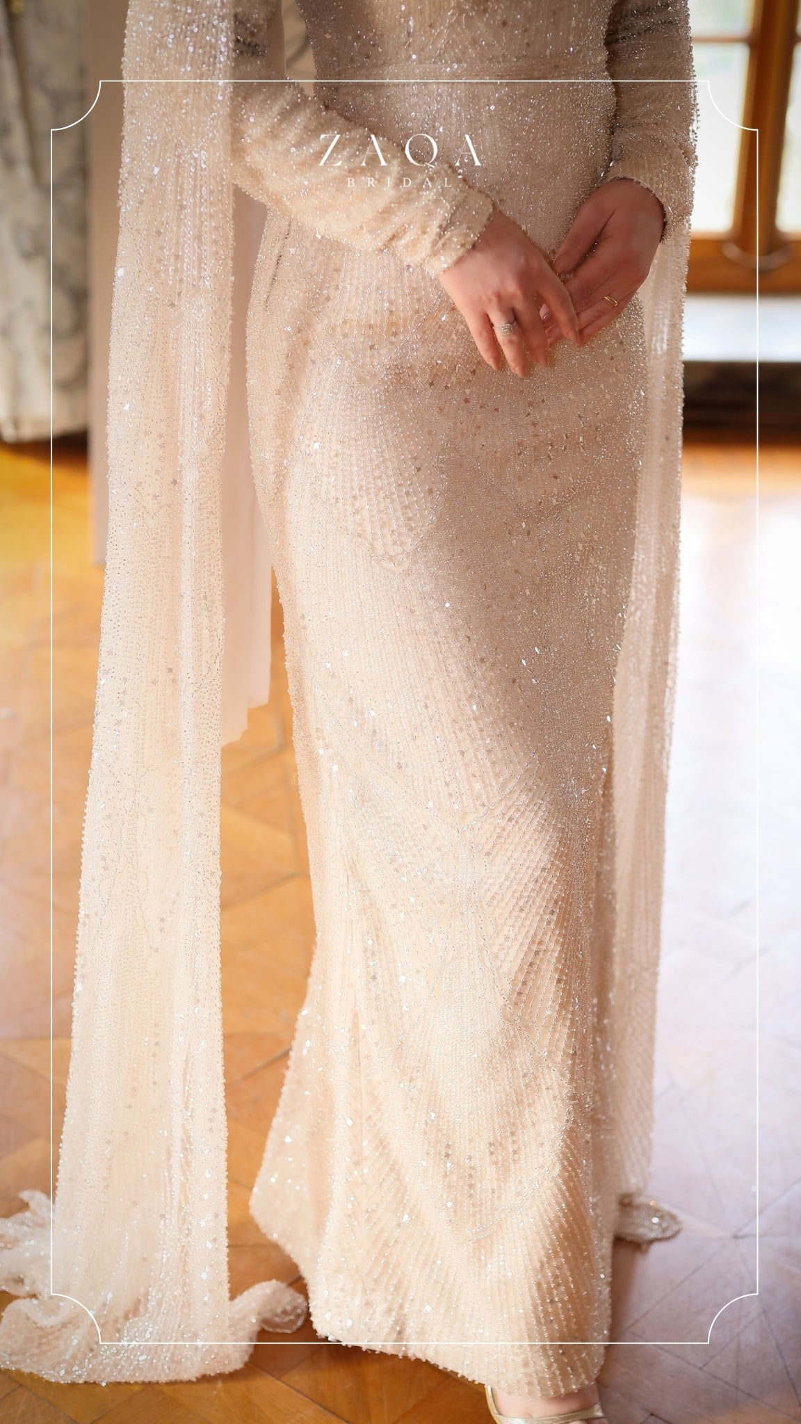 Her adımda zarafetle süzülen bir ihtişam — “Yaren” elbisesi, ışıltı ve zarafetin şiirsel buluşmasını yansıtıyor. Sade ve şık silueti, parıltılı payet detaylarıyla zenginleşirken, akışkan yapılı dramatik pelerin kolları büyüleyici bir hareket kazandırıyor. Etkileyici bir iz bırakmak isteyen gelinler için tasarlanmış asil ve şiirsel bir duruş.