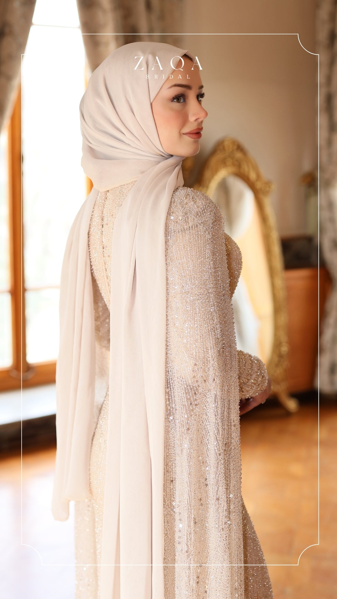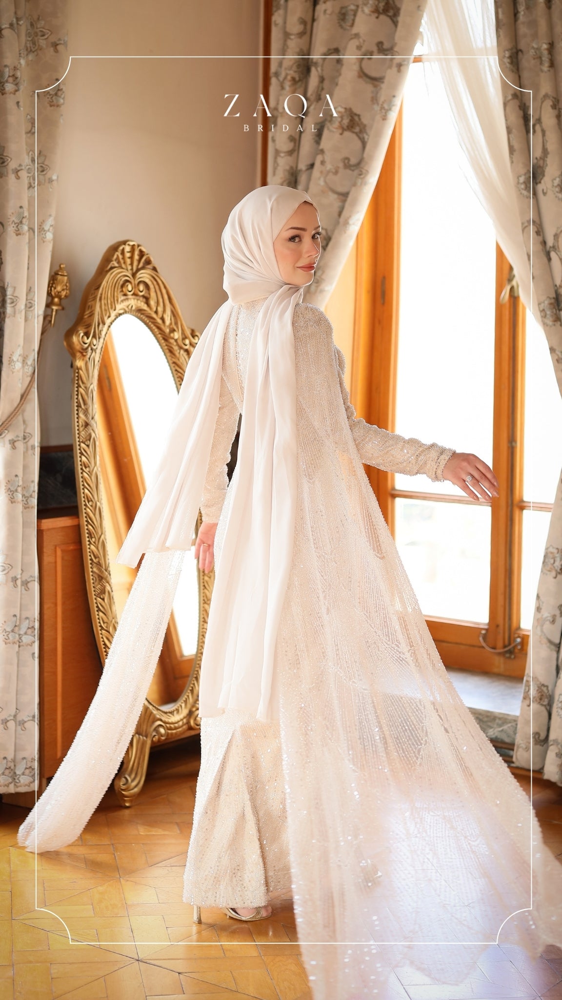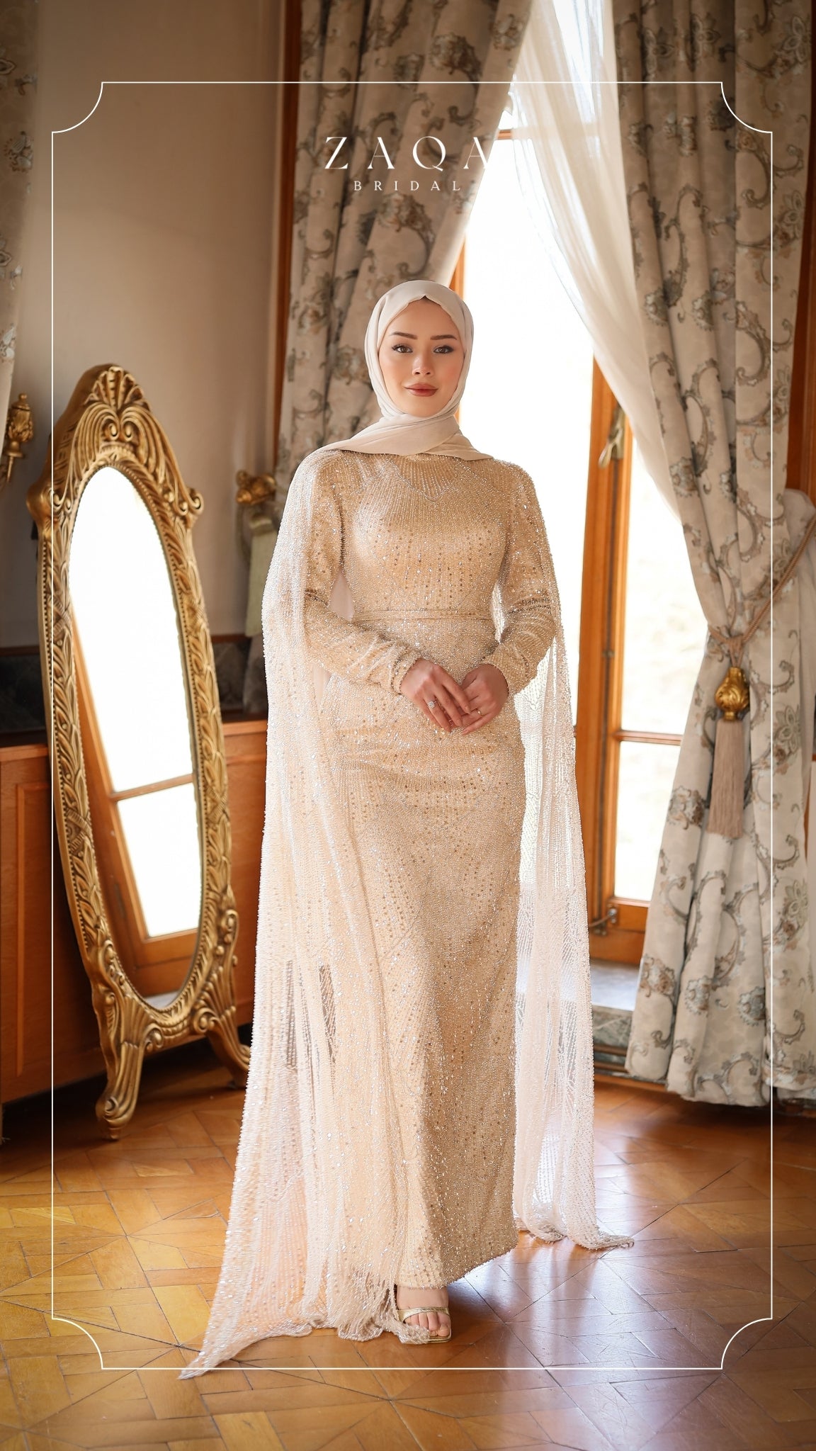 Her adımda zarafetle süzülen bir ihtişam — “Yaren” elbisesi, ışıltı ve zarafetin şiirsel buluşmasını yansıtıyor. Sade ve şık silueti, parıltılı payet detaylarıyla zenginleşirken, akışkan yapılı dramatik pelerin kolları büyüleyici bir hareket kazandırıyor. Etkileyici bir iz bırakmak isteyen gelinler için tasarlanmış asil ve şiirsel bir duruş.